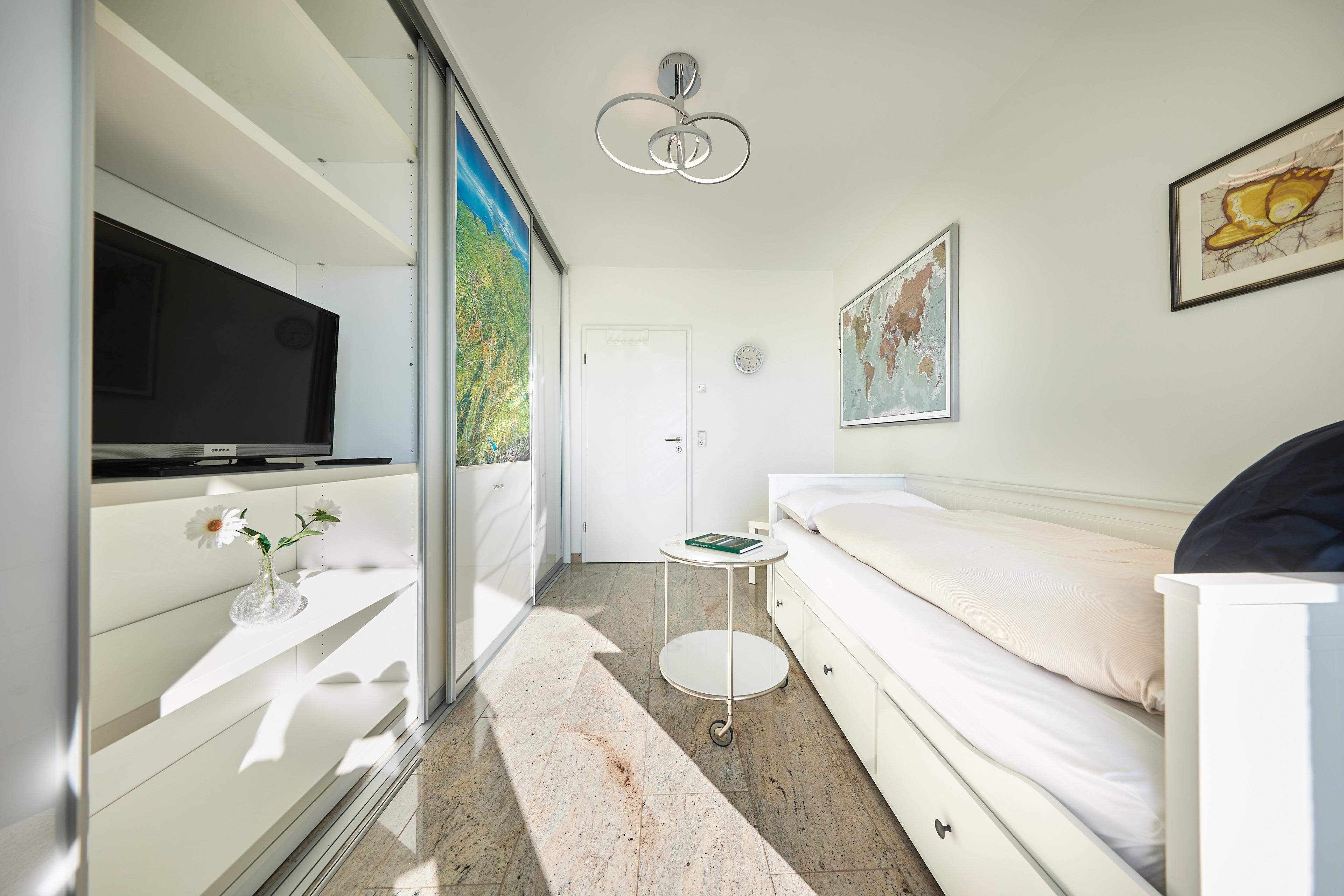Das Appartement verfügt über zwei geschmackvoll eingerichtete Schlafbereiche. Der Hauptschlafbereich mit direktem Zugang zum Balkon bietet ein großzügiges Ankleidezimmer mit viel Stauraum und ein modernes Masterbad mit Dusche, die mit einem klappbaren Duschsitz ausgestattet ist, sowie ein WC – perfekt für einen längeren Aufenthalt. Das zweite Schlafzimmer ist ideal für Kinder oder weitere Gäste. Es ist mit einem Hemnes-Ausziehbett ausgestattet, das sich von 80x200 cm auf 160x200 cm erweitern lässt. Auch steht Ihnen hier genügend Staufläche und ein TV zur Verfügung.