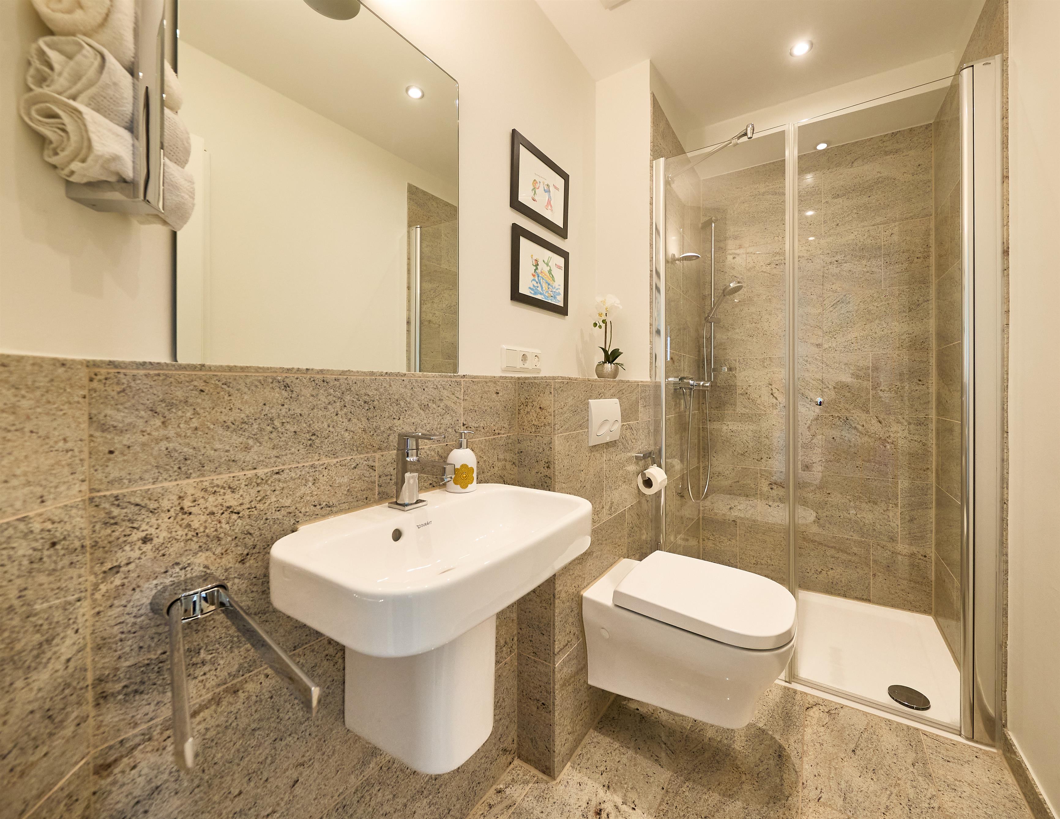 Direkt gegenüber dem 2. Schlafbereich, vom Flur aus begehbar befindet sich das 2. moderne Duschbad mit WC, auch als Gäste-WC zu nutzen.