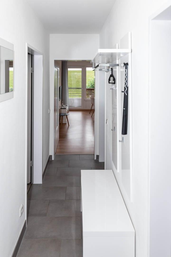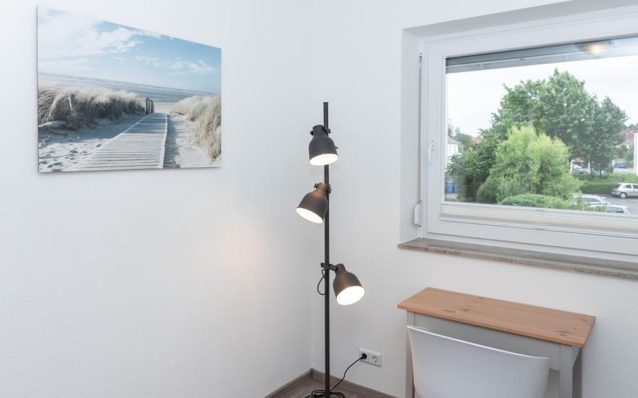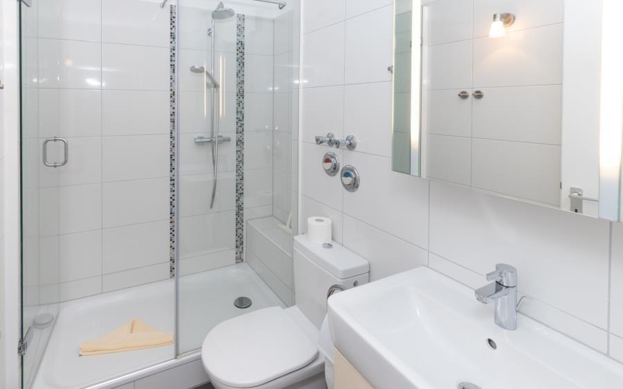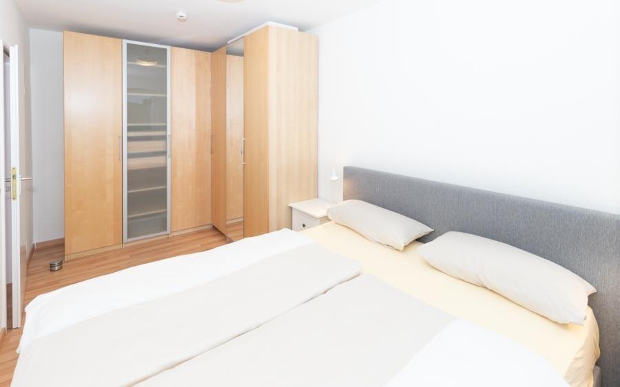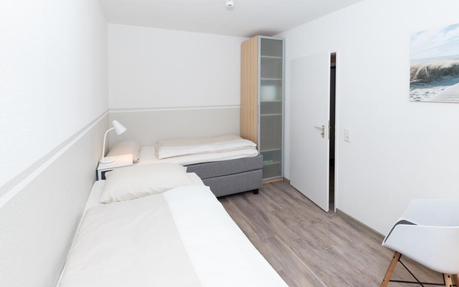 Die beiden Schlafbereiche sind jeweils mit Ablagemöglichkeiten zum hängen und legen eingerichtet und die bequemen Boxspringbetten, in beiden Schlafbereichen, werten den Komfort dieser Wohnung auf. Der 2. Schlafbereich hat auch einen kleinen Schreibtisch, wo Sie einen Urlaubsgruß schreiben oder auch ein wenig Homeoffice machen können. Das hellgeflieste Duschbad mit WC mit Ablagen erreichen Sie direkt vom Flur aus. Hier befindet sich auch ein Schuhschrank und die Garderobe.
