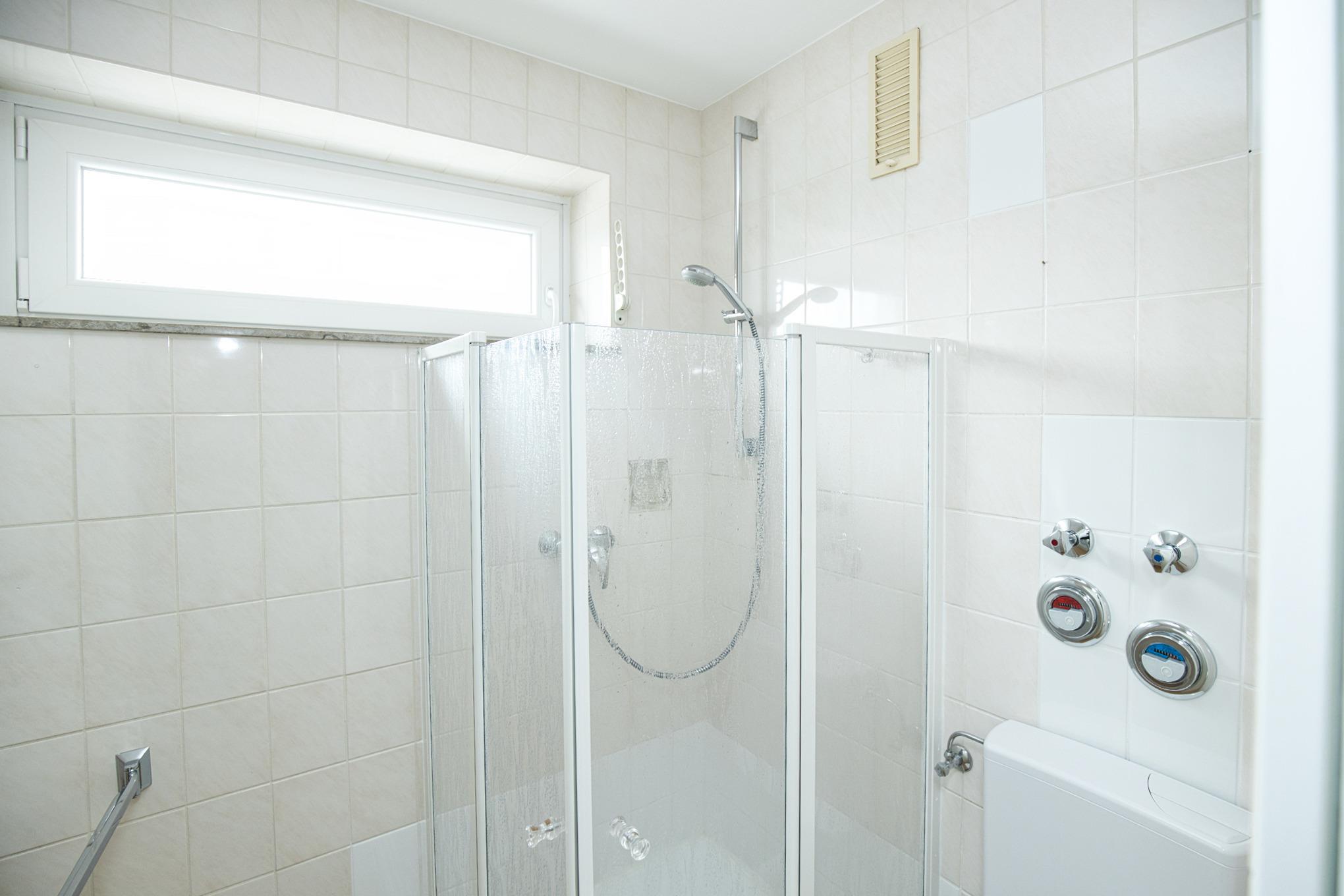 Der angrenzende Schlafbereich ist mit einem Kleiderschrank und einem Doppelbett eingerichtet. Die Verdunklung der Fenster ist gegeben. Das Badezimmer ist mit Dusche und Fenster, WC, sowie einem Spiegelschrank mit Ablagen ausgestattet.