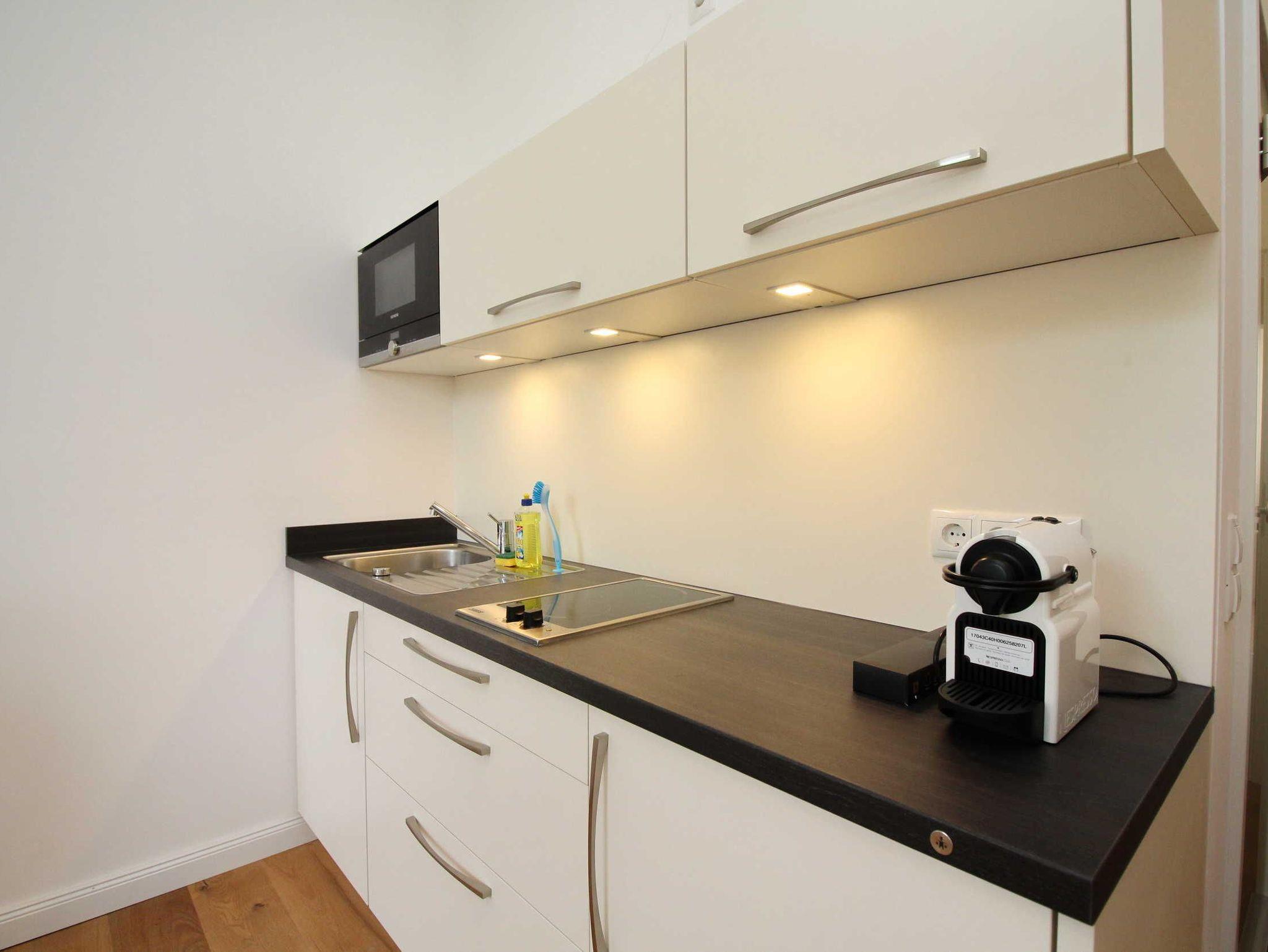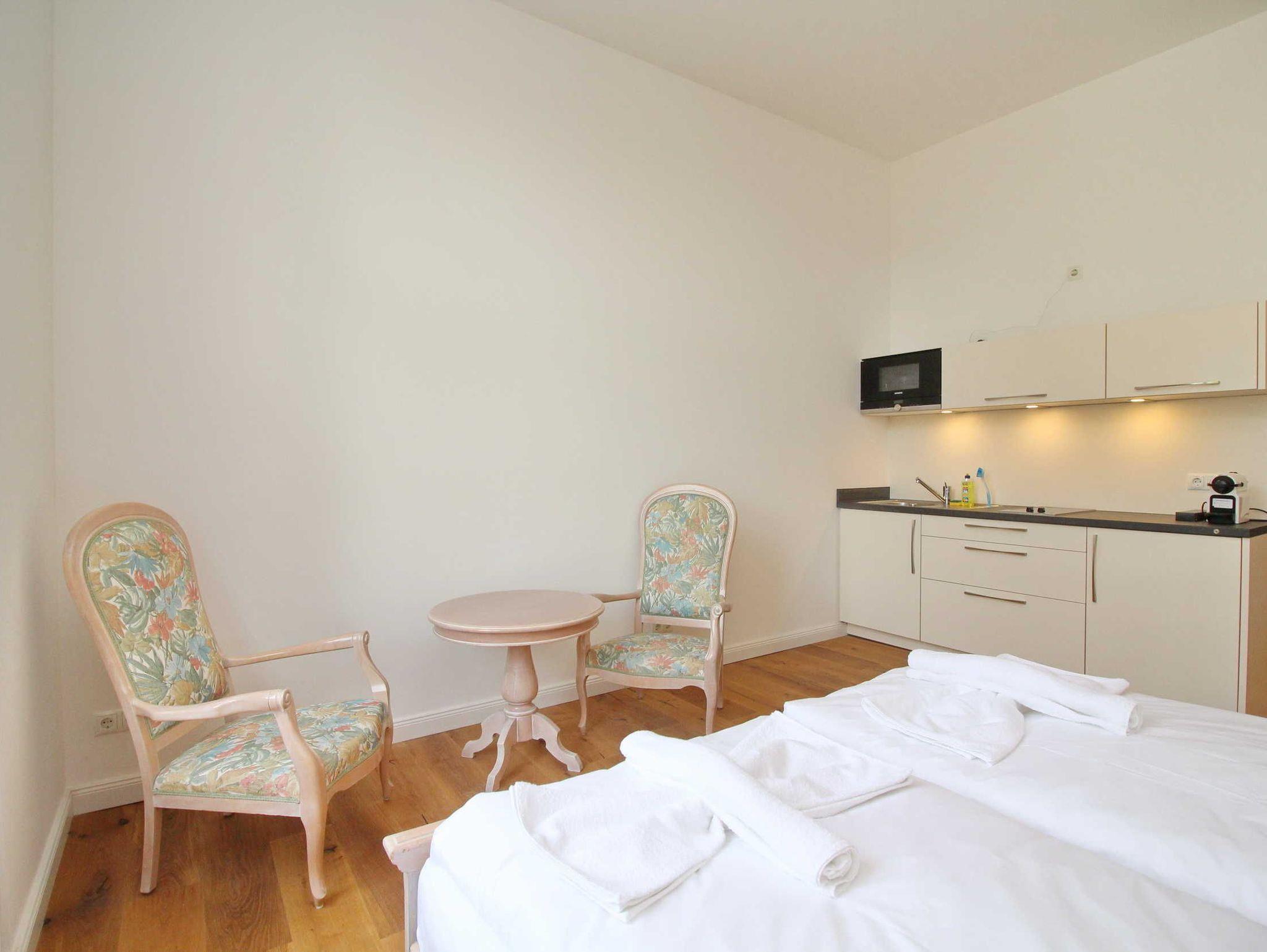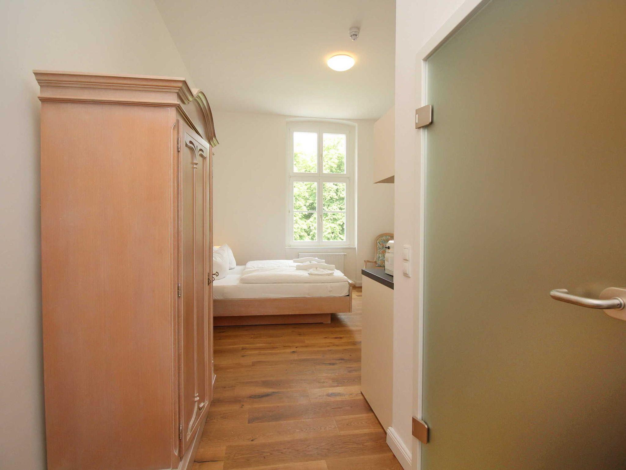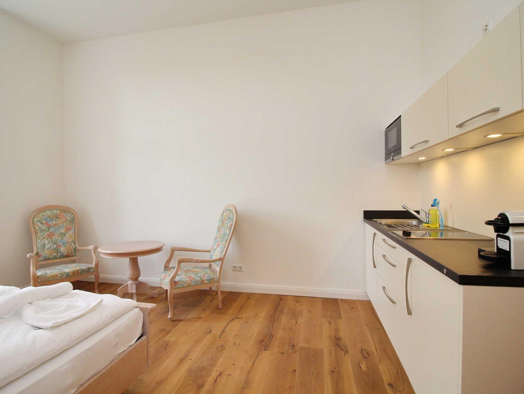 Die Schloss Studios liegen im 1. Stock oder im Dachgeschoss mit Blick in den vorderen oder hinteren Park. Alle Apartments sind mit dem Aufzug zu erreichen. Sie sind modern-minimal oder klassisch ausgestattet und verfügen über eine moderne Küche mit Nespresso Kapselkaffeemaschine und weiteren Küchenutensilien ..