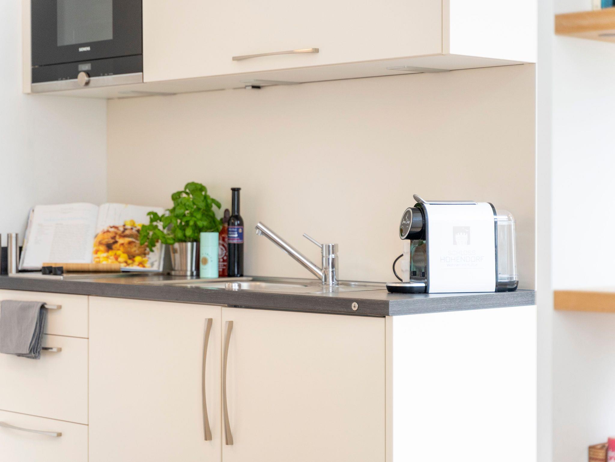 Alle Wohnungen sind ausgestattet mit einer modernen Küchenzeile, einem Kühlschrank und einer Backofen-/Mikrowellen-Kombination. In Anlehnung an das Gesamtkonzept der Kontraste ist das klassische Schloss innen hochmodern eingerichtet. So gibt es auch für Feriengäste sowohl modern, als auch klassisch ausgestattete Apartments.