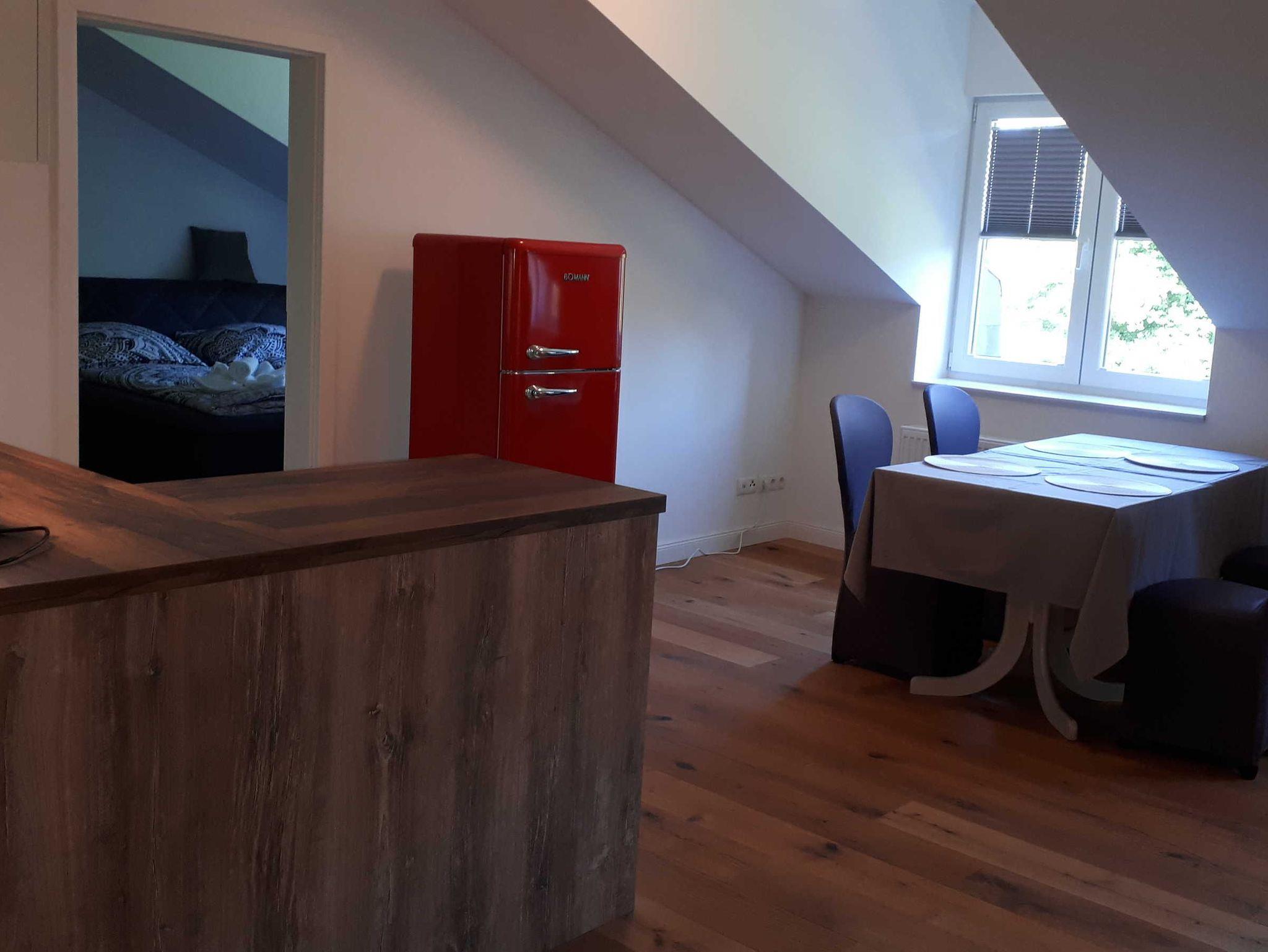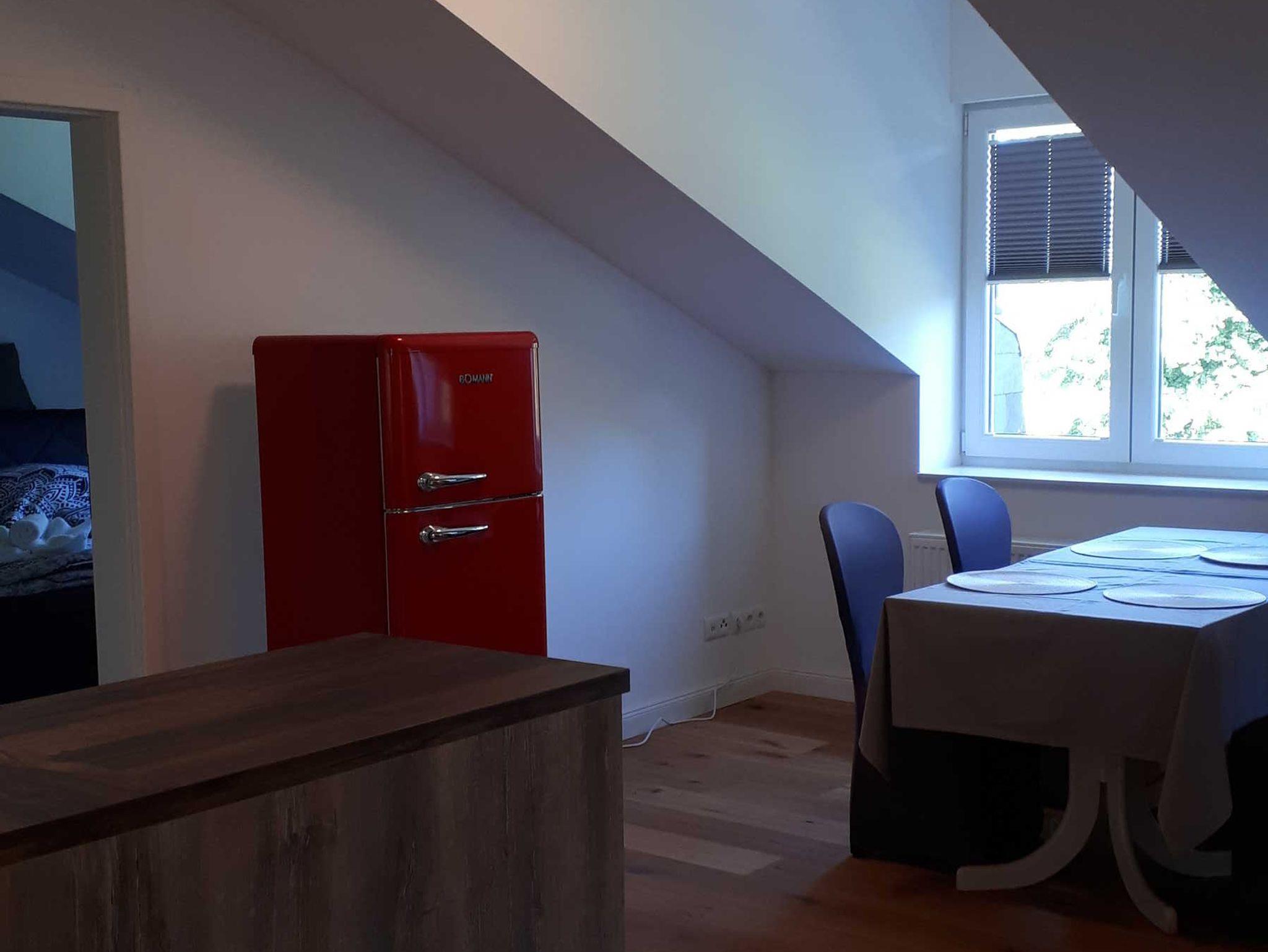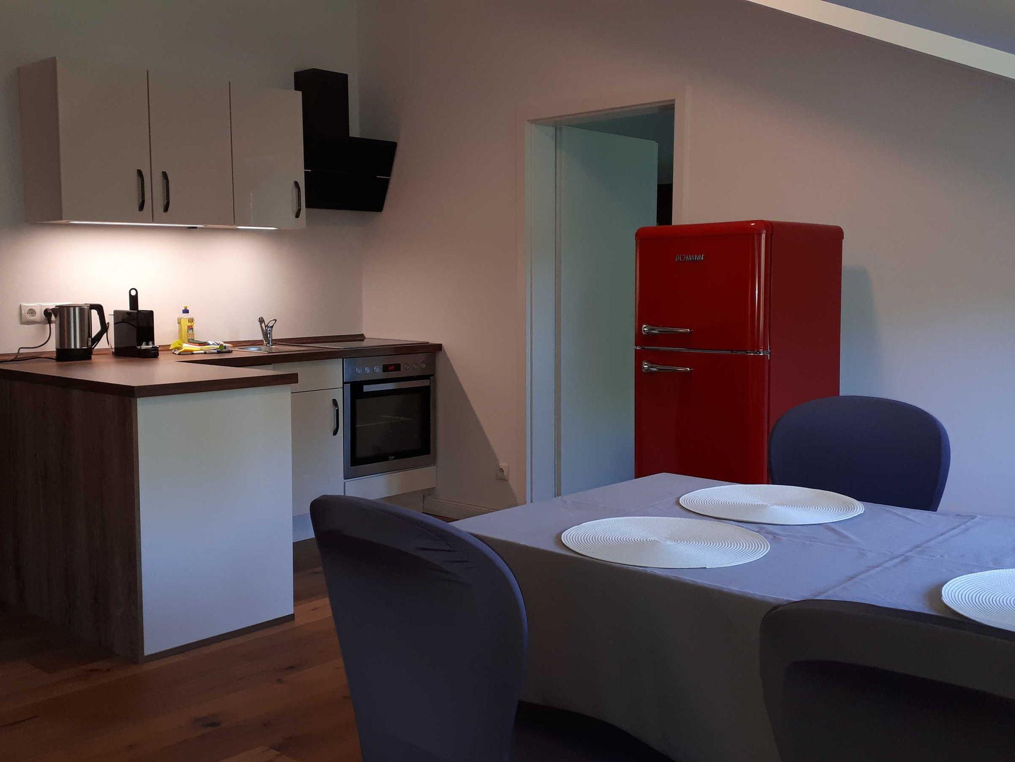 Alle Wohnungen sind ausgestattet mit einer modernen Küchenzeile, einem Kühlschrank und einer Backofen-/Mikrowellen-Kombination. In Anlehnung an das Gesamtkonzept der Kontraste ist das klassische Schloss innen hochmodern eingerichtet. So gibt es auch für Feriengäste sowohl modern, als auch klassisch ausgestattete Apartments.
