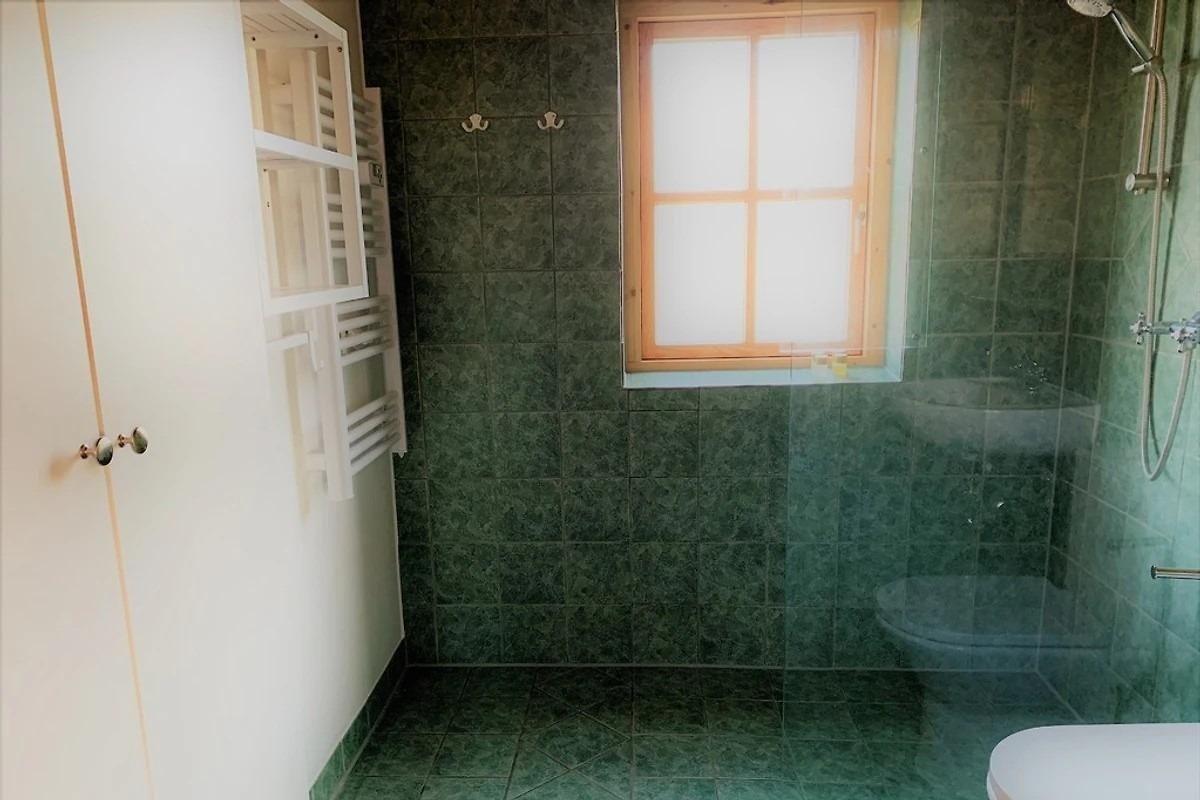 Im Badezimmer gibt es eine Fußboden- und Wandheizung. Warmes Wasser wird per Durchlauferhitzer erzeugt.