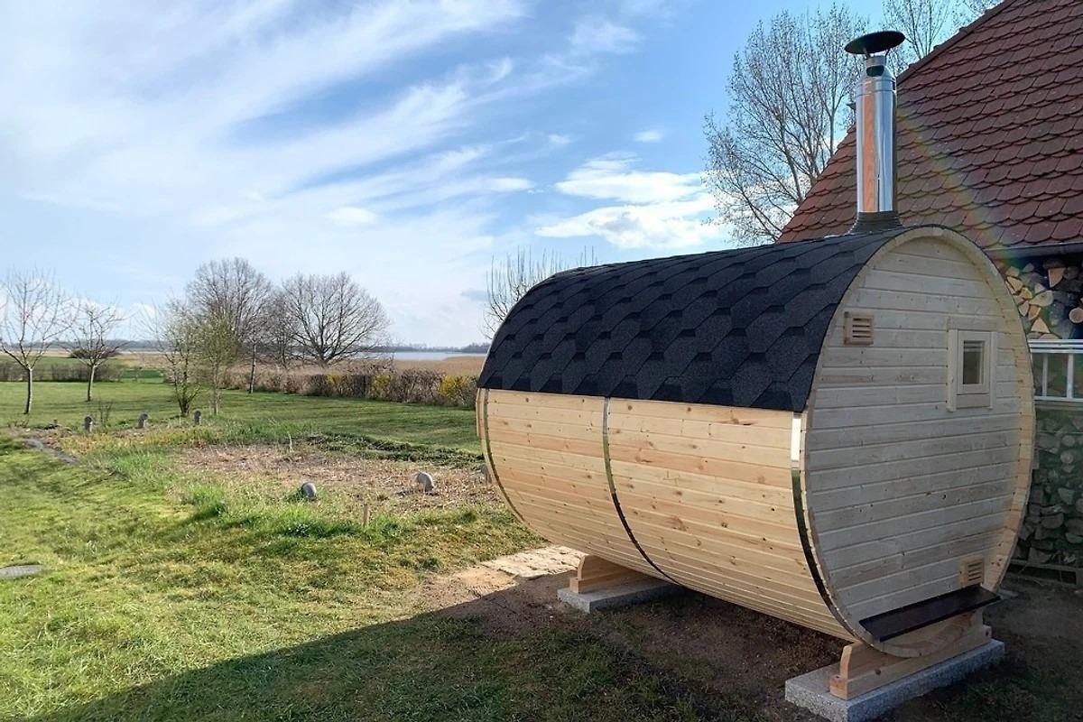 Dieses idyllische, ca. 80 m² große Feriendomizil verfügt auf 2 Ebenen über 1 Wohnzimmer mit Essecke, 1 offene Küche, 2 Schlafräume, 1 Bad und ein ca. 1.000 m² großes Grundstück mit Fasssauna.