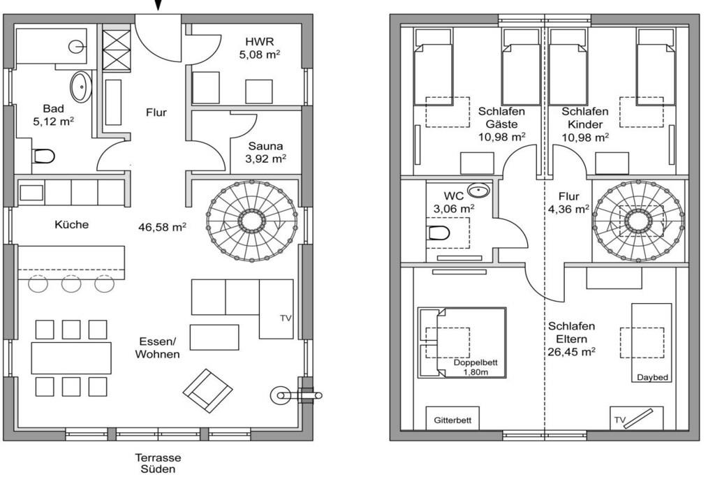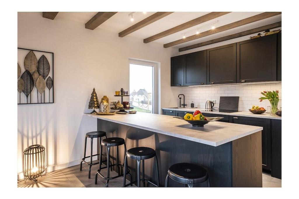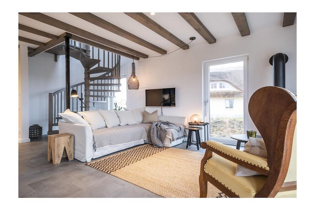 Verbringen Sie einen wunderbaren erholsamen Urlaub im Küstendorf Groß Schwansee! "Jules Hus" befindet sich frei stehend auf einem großen Grundstück mit unverbautem Blick auf Felder und Wiesen gen Süden. Aus der oberen Etage kann man an heiteren Tagen in nordwestlicher Richtung die Lübecker Bucht sehen. Das Haus liegt in fußläufiger Entfernung zum wildromantischen Strand - Sie laufen dorthin durch ein kleines Reetviertel, am Schloß vorbei und durch eine sehr schöne Baumallee. Bei gutem Wetter bietet ein sympathischer Strandkiosk direkt am Strandübergang alles für das leibliche Wohl. Dort können auch hochwertige Mountainbikes und Stand-Up-Paddeling Boards gemietet werden. In der Brasserie des Schlosses können Sie ab mittags schlemmen. Das große Ferienhaus vereint zum eine pure Architektur mit skandinavischer Gemütlichkeit. Im Erdgeschoss befinden sich der Eingangsbereich mit Garderobe, ein großzügiges Duschbad mit Regendusche, eine Sauna sowie ein zentraler Wohnbereich, in dem man wunderbar die Seele baumeln lassen kann. Das TV-Gerät empfängt Satellitenfernsehen und erlaubt Ihre eigenen Streaming-Konten zu nutzen. Über Bluetooth können Sie Ihre Musik über die Stereoanlage abspielen, Radio und CD laufen selbstverständlich auch. Die Küche ist großzügig mit schönem Geschirr ausgestattet. Gekocht wird mit Induktion. Spülmaschine ist vorhanden. Im Hauswirtschaftsraum stehen Ihnen eine Waschmaschine und ein Trockner zur Verfügung. Vom Wohn-/Essbereich haben Sie direkten Zugang zur großen, möblierten und sonnigen Terrasse (Südausrichtung). Grill, Feuerkorb und großer Garten bieten Ihnen einen lauschigen Ort für Grillabende. Der Garten liegt in direkter Feldrandlage. Über eine schöne Holztreppe kommen Sie in das Obergeschoss mit 3 Schlafzimmern. Für die ganz kleinen Gäste gibt es ein stabiles Gitterbett (60x120cm), eine Wickelauflage, eine Babybadewanne und einen Hochstuhl. Das gemütliche Haus mit erstklassigem Wohnkomfort hat mit ca. 117 m² Platz für 7 Personen und 1 Baby. Die Betten/Matratzen sind auf 4 Erwachsene und 3 Kinder ausgelegt. Hier können 3 Generationen zusammen Urlaub verbringen. Mögliche Unterbringung: - großes Schlafzimmer mit Doppelbett, Babybett und Tagesbett (letzteres kann für kleinere Kinder zum Schlafen genutzt werden) - kleines Schlafzimmer mit 2 Einzelbetten, ein Bett davon kann jeweils ausgezogen werden - kleines Schlafzimmer mit 2 Einzelbetten, ein Bett davon kann jeweils ausgezogen werden Kostenfreies WLAN ist vorhanden. Der PKW-Stellplatz ist direkt vor dem Haus. Familien mit Kindern können hier einen unbeschwerten Urlaub verleben und sich ausgiebig erholen. Wellness-Liebhaber werden die Sauna und den Kamin genießen.