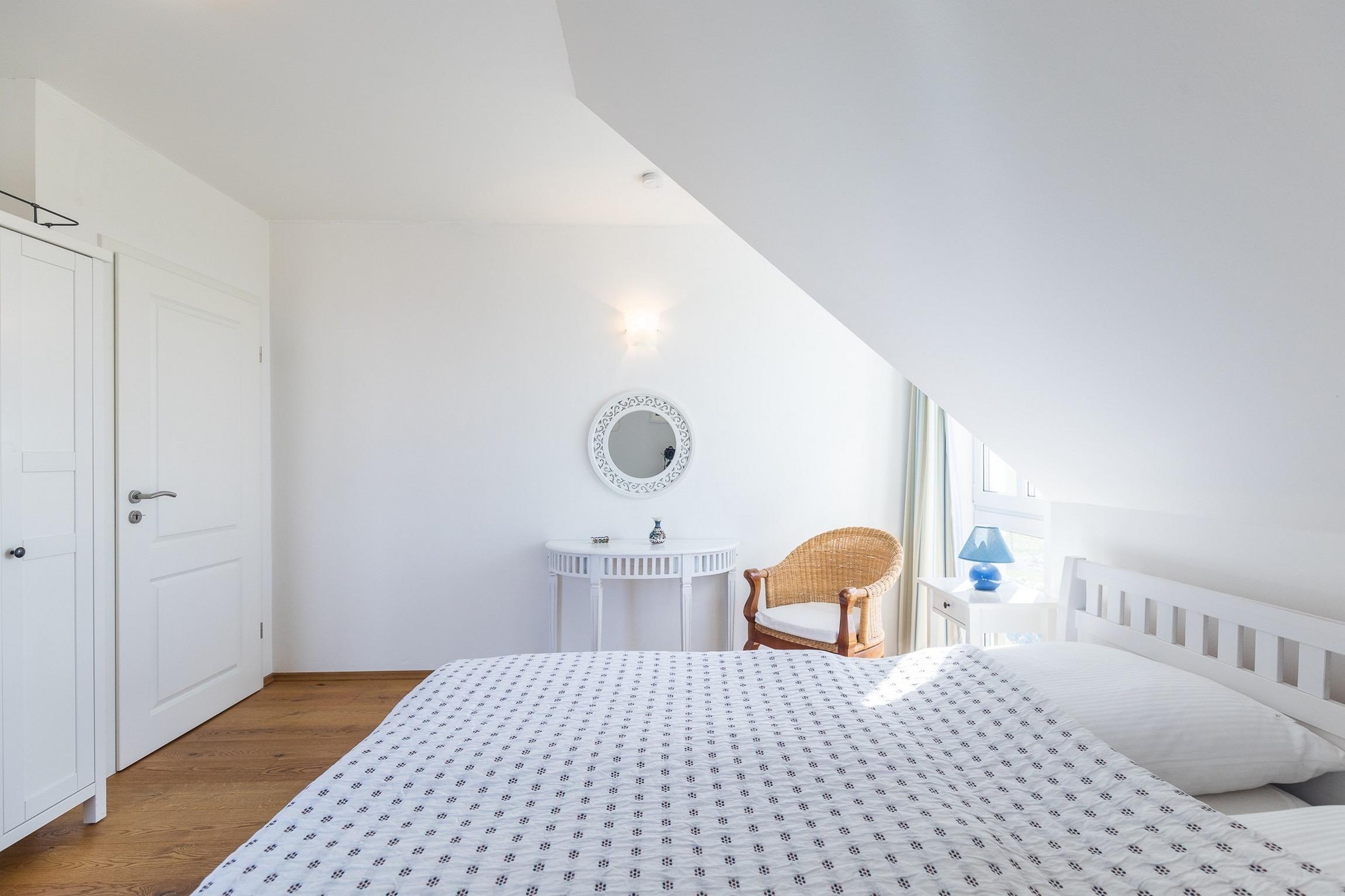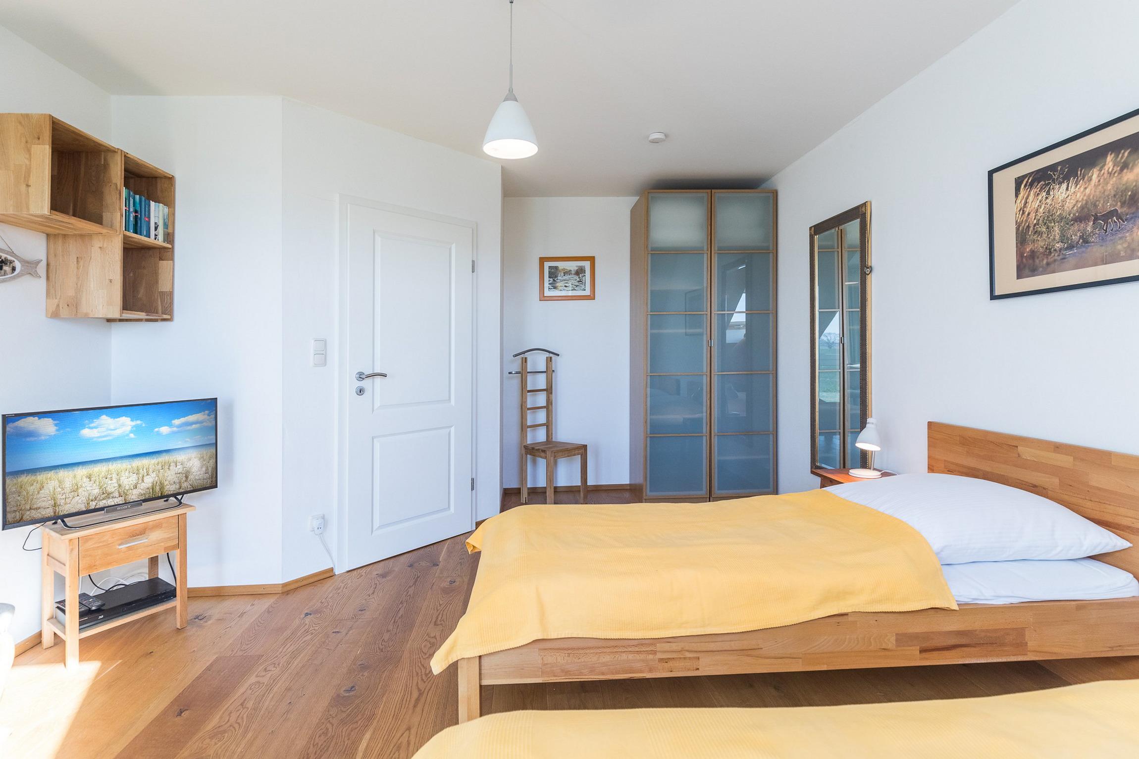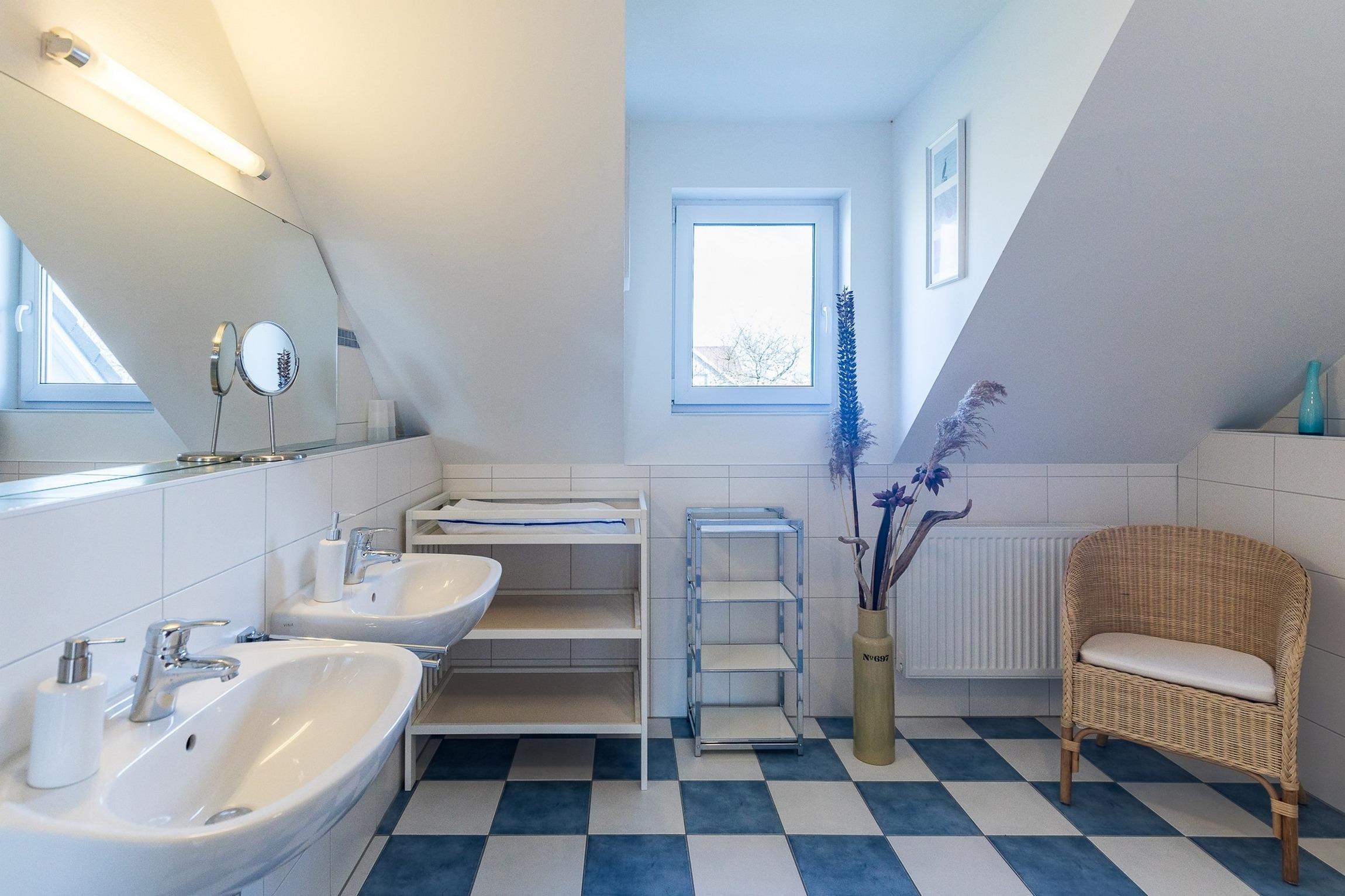 Im 1. Obergeschoss befinden sich zwei weitere Schlafzimmer (ein Schlafzimmer mit zwei Einzelbetten und TV und ein Schlafzimmer mit einem Doppelbett), vollständig und geschmackvoll möbliert sowie das freundliche, helle Duschbad mit WC und 2 Handwaschbecken.