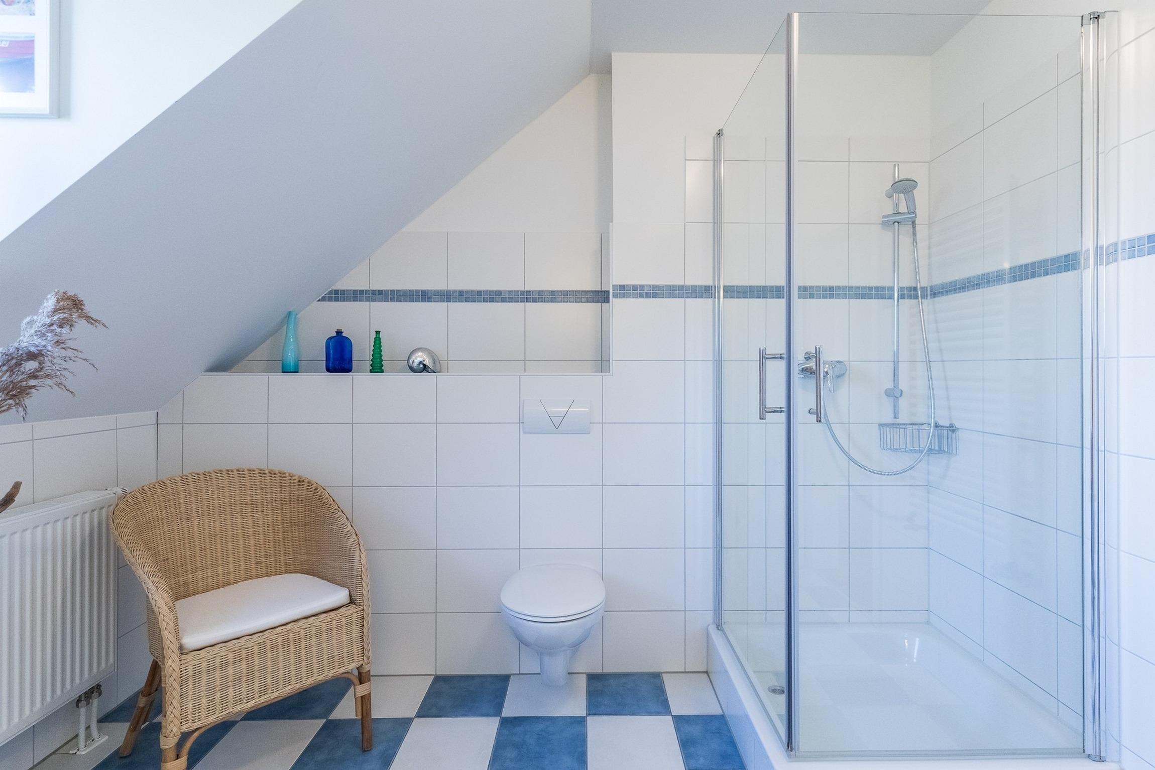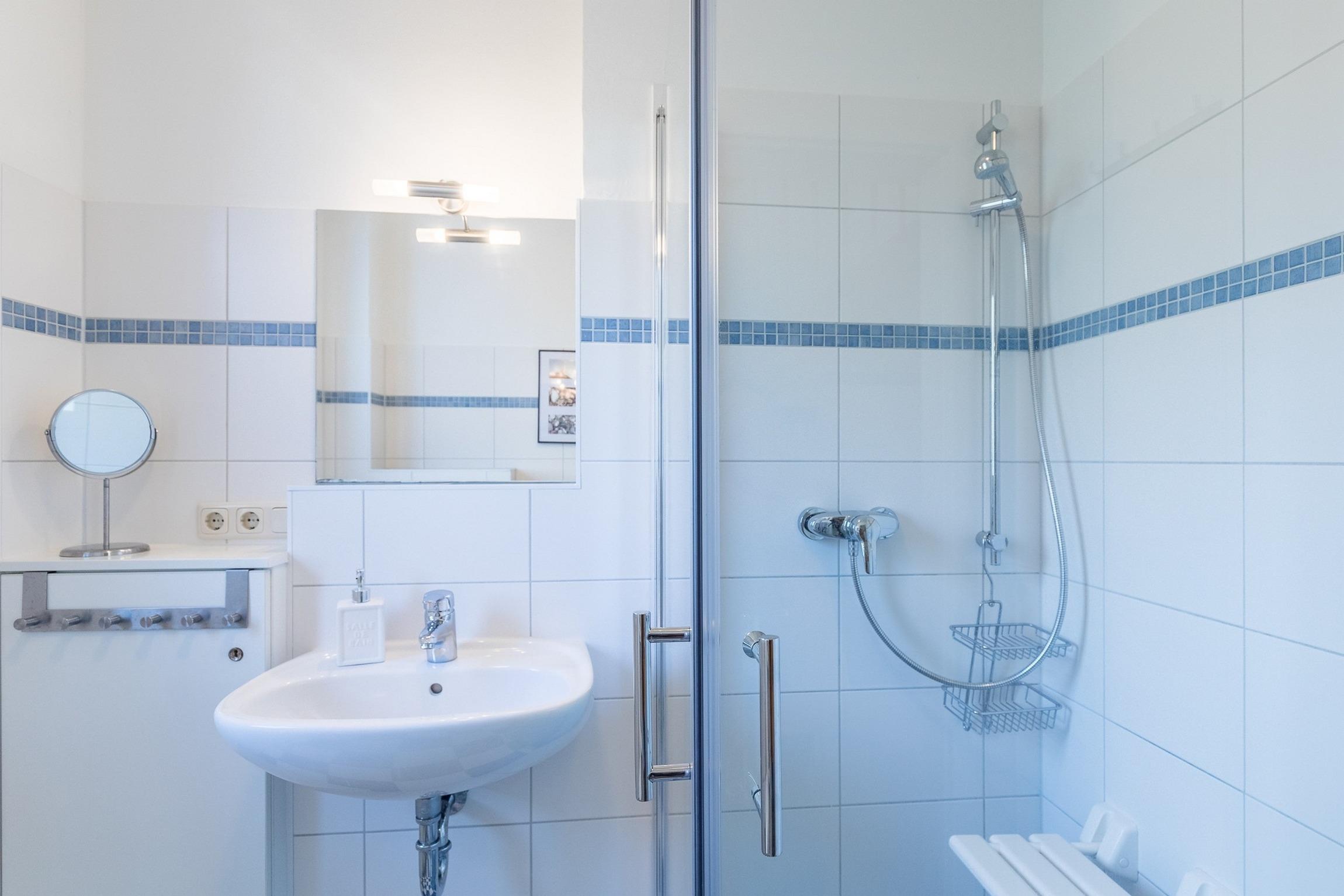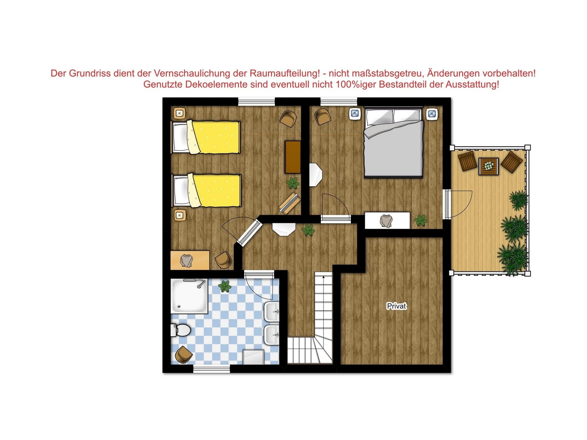 Im 1. Obergeschoss befinden sich zwei weitere Schlafzimmer (ein Schlafzimmer mit zwei Einzelbetten und TV und ein Schlafzimmer mit einem Doppelbett), vollständig und geschmackvoll möbliert sowie das freundliche, helle Duschbad mit WC und 2 Handwaschbecken.