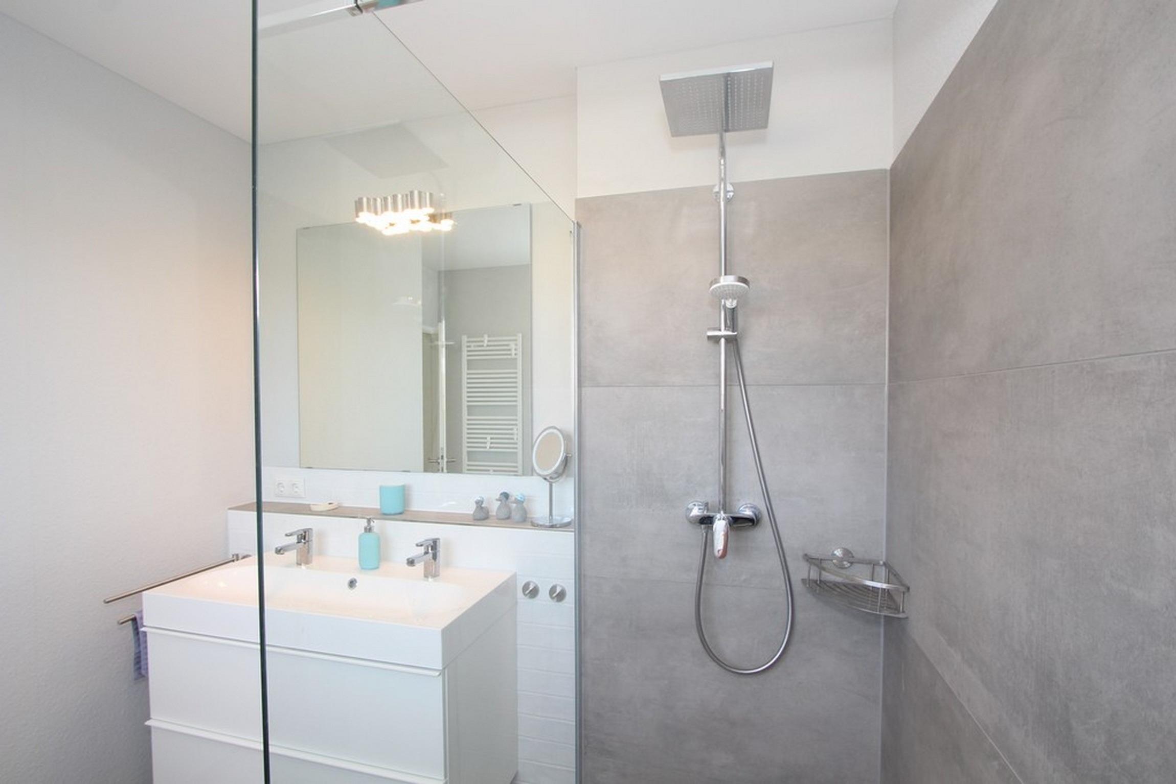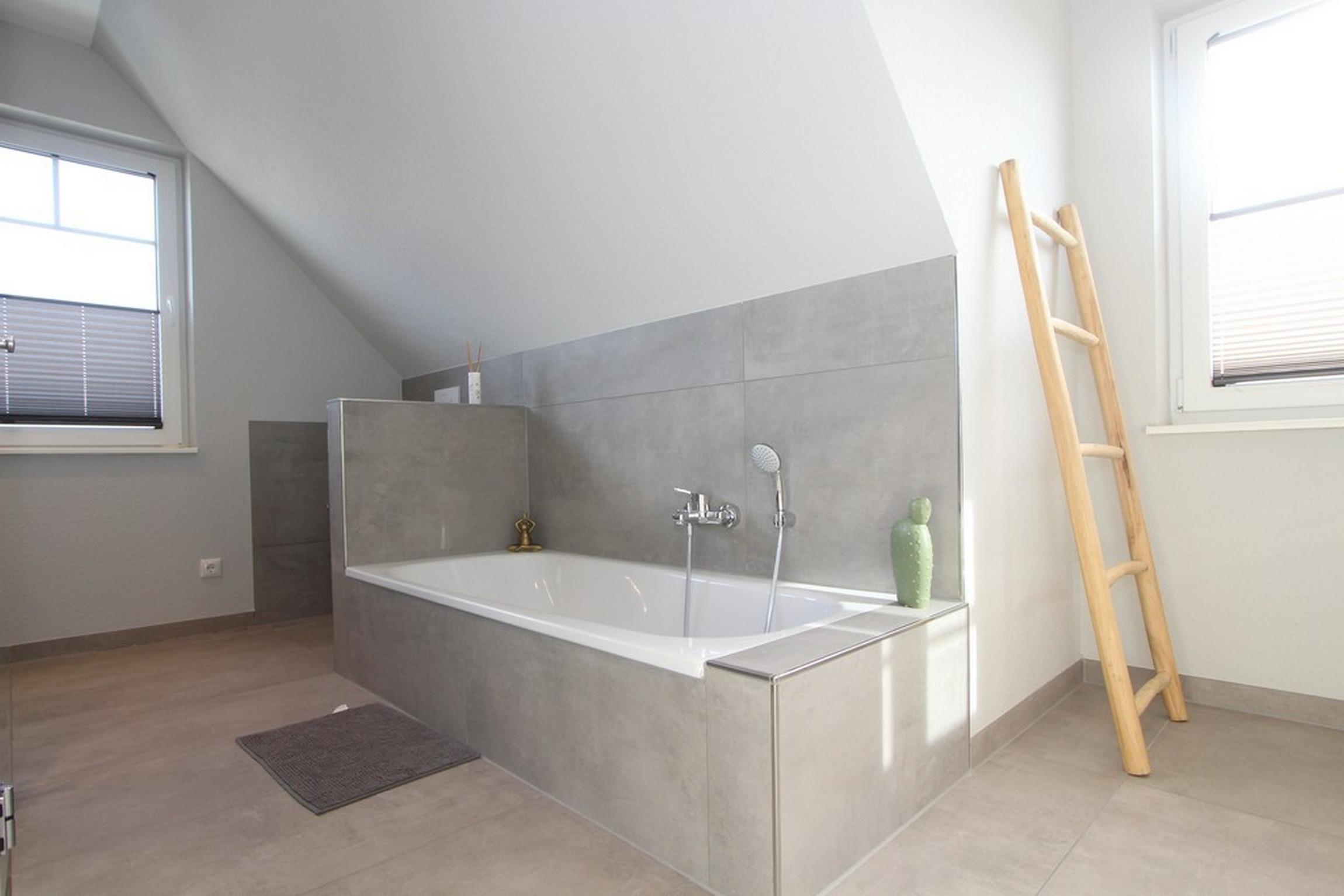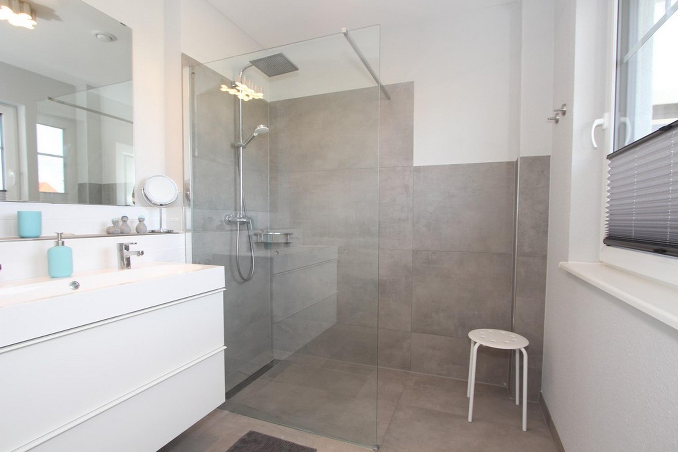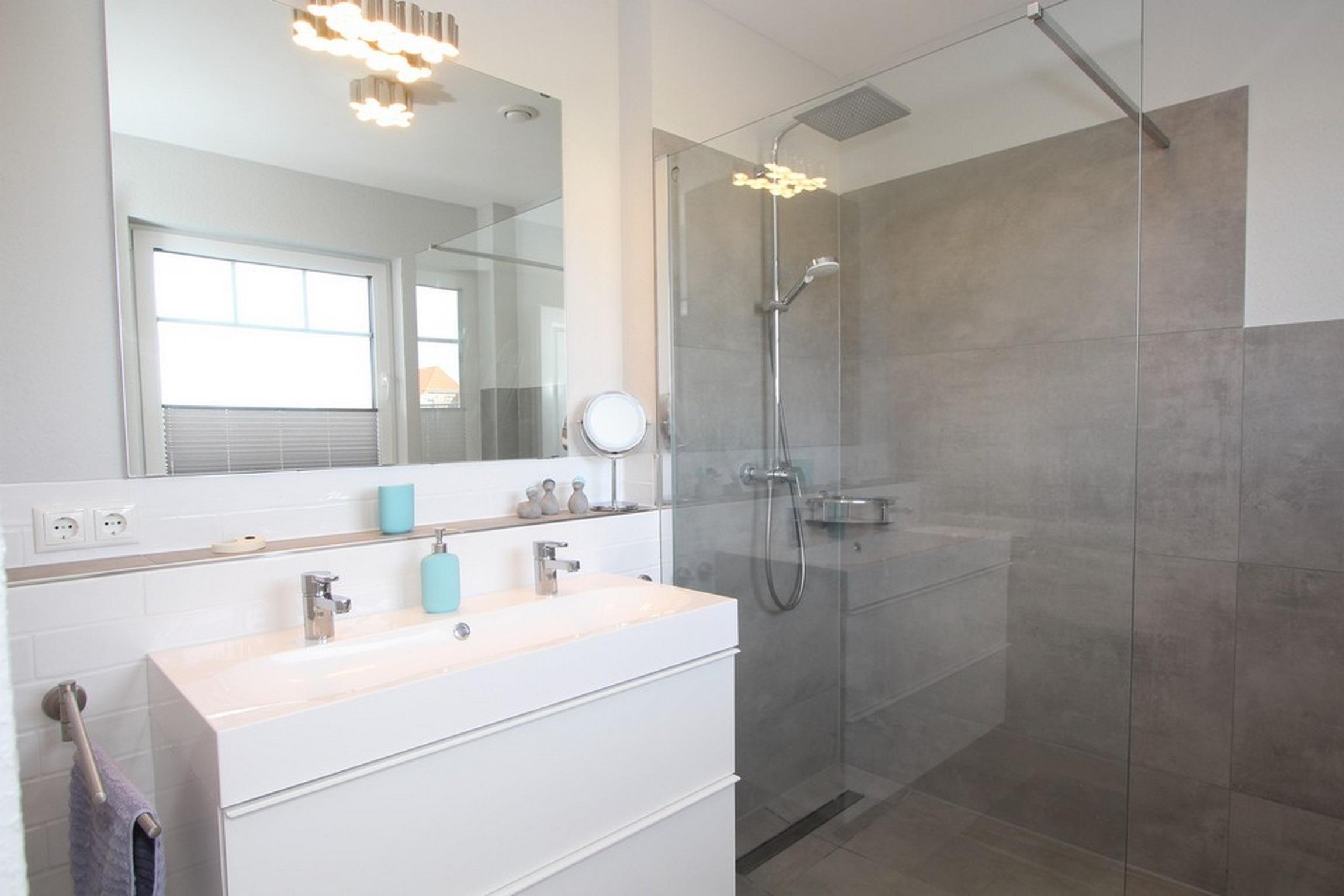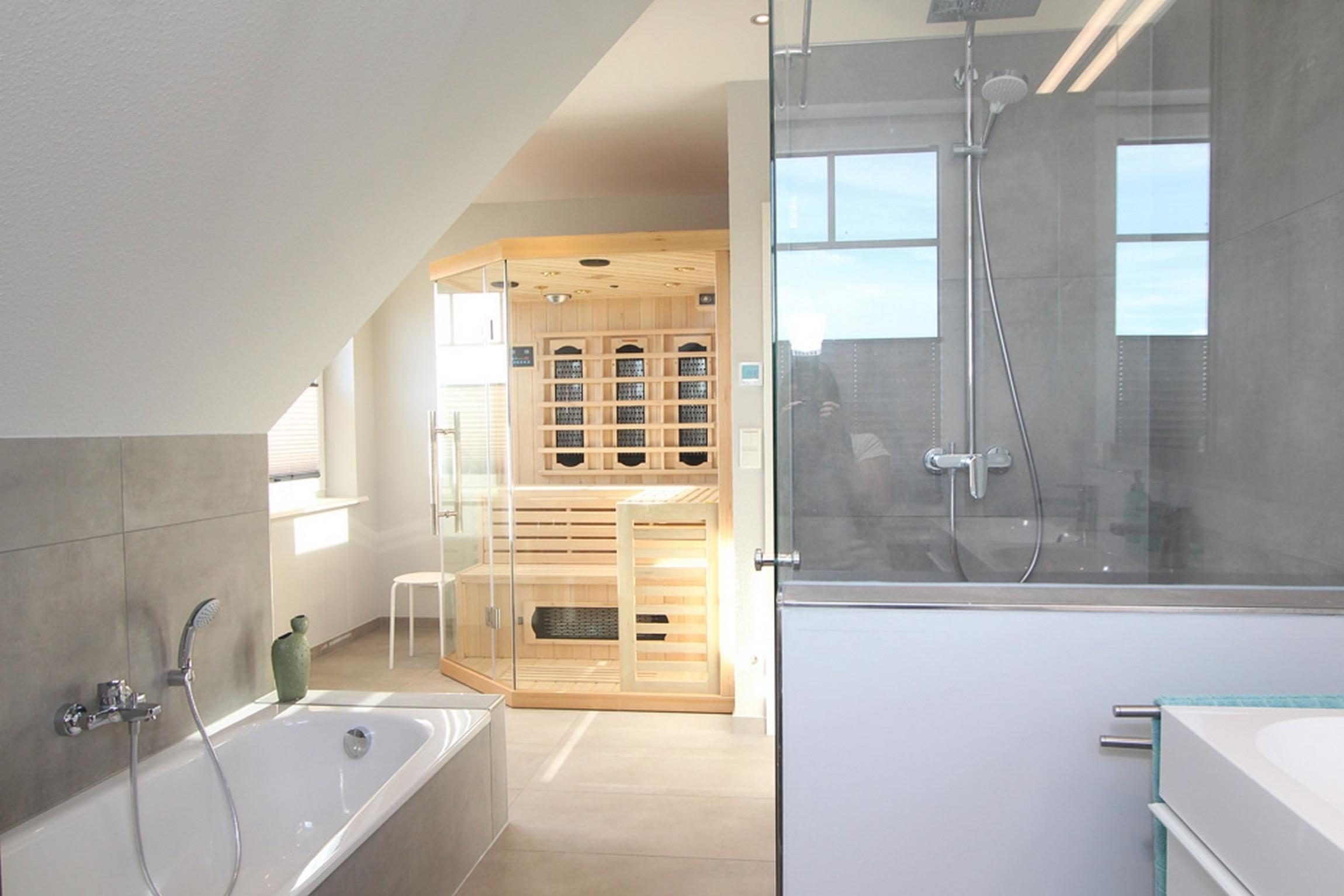Ferner finden Sie auf dieser Etage das große Vollbad, wieder mit bodengleicher Dusche und Doppelwaschtisch sowie mit integrierter Infrarotwärmekabine.