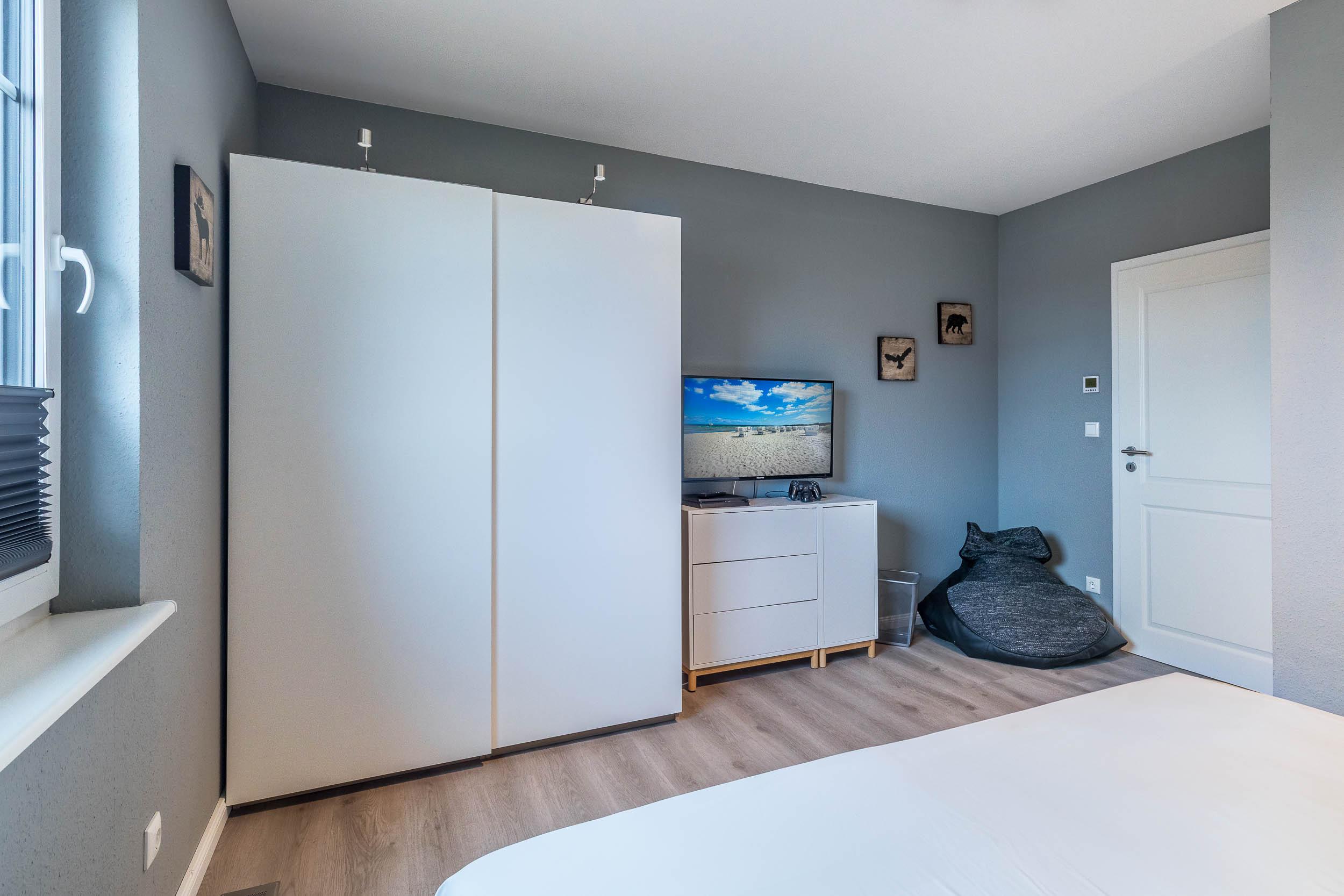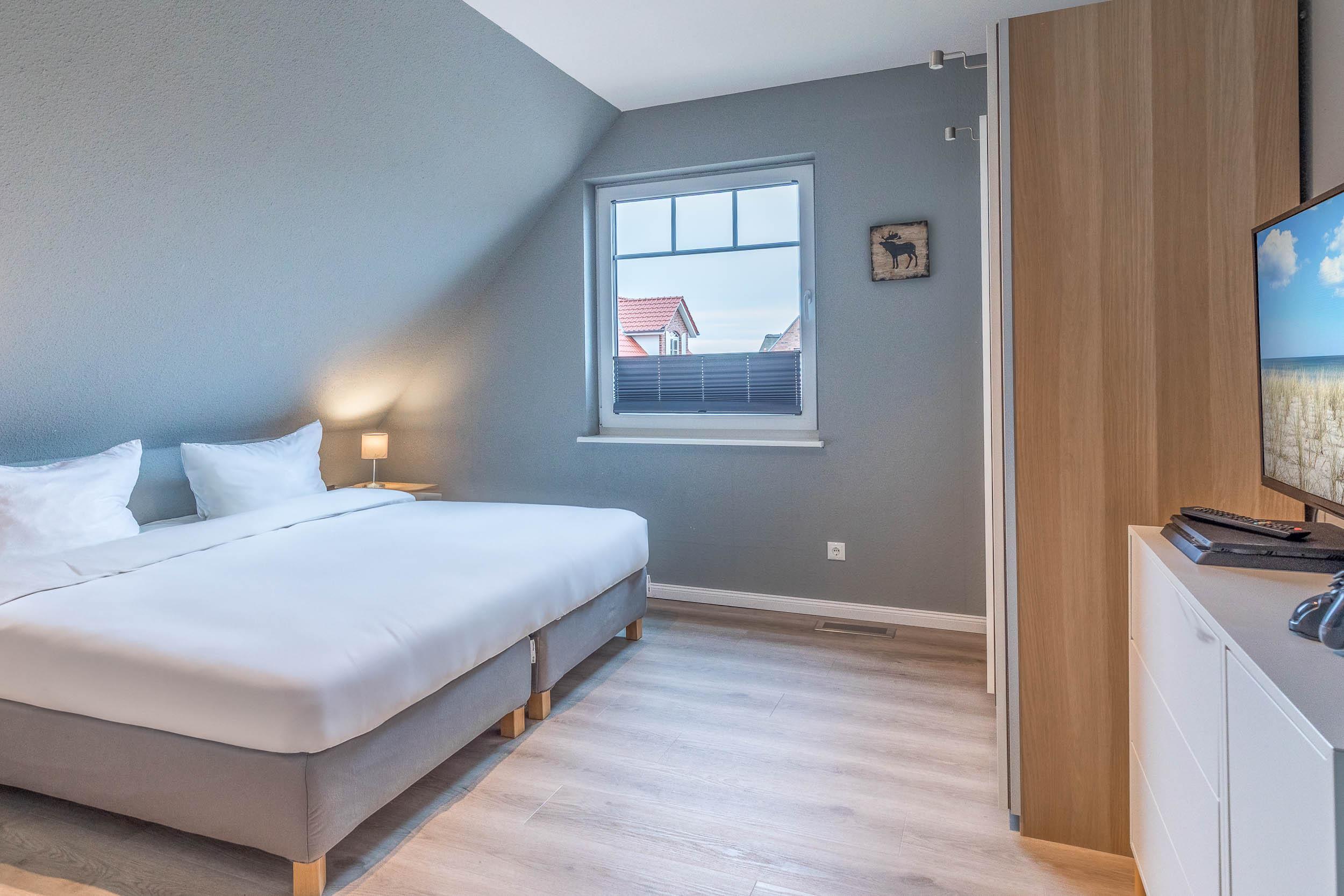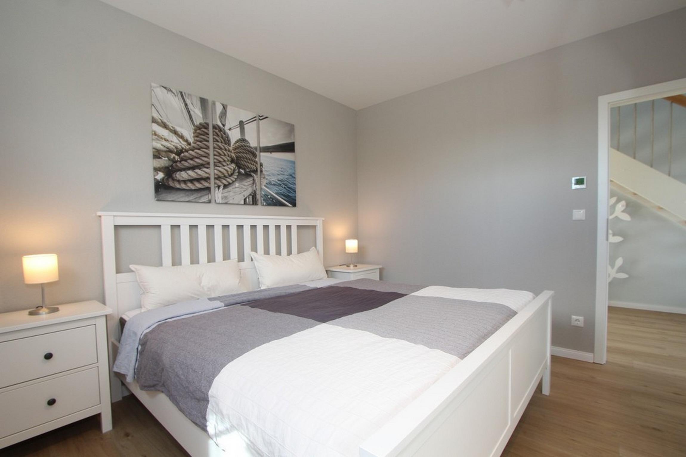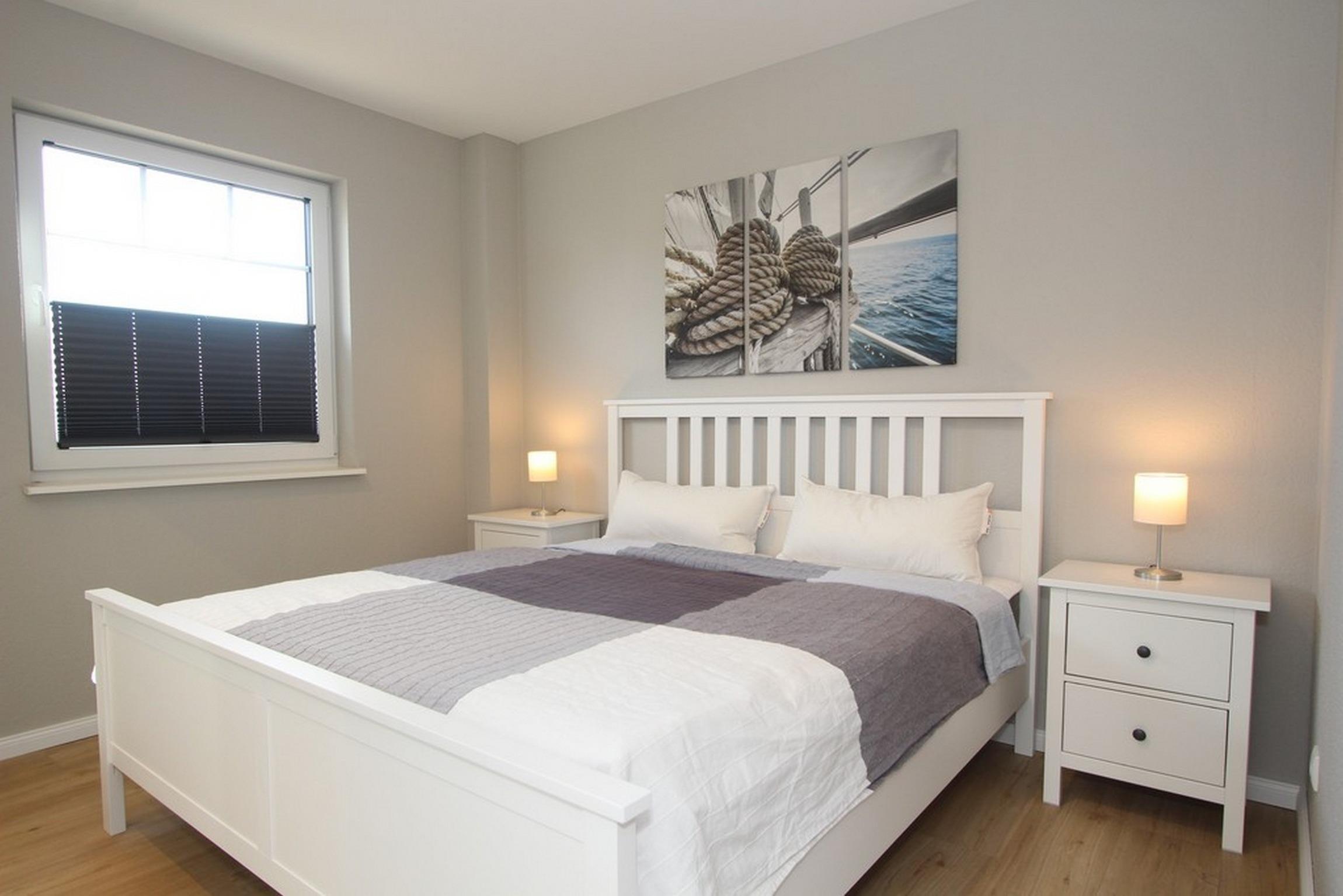 Das erste Schlafzimmer ist mit einem Doppelbett (160x200) und Schreibtisch mit LAN-Anschluss ausgestattet und bietet einen schönen Blick auf die Ostsee.