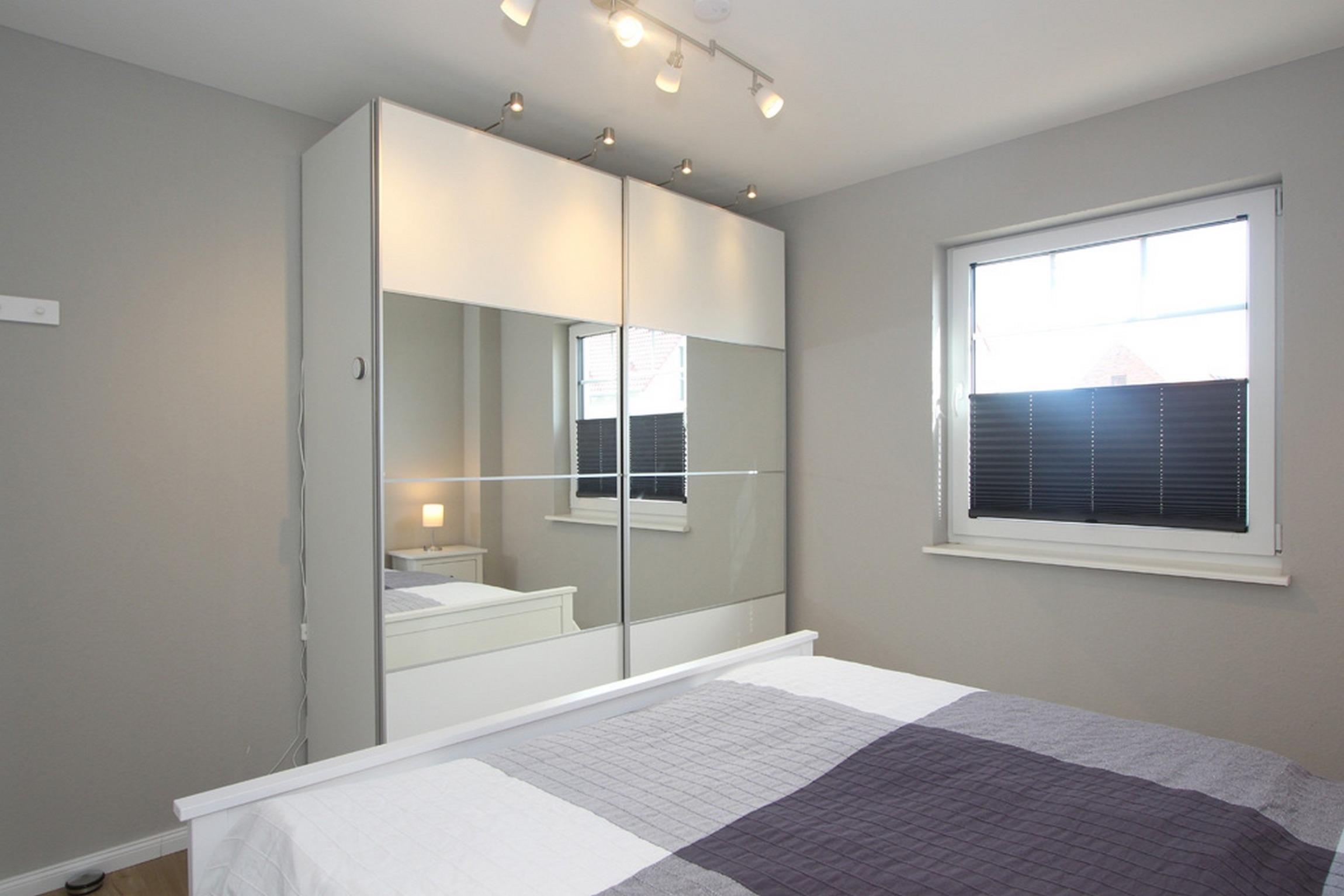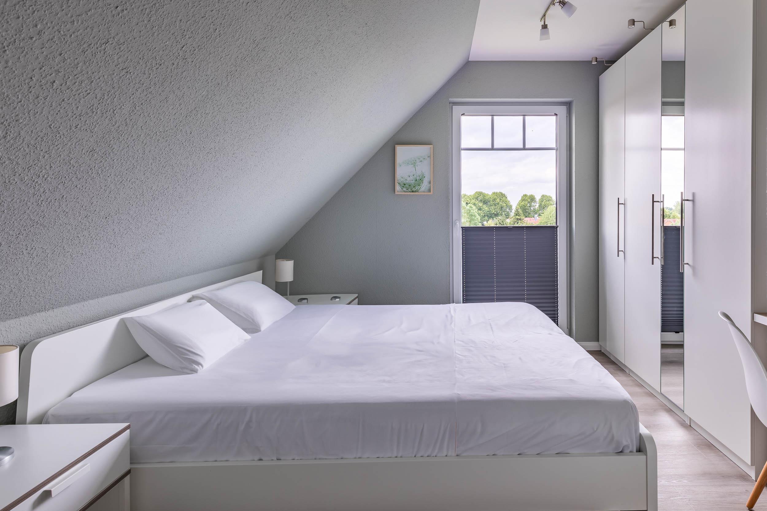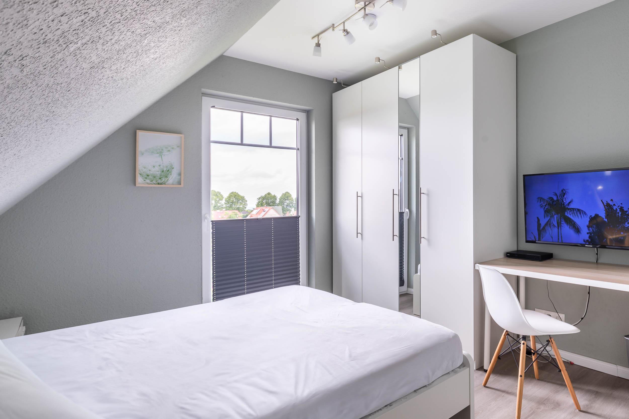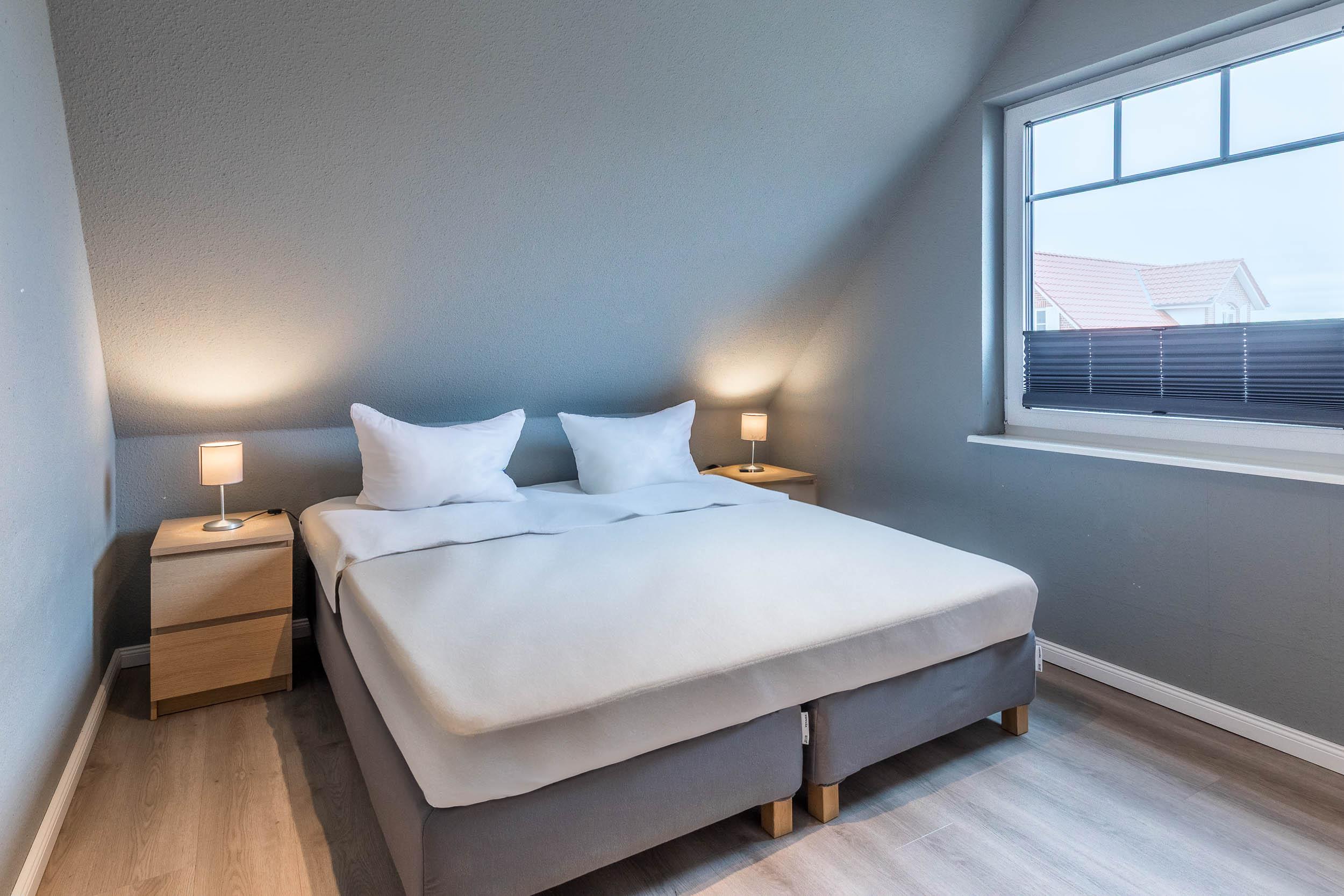 Das erste Schlafzimmer ist mit einem Doppelbett (160x200) und Schreibtisch mit LAN-Anschluss ausgestattet und bietet einen schönen Blick auf die Ostsee.