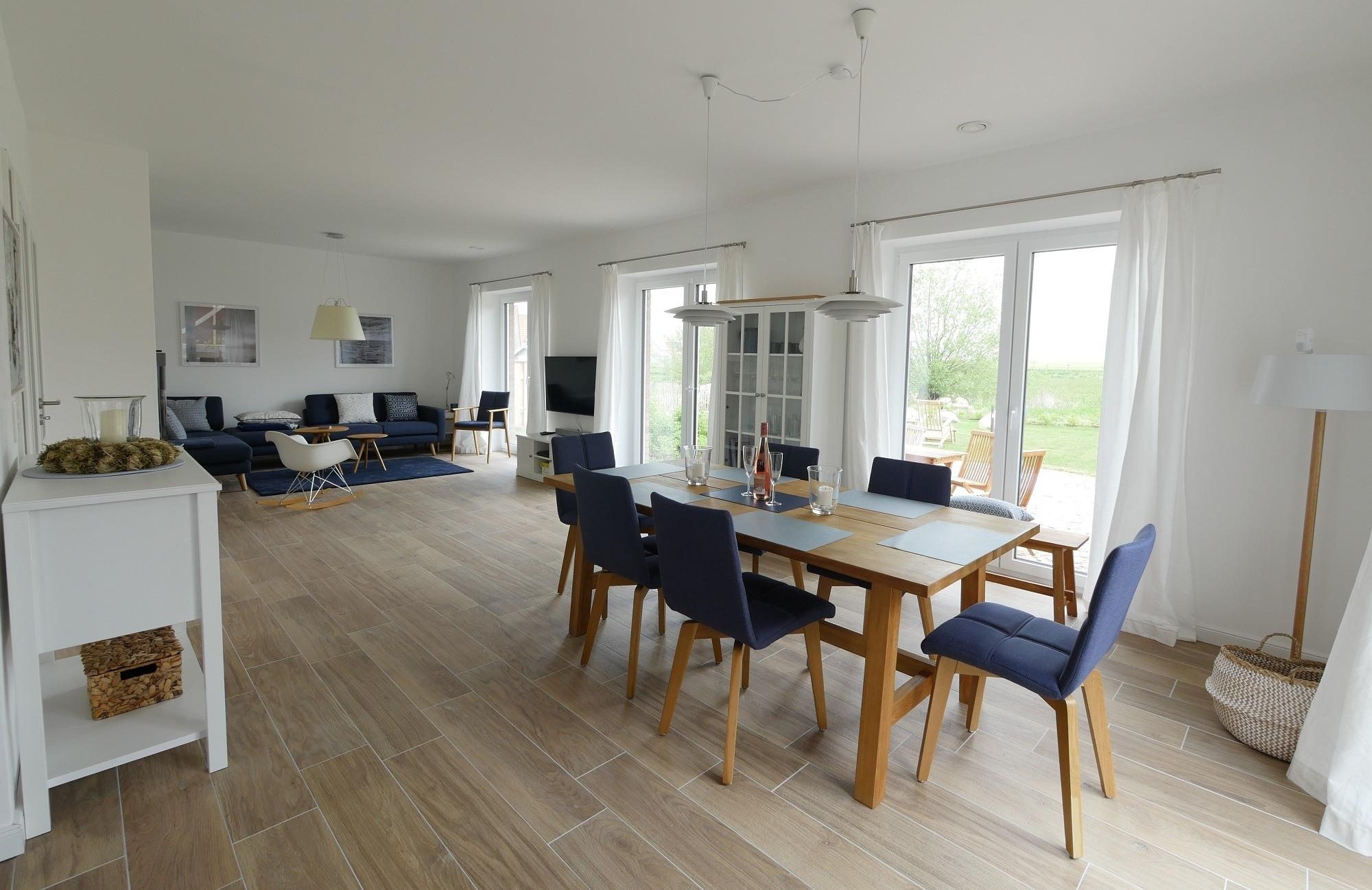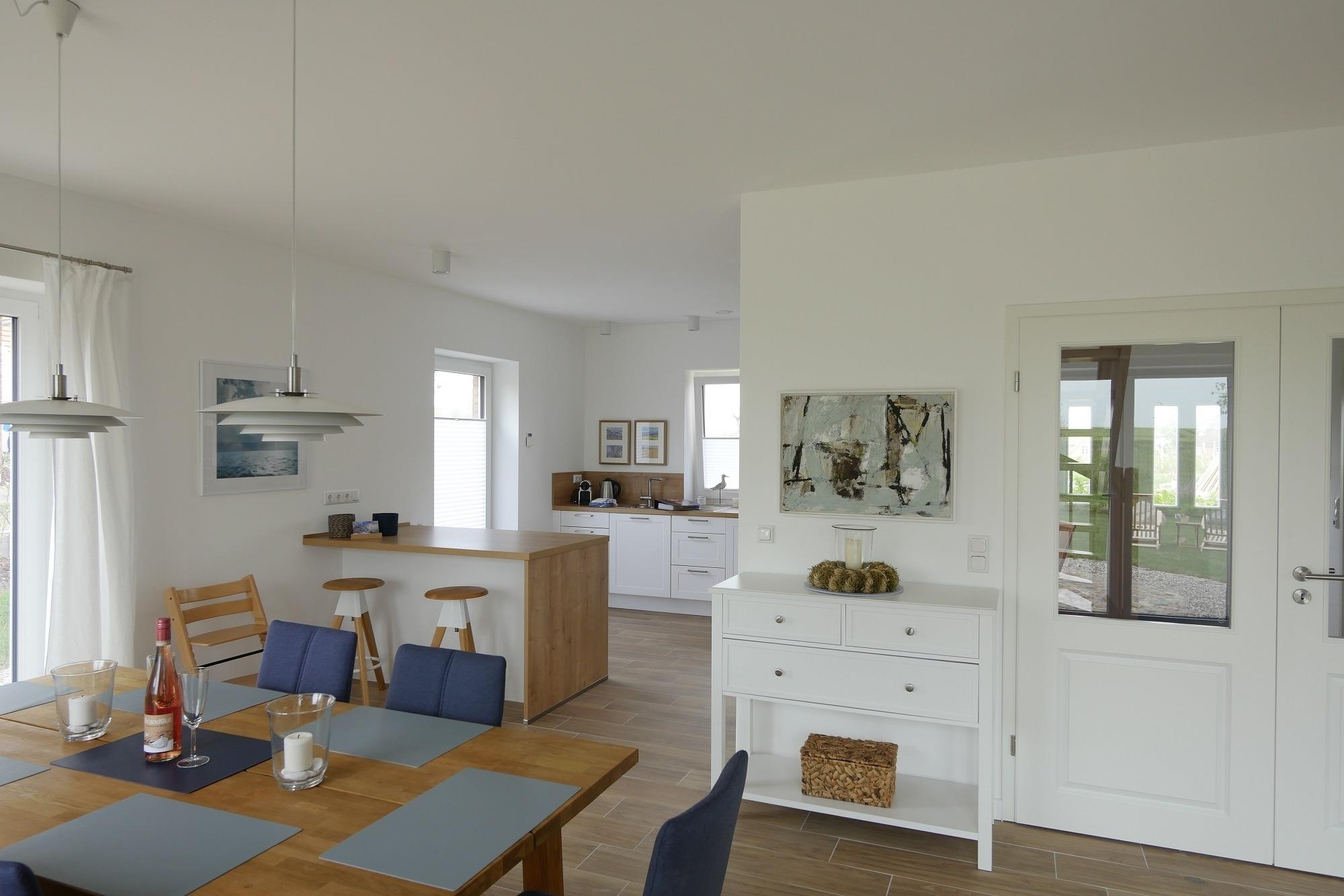 Bereits beim Betreten der geräumigen Eingangsdiele mit Garderobe, gemütlicher Friesenbank, großem Spiegel und schöner Massivholztreppe können Sie sich in charmanter Urlaubsatmosphäre wohlfühlen. Besonders großzügig und komfortabel ist der sich auf 50m² erstreckende lichtdurchflutete Wohn-Essbereich mit angrenzendem Bartresen und moderner offener Küche gestaltet. Von der Sofalandschaft und den beiden Sesseln aus kann man entspannt dem Feuer im Kamin zuschauen oder den Blick zum nahegelegenen Teich und über die Felder schweifen lassen. Auch vom Esstisch in massiver Eiche mit gepolsterten Stühlen sieht man auf Findlinge in eiszeitlich geprägter Landschaft.