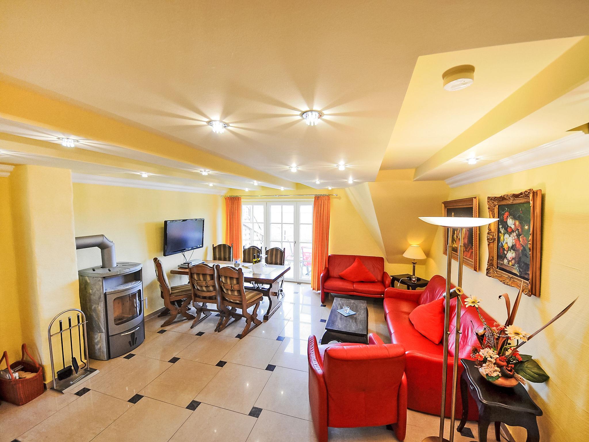 "Sonnenkamp", 4-room maisonette 86 m2 on 2 levels on 1st floor. Partly with sloping ceilings, comfortable and tasteful furnishings: living/dining room with Scandinavian wood stove, satellite TV, hi-fi system and DVD. Exit to the balcony, south facing position. 1 double bedroom with radio. Open kitchen (oven, dishwasher, microwave, freezer, electric coffee machine). Bath/bidet/WC. Top floor: 1 room with 1 double bed (160 cm, length 200 cm). 1 room with 1 double bed (160 cm, length 200 cm), satellite TV. Shower/WC. Balcony furniture. Facilities: washing machine, dryer, logs (free). Internet (WiFi, free). Parking (2 cars) at the house. Please note: non-smokers only. Maximum 1 pet/ dog allowed. Private entrance, smoke alarm. Two free parking spaces available. Additional parking spaces can be provided at a price of EUR 4.00 / day at a distance of 300 m, on request and after pre-order.