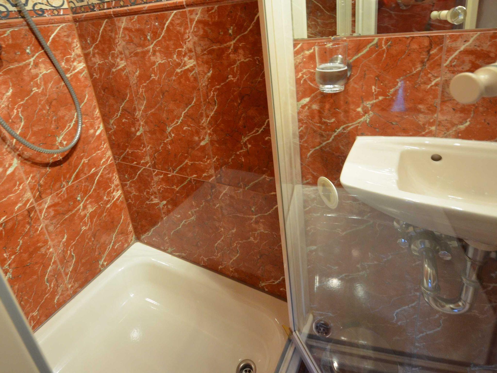 Fußbodenheizung, Naturstein - Abdeckungen, große Spiegel, schöne