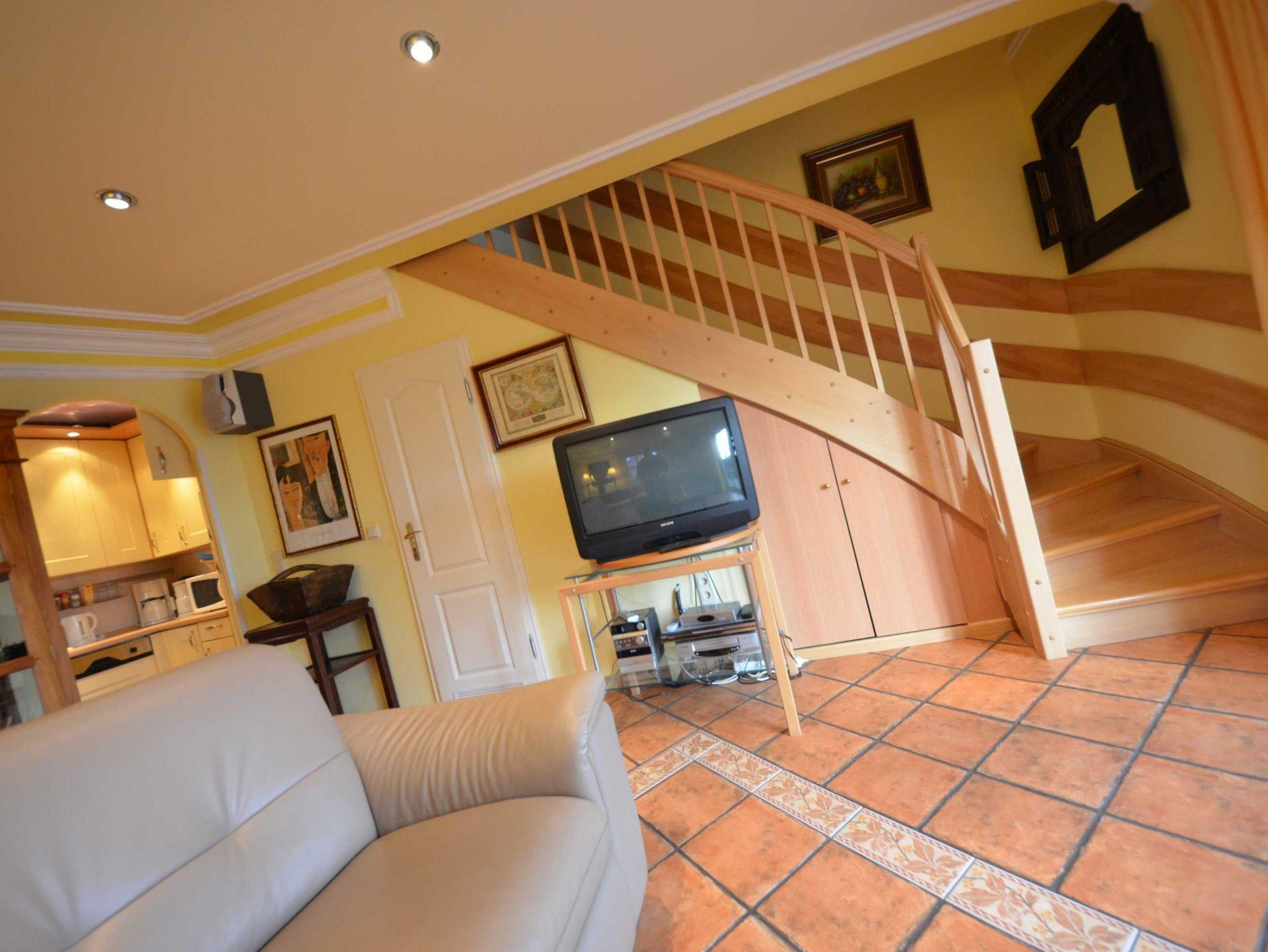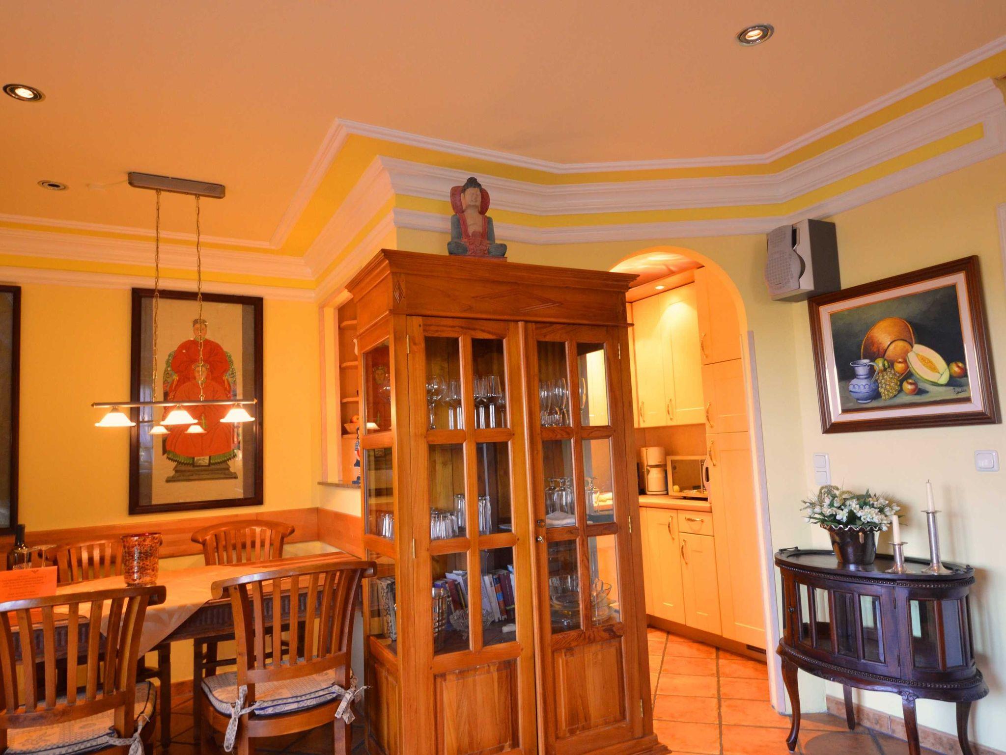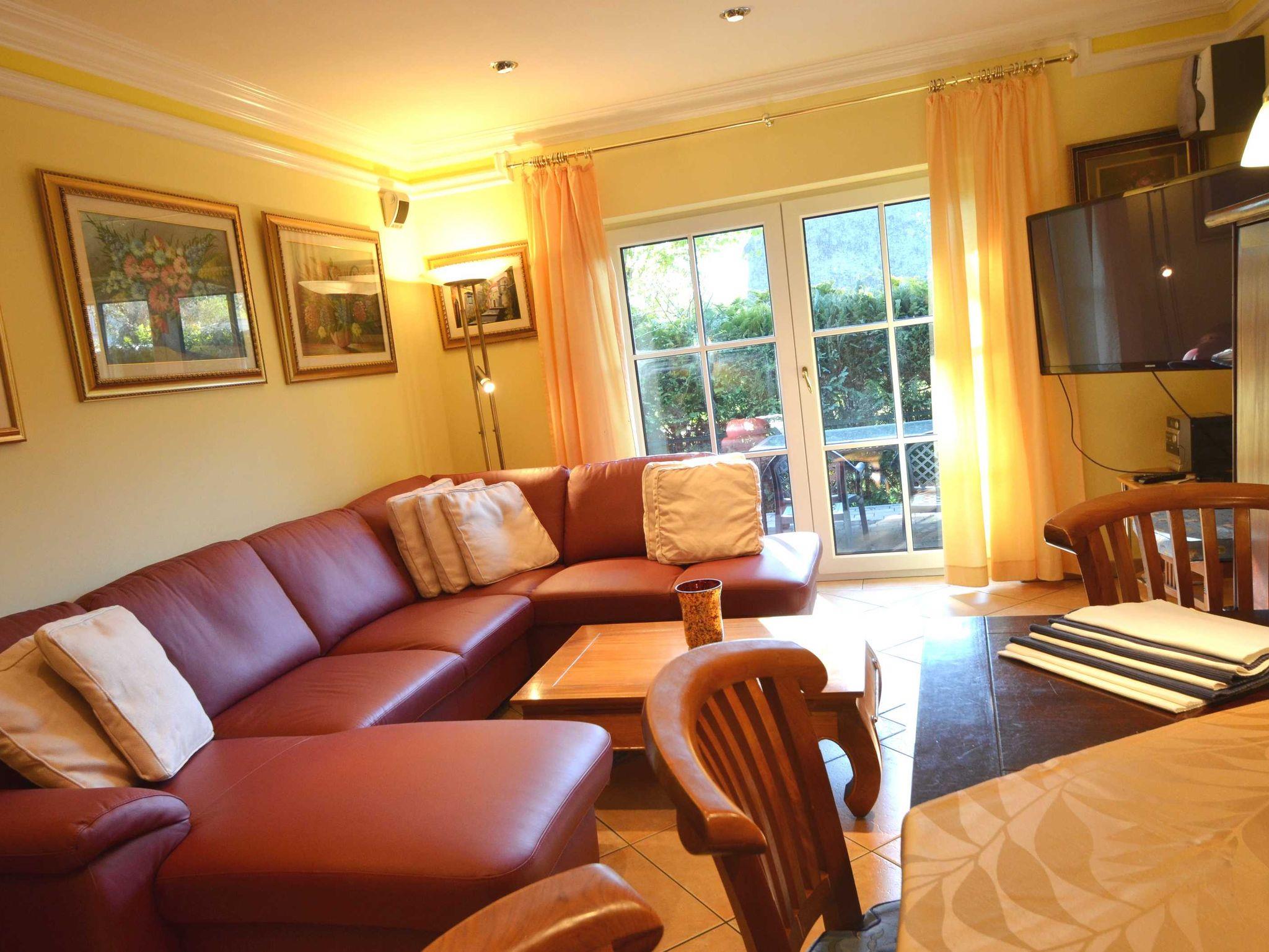 2 Bäder, Fußbodenheizung, schön eingerichtetes Wohn- Esszimmer, Couchgarnitur mit Leder bezogen, Opiumtisch, Speisetafel mit Stühlen, Geschirrschrank, Sat - TV, Telefon, Spiegel pp.