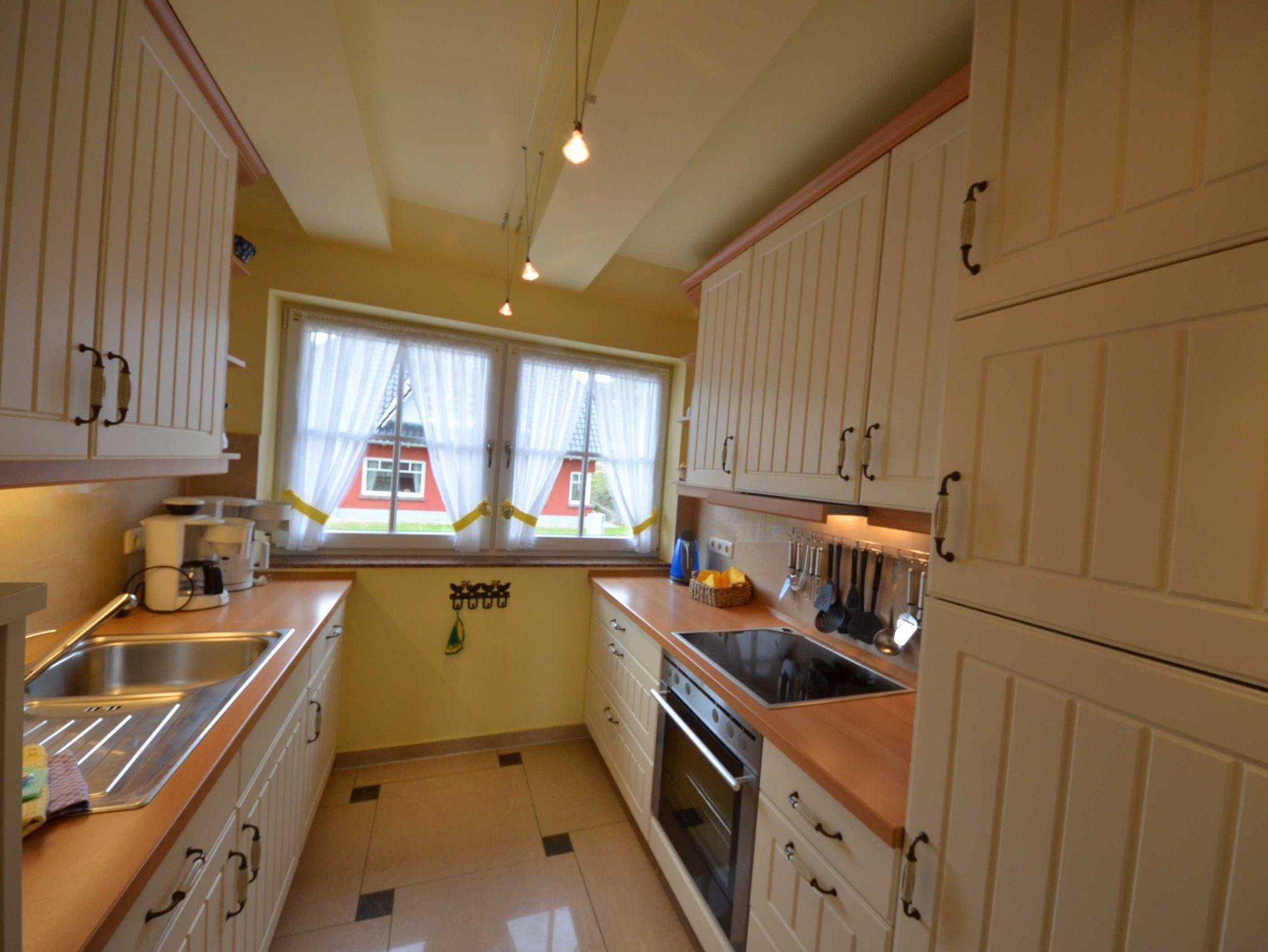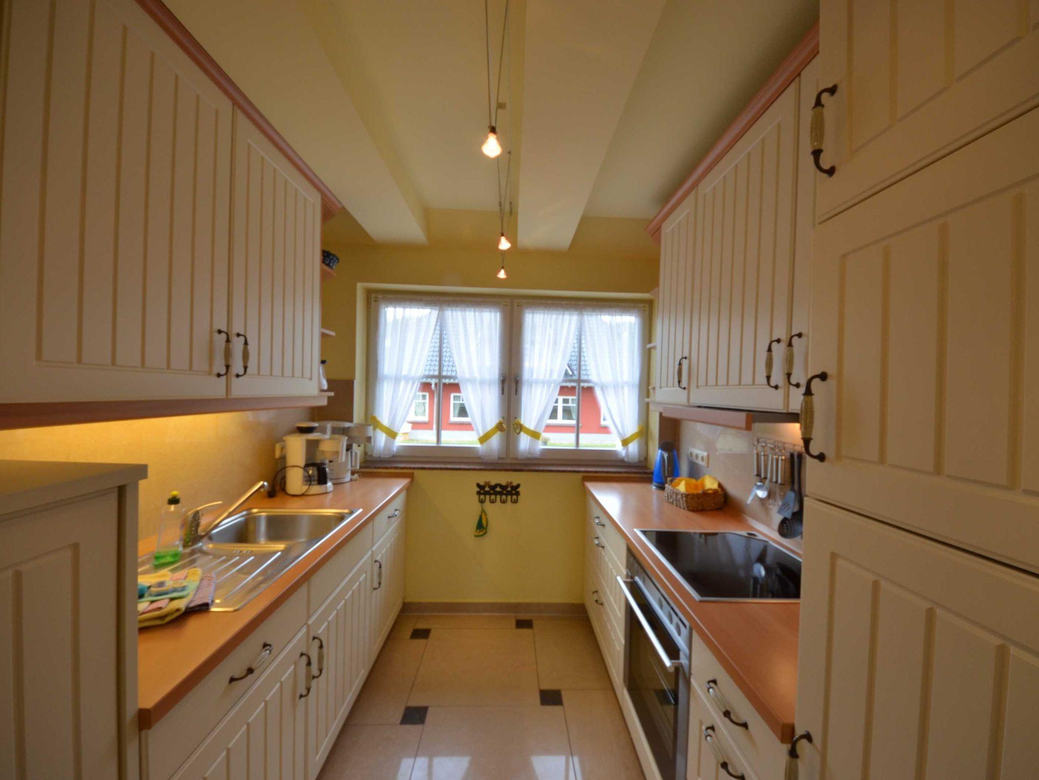 Sehr dekorative Landhaus-Einbauküche in vanillegelb, Geschirrspüler höher gelegt, Mikrowelle, Herd mit Cerankochfeld und Backofen, Flachschirm-Dunstabzugshaube, großer Kühlschrank mit 38 LGefrierteil, zwei Kaffeemaschinen, Wasserkocher, Eierkocher, Toaster, Waffeleisen, Mixer, ausreichend Edelstahltöpfe Schnellkochtopf, Gewürze, sehr schönes Geschirr, Auswahl an Gläsern.