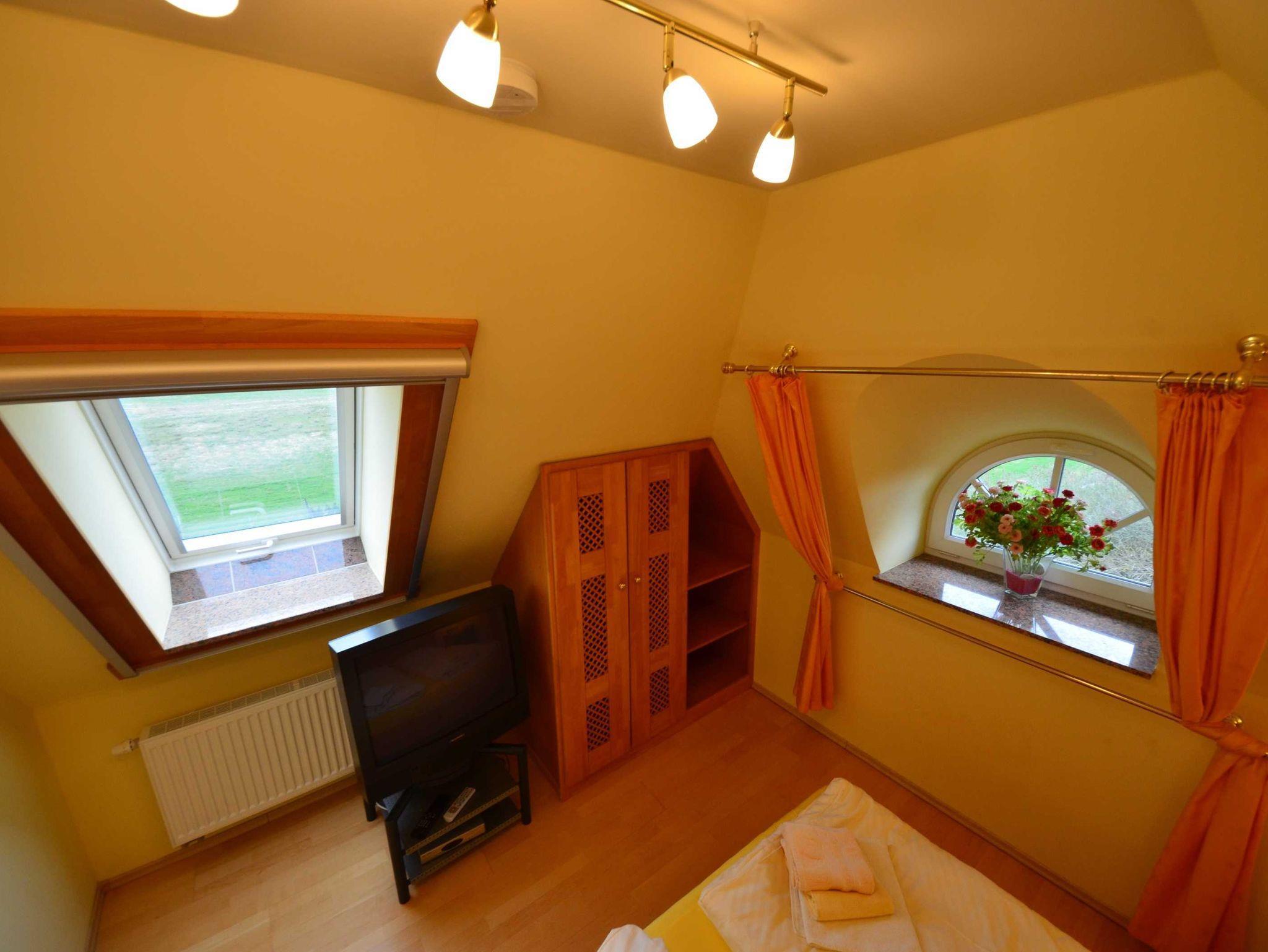 Ein Schlafzimmer mit 1,80 x 2,00 m Bett und zwei Schlafzimmer mit jeweils 1,60 x 2,00 m Bett, Radiowecker, Wände mit Bildern dekoriert, antiker Gründerzeit-Wäsche-/Kleiderschrank, elektrische Rolläden, Fenster mit Mückenschutz. Nach Voranmeldung: ein Babyreisebett (kostenlos) mit Bettwäsche.