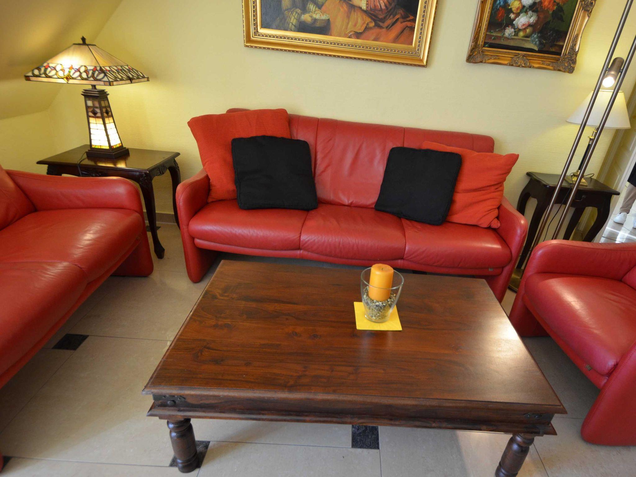 Hark-Kaminofen, antike Vitrinen, kleine Bücherauswahl, Plasma-TV mit 125 cm Großbild, Fußbodenheizung, DVD-Recorder, Stereoanlage, CD-Player, Kinderhochstuhl, Wände dekoriert mit Spiegeln und Gemälden, sehr ansprechende