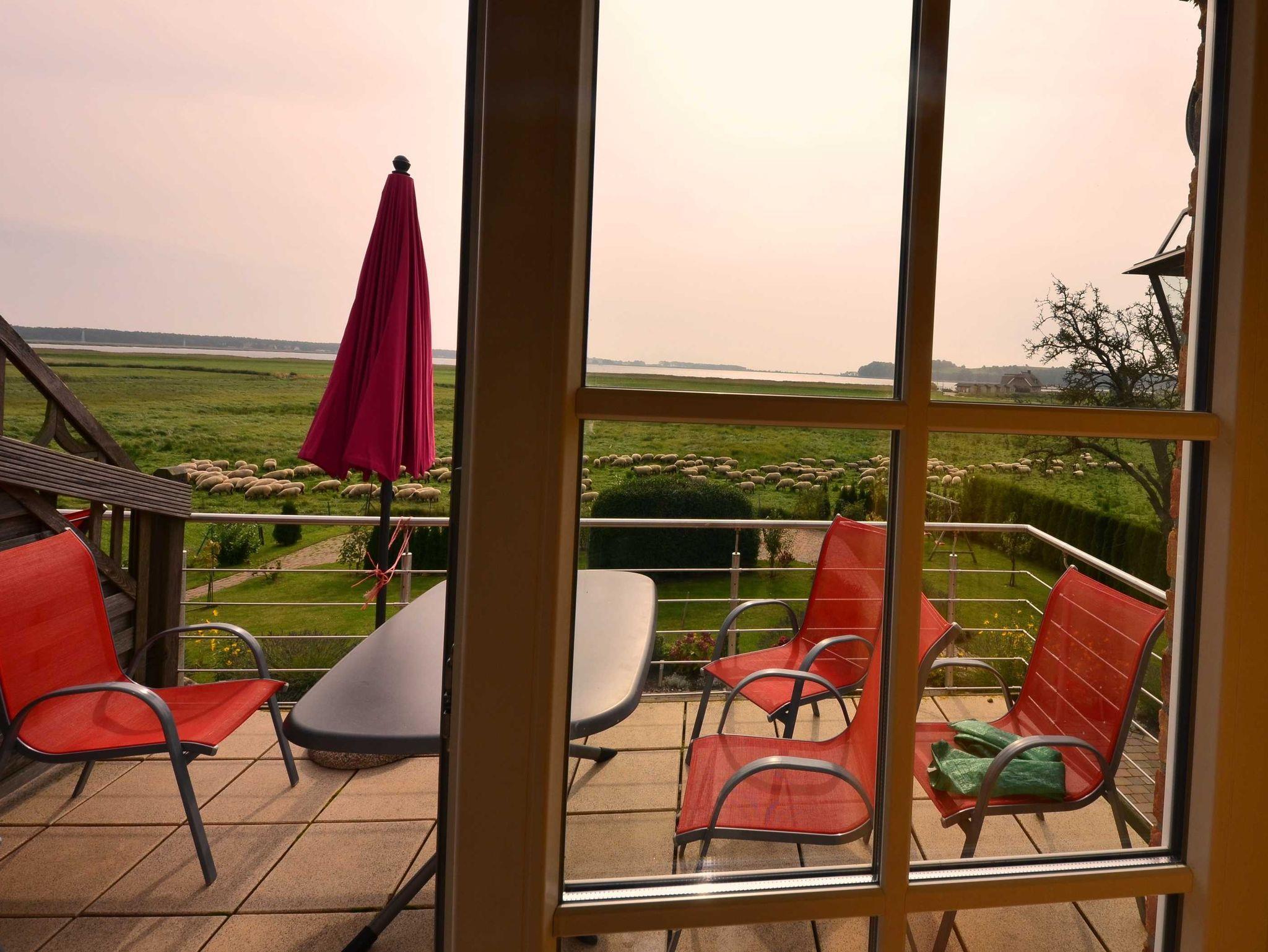 Garten direkt an den Salzwiesen zum Meer hin. Gartenmöbel und Außengrill, Kinderschaukel. Der Garten kann auch von der Ferienwohnung im EG genutzt