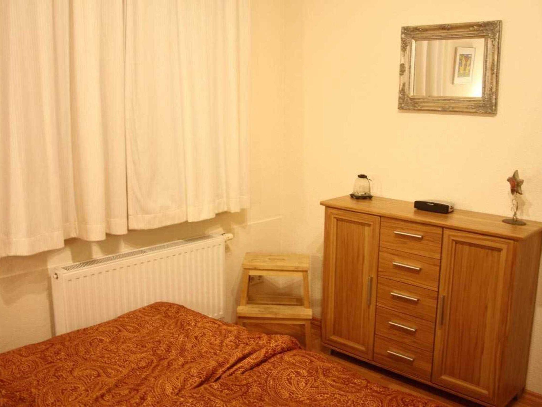 Es gibt ein geräumiges Schlafzimmer mit Kleiderschrank und Doppelbett sowie ein kleineres 2. Schlafzimmer mit Doppelstockbett (90 x 200cm) und Glastür. Im Wohnzimmer steht eine ausziehbare Schlafcouch zur Verfügung.