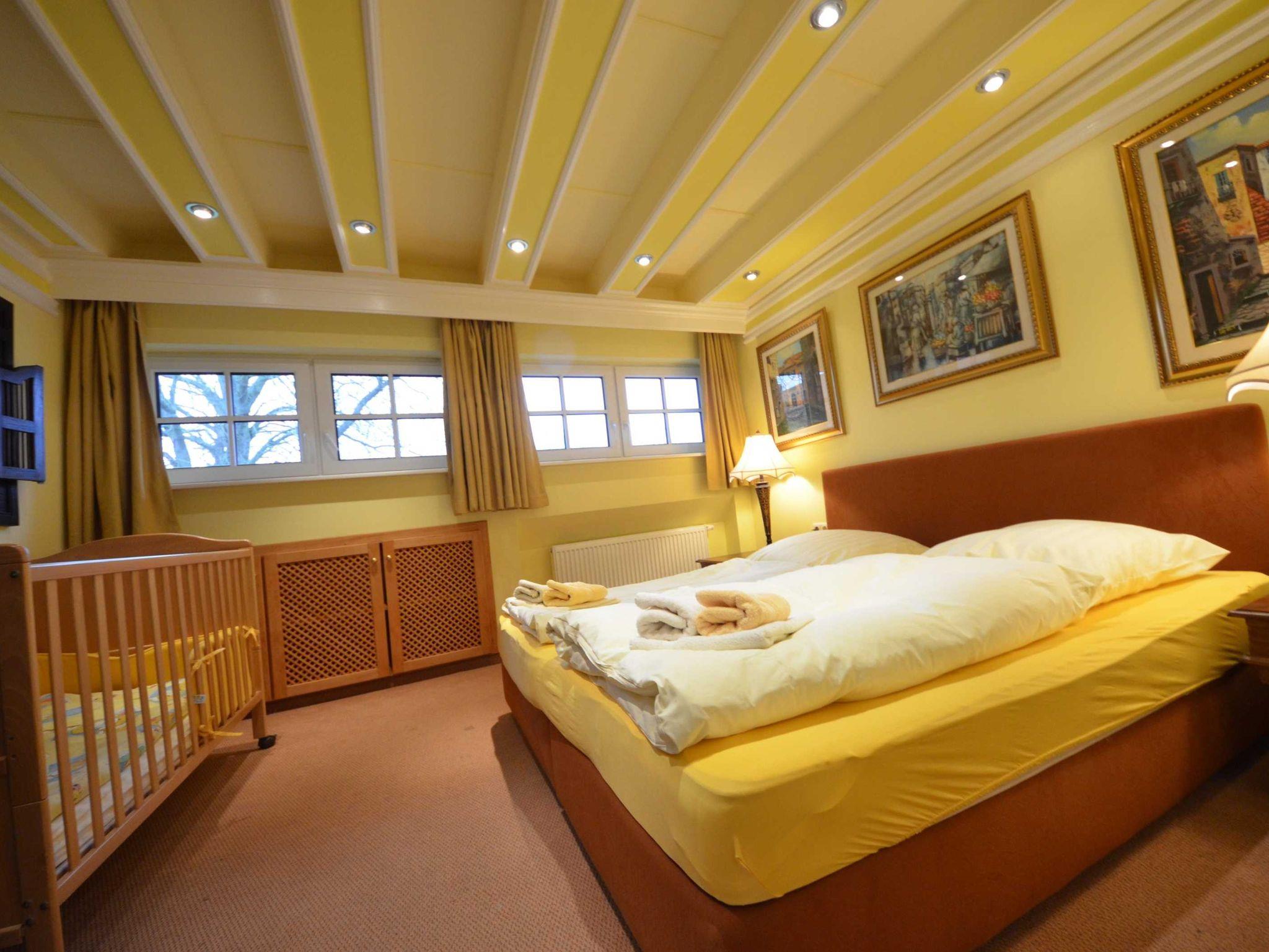 Schlafzimmer ein Babybett 70 x 140 (kostenlos) mit aufgezogener Bettwäsche.