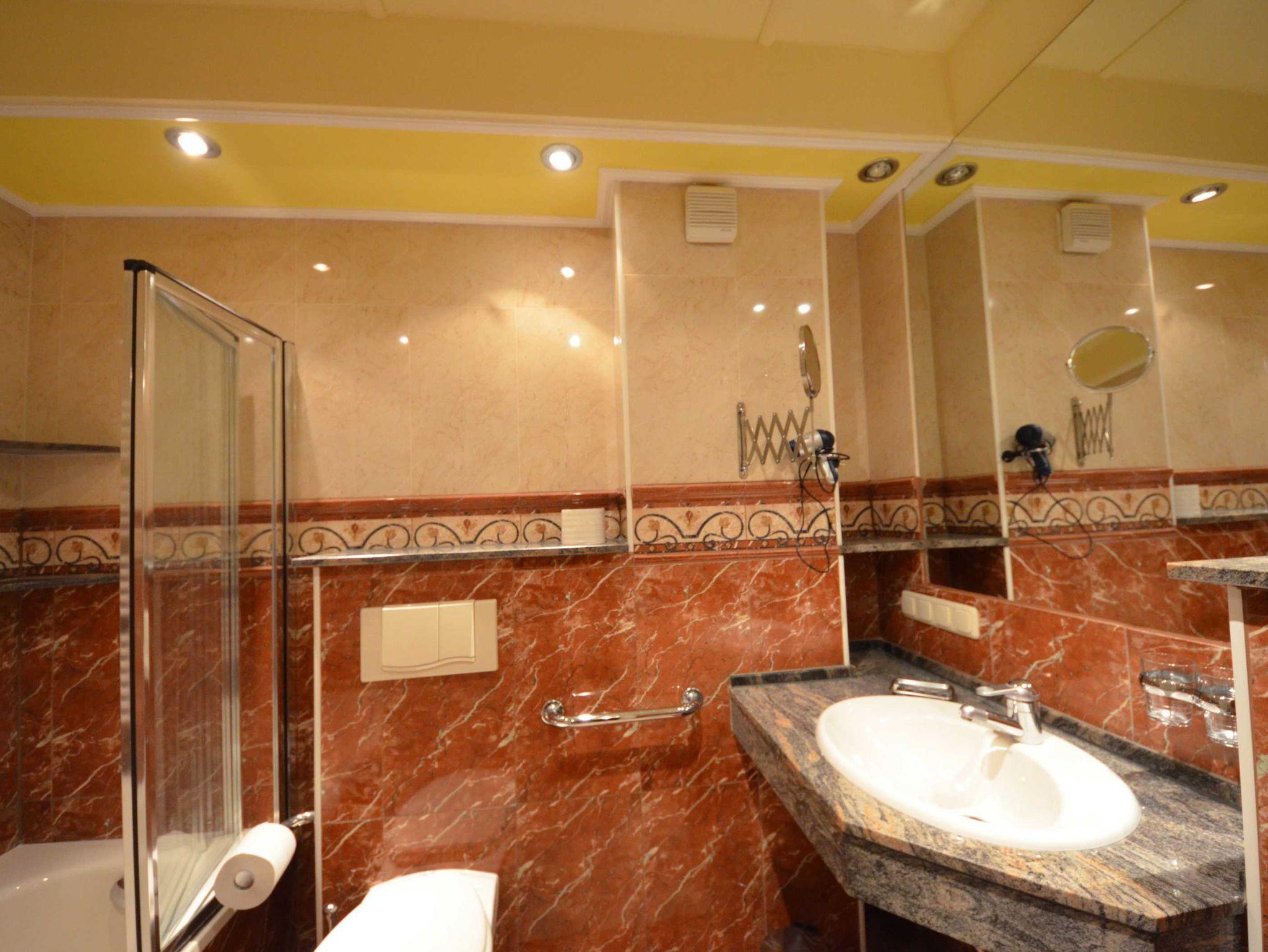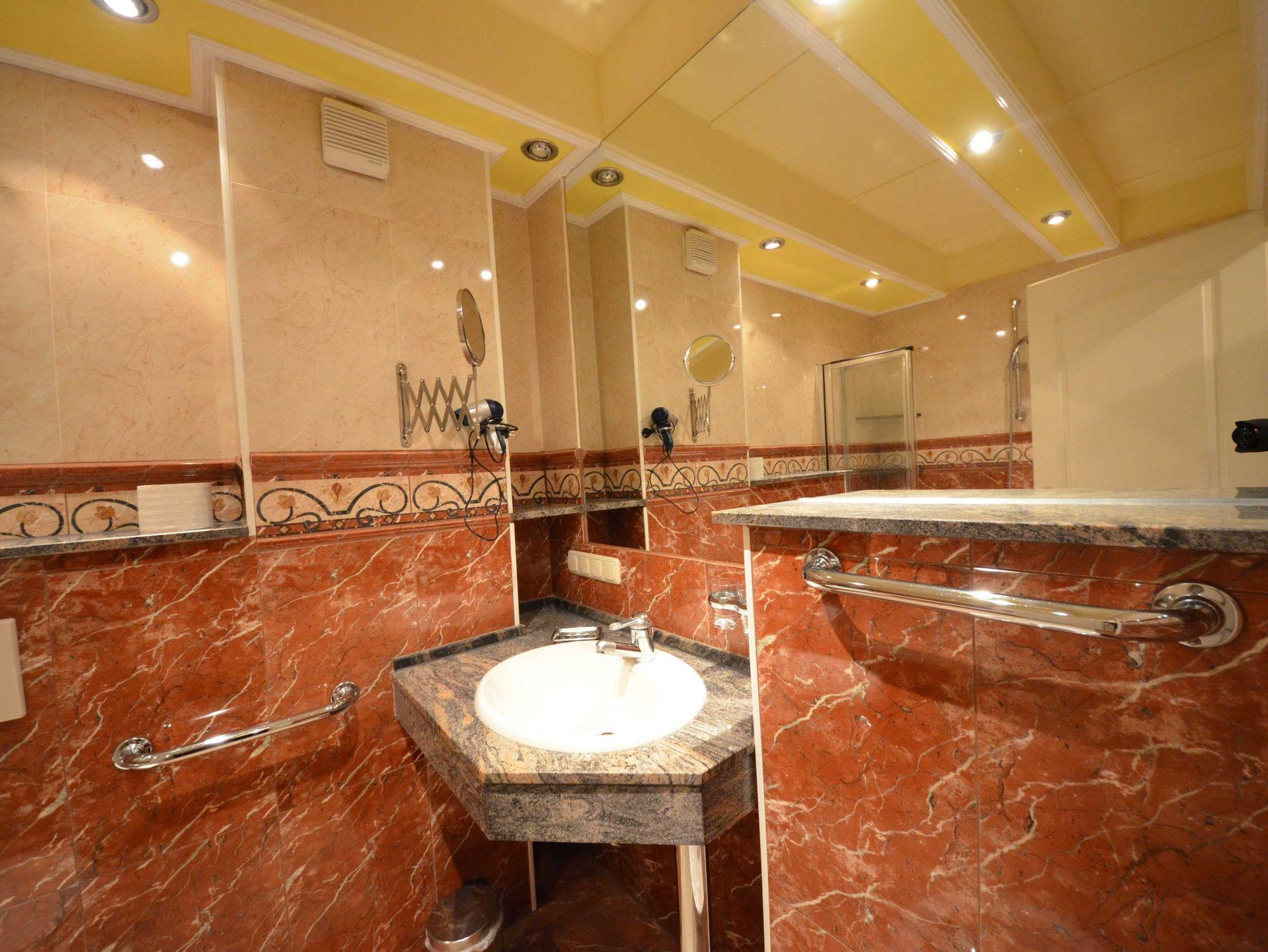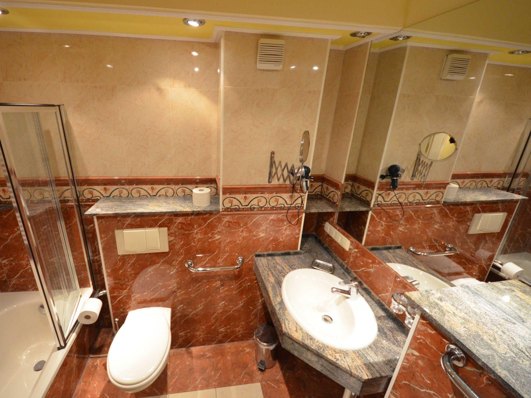 Bad mit Dusche aus Naturstein / Granit, große Spiegel, beheizbarer Handtuchhalter, Fön und Schminkspiegel