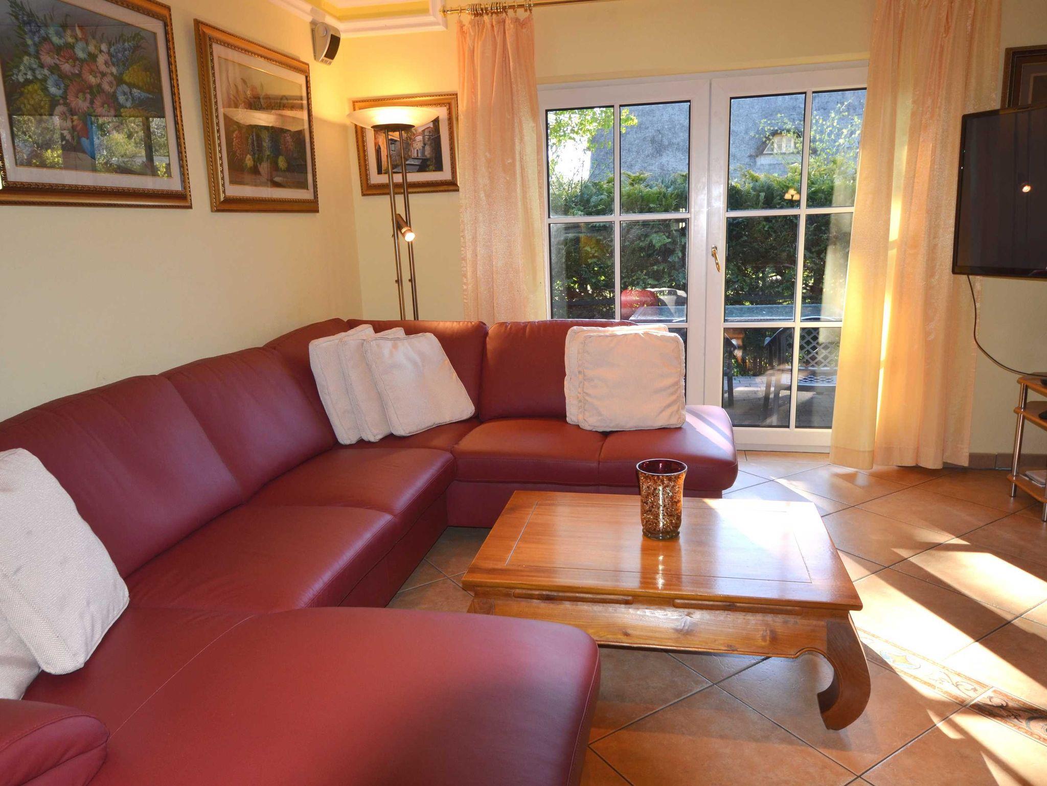 2 Bäder, Fußbodenheizung, schön eingerichtetes Wohn- Esszimmer, Couchgarnitur mit Leder bezogen, Opiumtisch, Speisetafel mit Stühlen, Geschirrschrank, Sat - TV, Telefon, Spiegel pp.