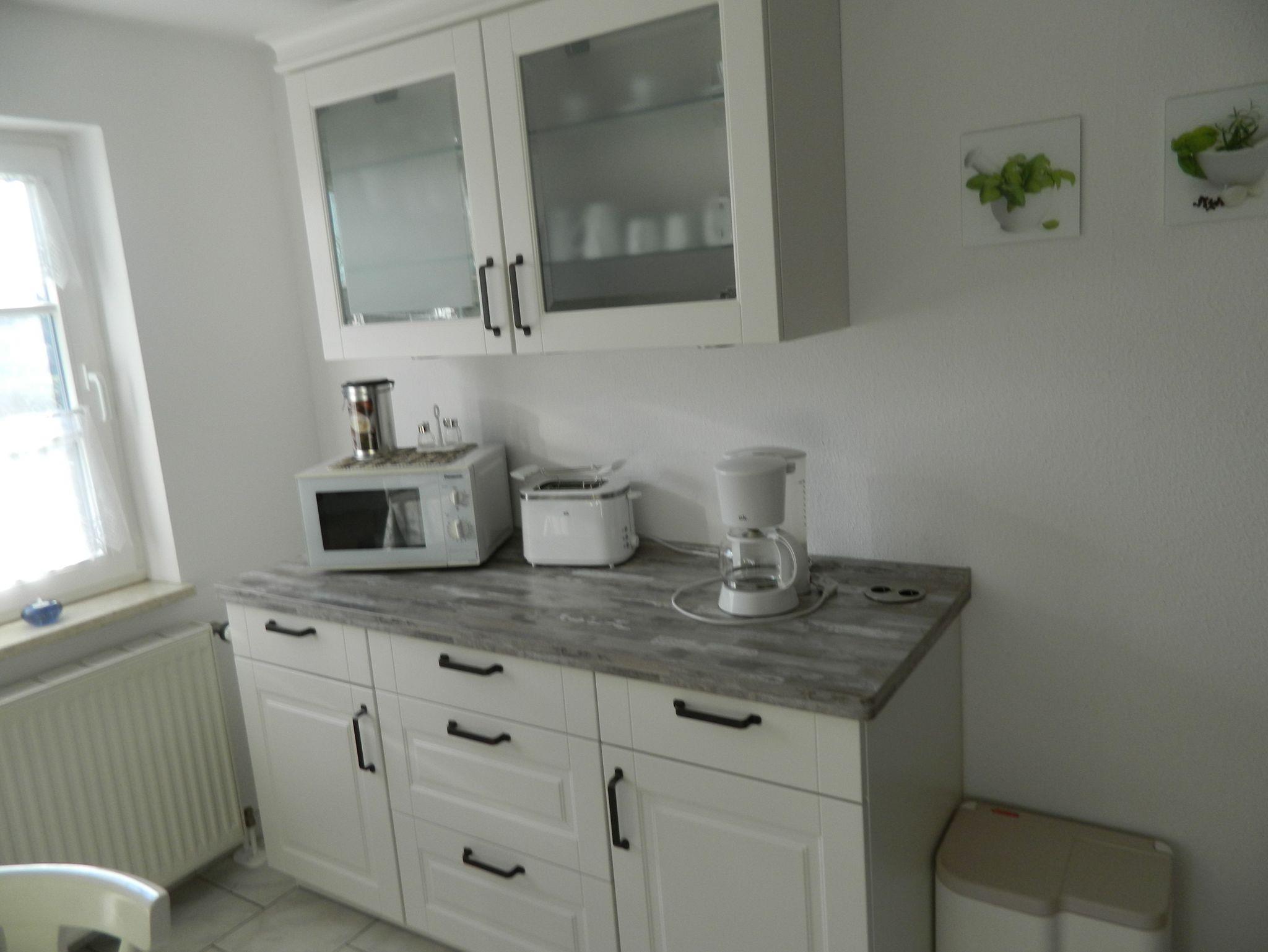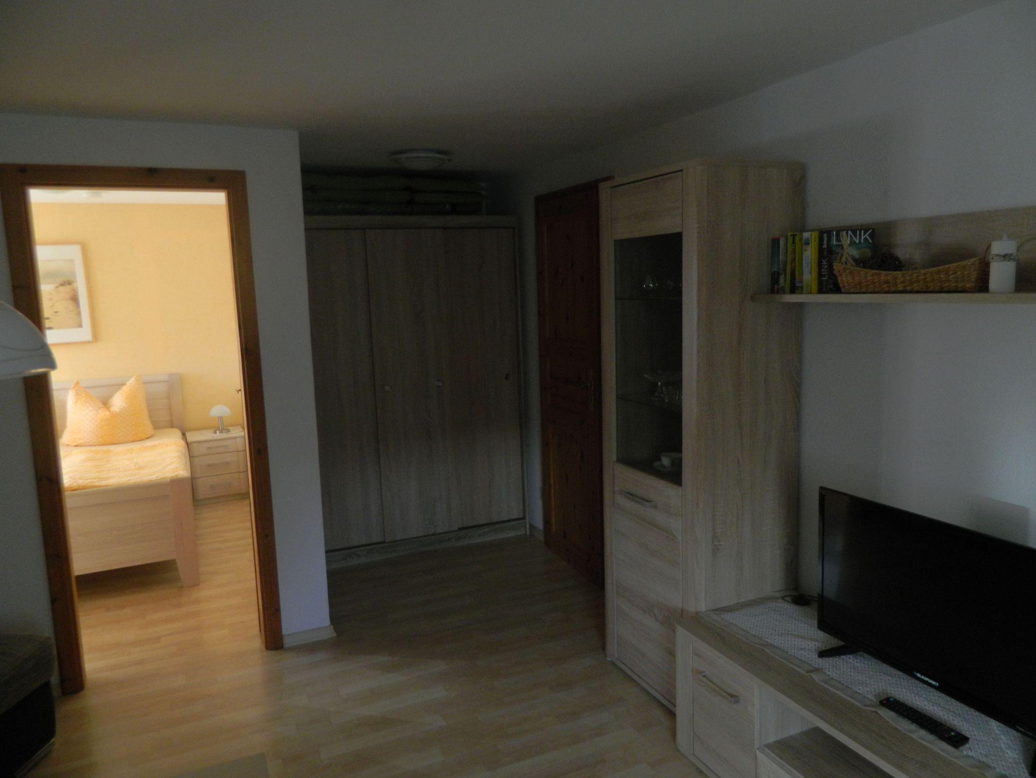 Sie besteht aus einem Schlafraum mit Doppelbett, einem Wohnraum mit Sitzecke und TV, einer abgeschlossenen komplett eingerichteten Küche mit Geschirrspüler, Mikrowelle, Kochplatte, Wasserkocher, Toaster und Kaffeemaschine, Bad mit Dusche/ WC und einem kleinen Flur.