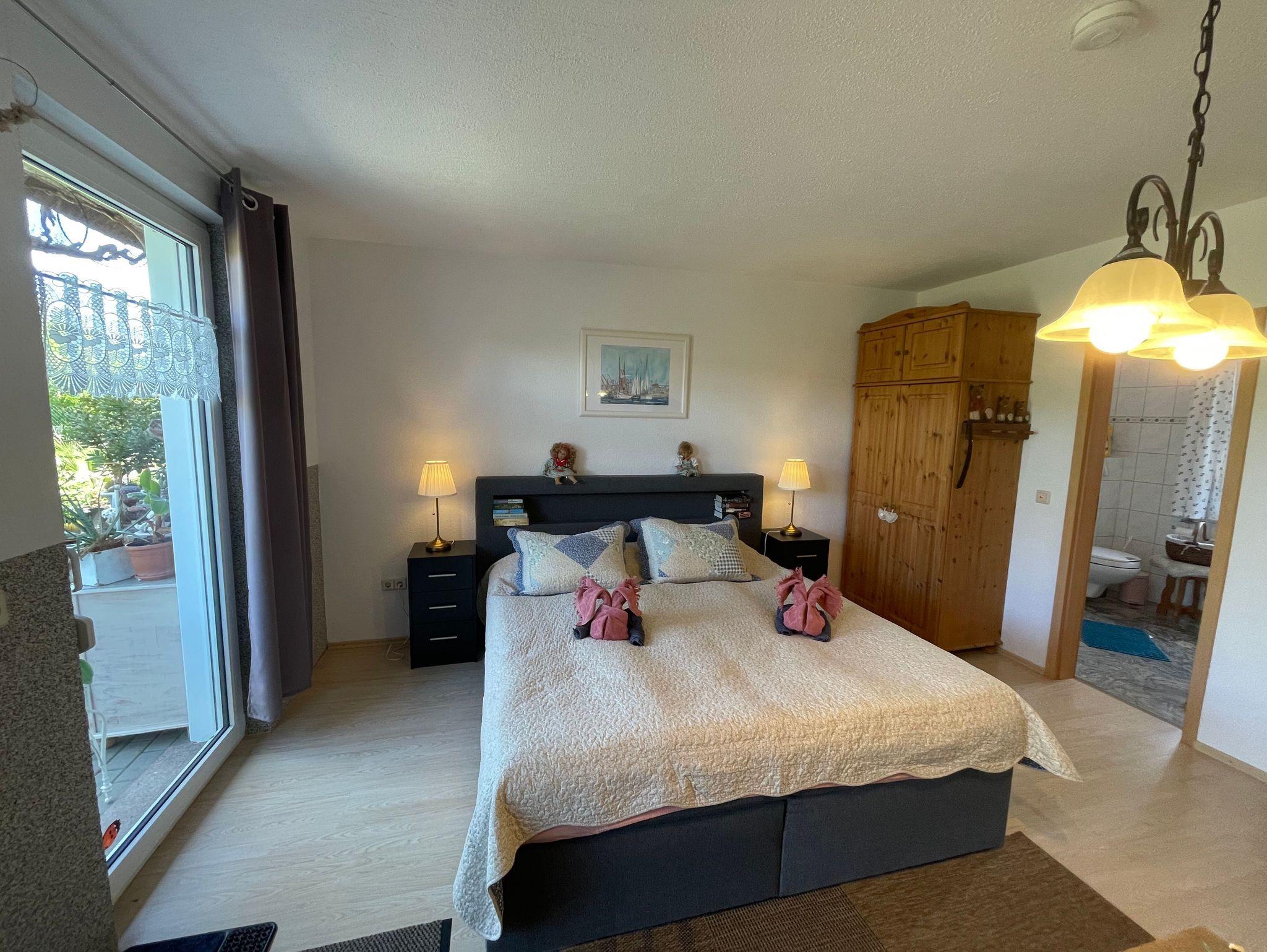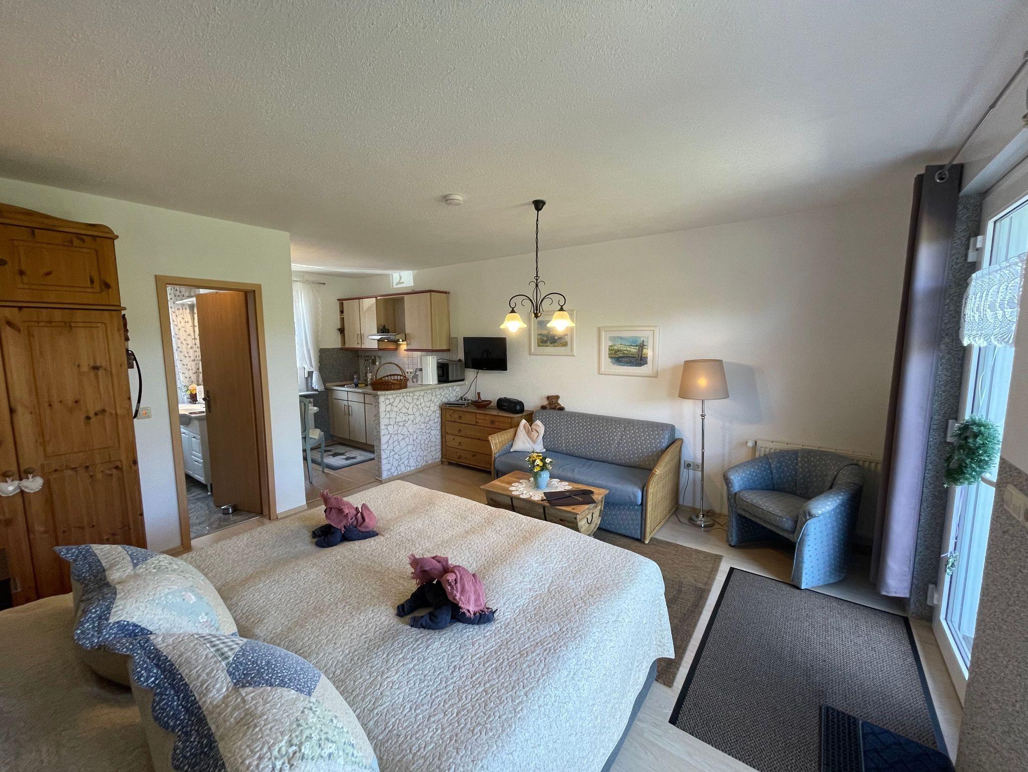 Das gemütliche 1 Raumappartement (Nichtraucher) bietet mit seinen ca. 28 qm ausreichend Platz für 2 Personen. Der Wohn- Schlaf- & Essbereich umfasst ein Doppelbett (Boxspring 180x200) mit Nachtischkonsolen, einen Kleiderschrank sowie eine geschmackvolle Couchecke mit Sessel und Couchtisch und ein TV-Gerät. Angrenzend befindet sich die Einbauküchenzeile mit einem 2-Plattenherd, Abzugshaube, kleinen Backofen, Spüle, Kaffeemaschine, Wasserkocher, Toaster sowie diverse Küchenutensilien. Das geflieste Tageslichtbad verfügt über eine Dusche, WC, Waschtisch und einen Fön. WLAN inklusive. Die bestuhlte und eigene Terrasse lädt zum Verweilen ein. Das separate und gemütliche Blockhaus auf dem Grundstück der Vermieter, steht allen Gästen der Pension zur Verfügung. Ein gemütlicher Grillabend findet in der Saison 1 x wöchentlich zusammen mit den Verfügung statt. Genauere Informationen erhalten Sie vor Ort.