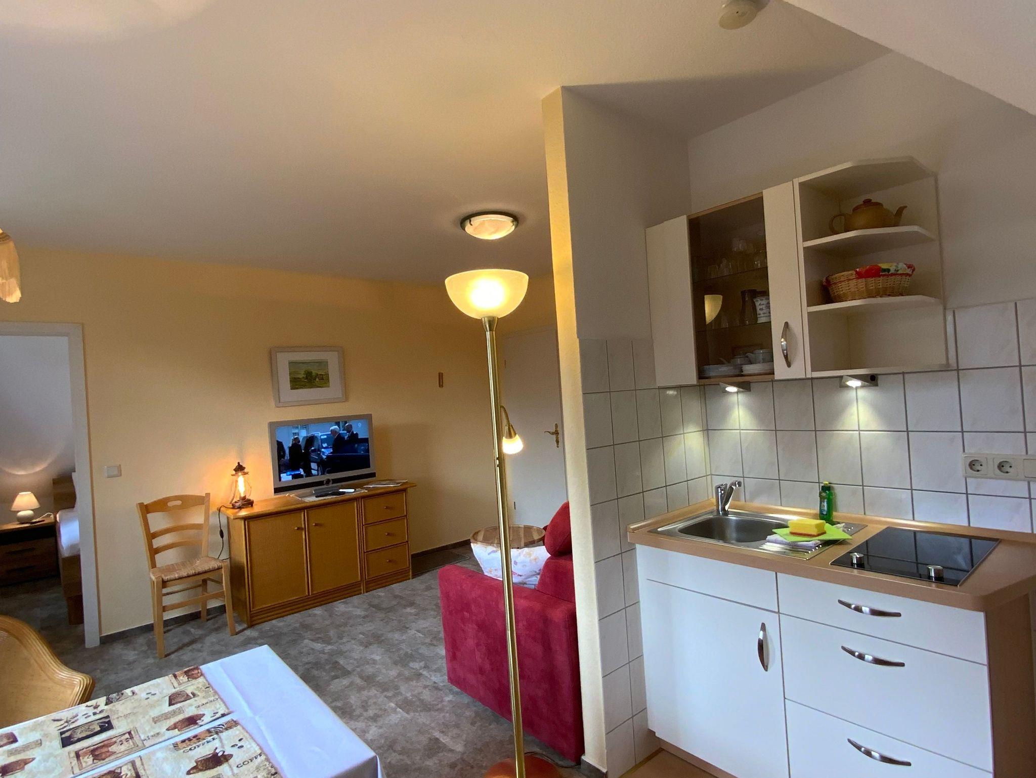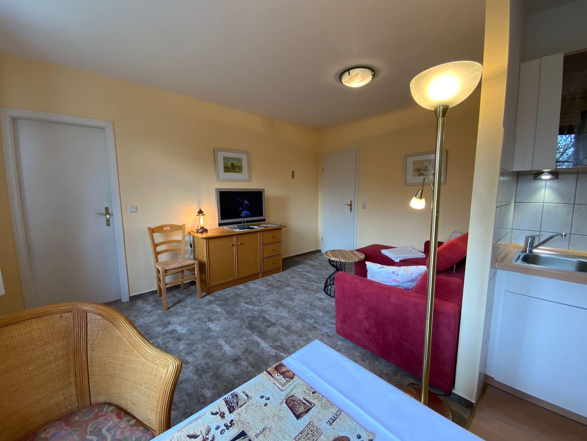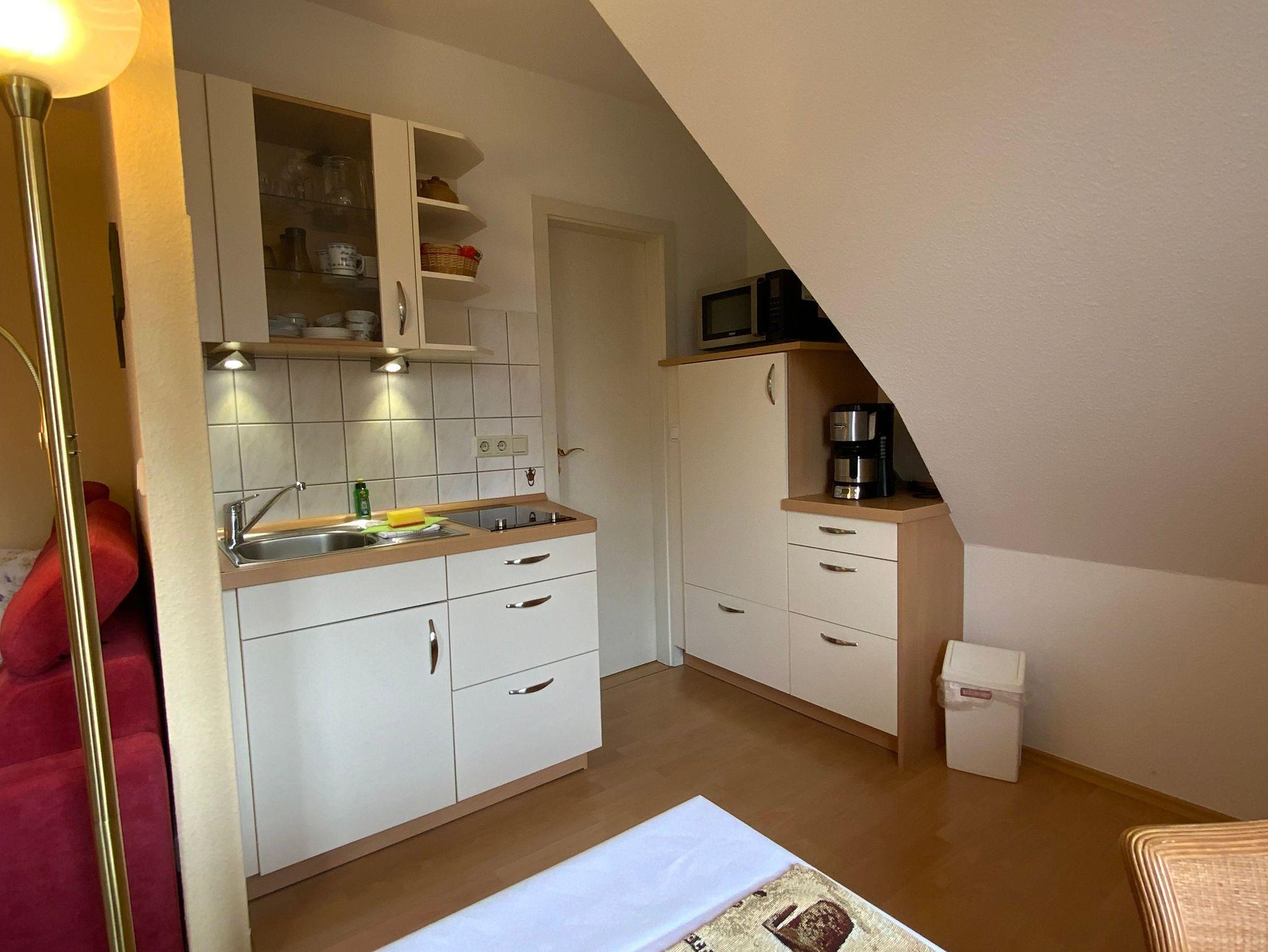 Die Ferienwohnung befindet sich im Obergeschoß und besteht aus einem Wohnraum mit Sitzgruppe und TV sowie einem Schlafraum mit einem Doppelbett. Die Ferienwohnung verfügt zudem über ein Duschbad und eine moderne Küchenzeile. Auf dem großen Grundstück steht Ihnen eine Liege und Spielwiese sowie ein Grillplatz zur Verfügung.