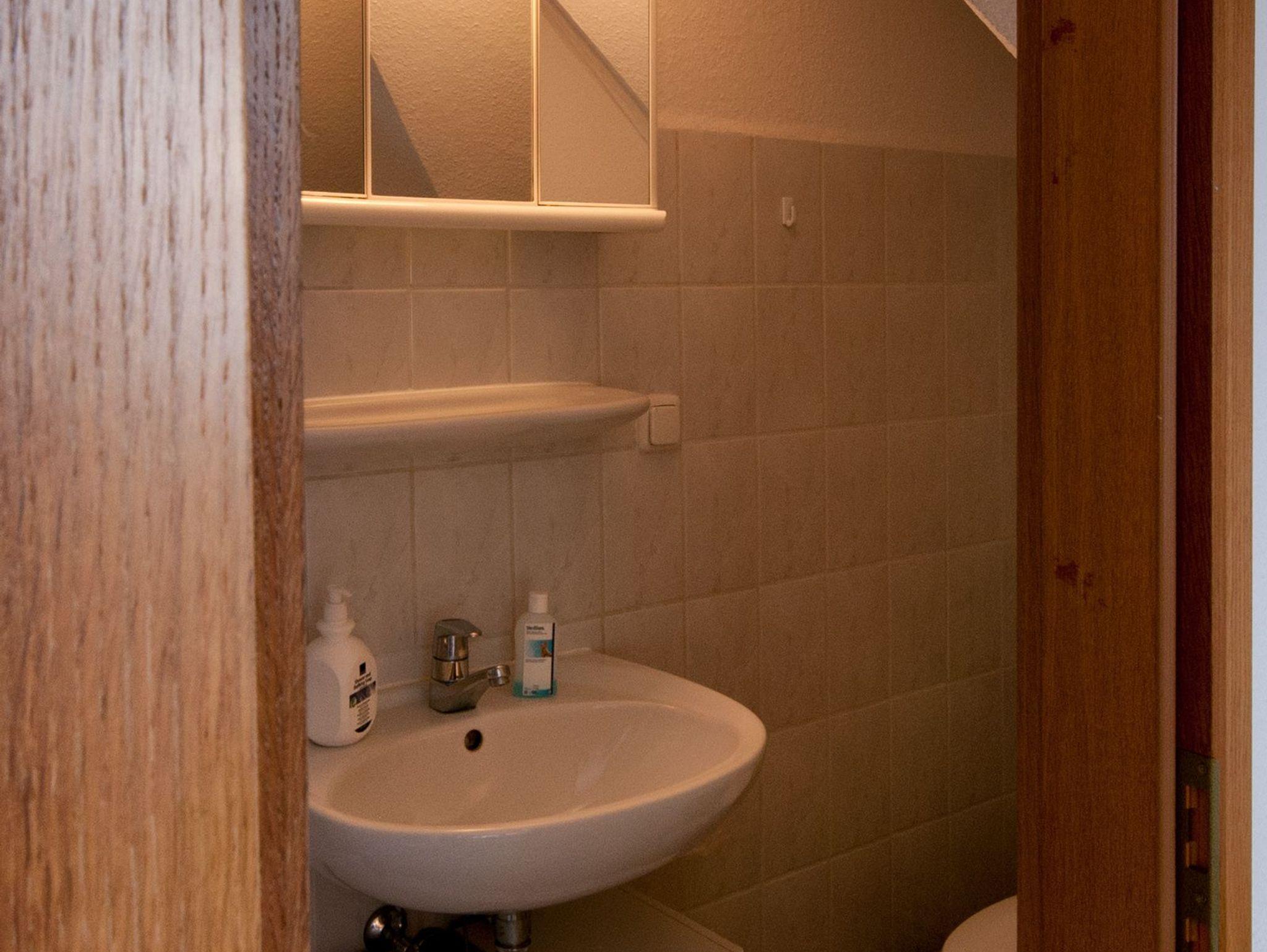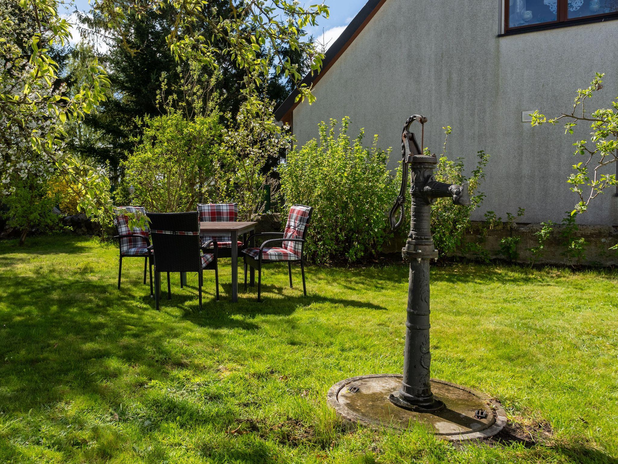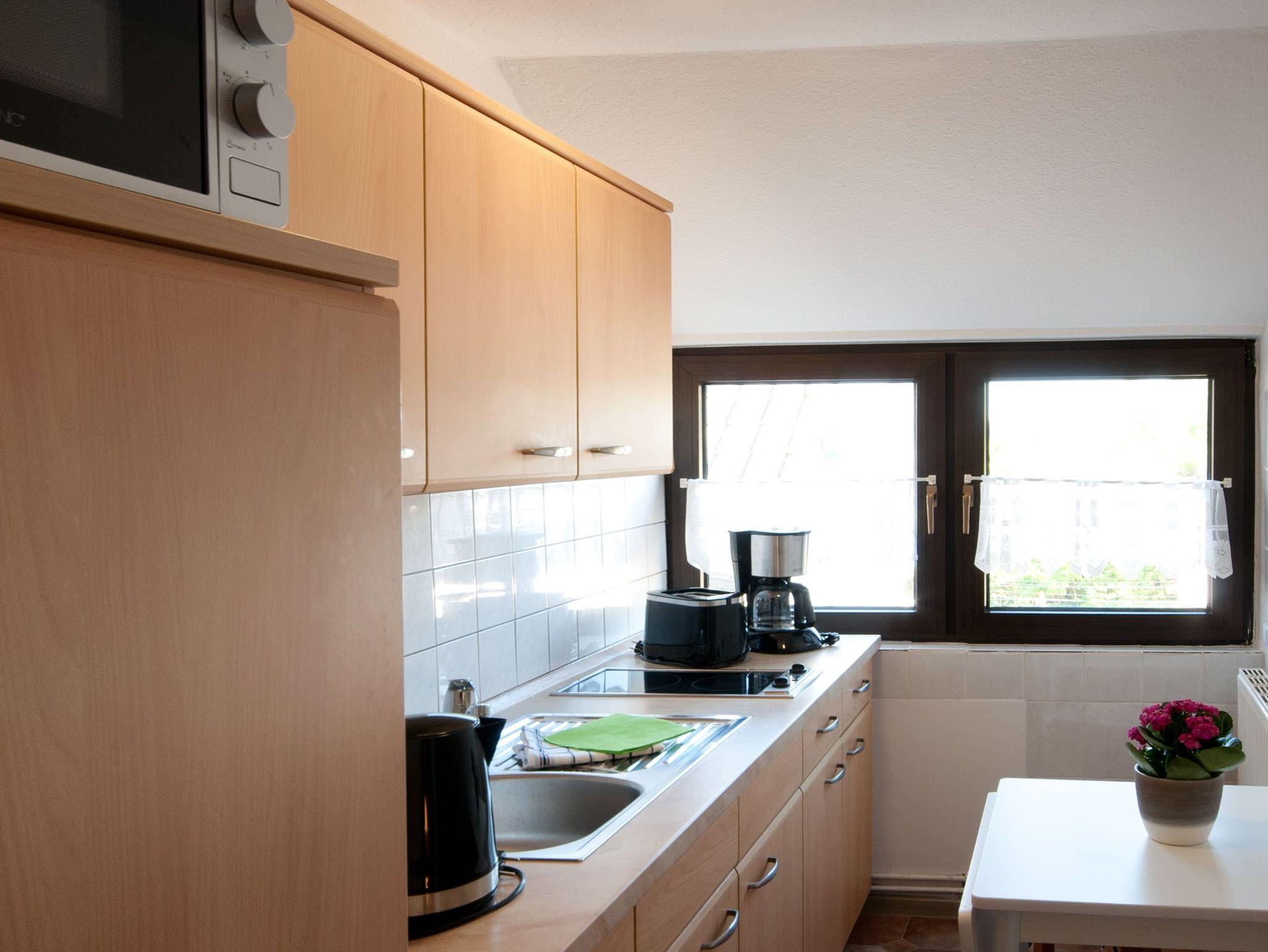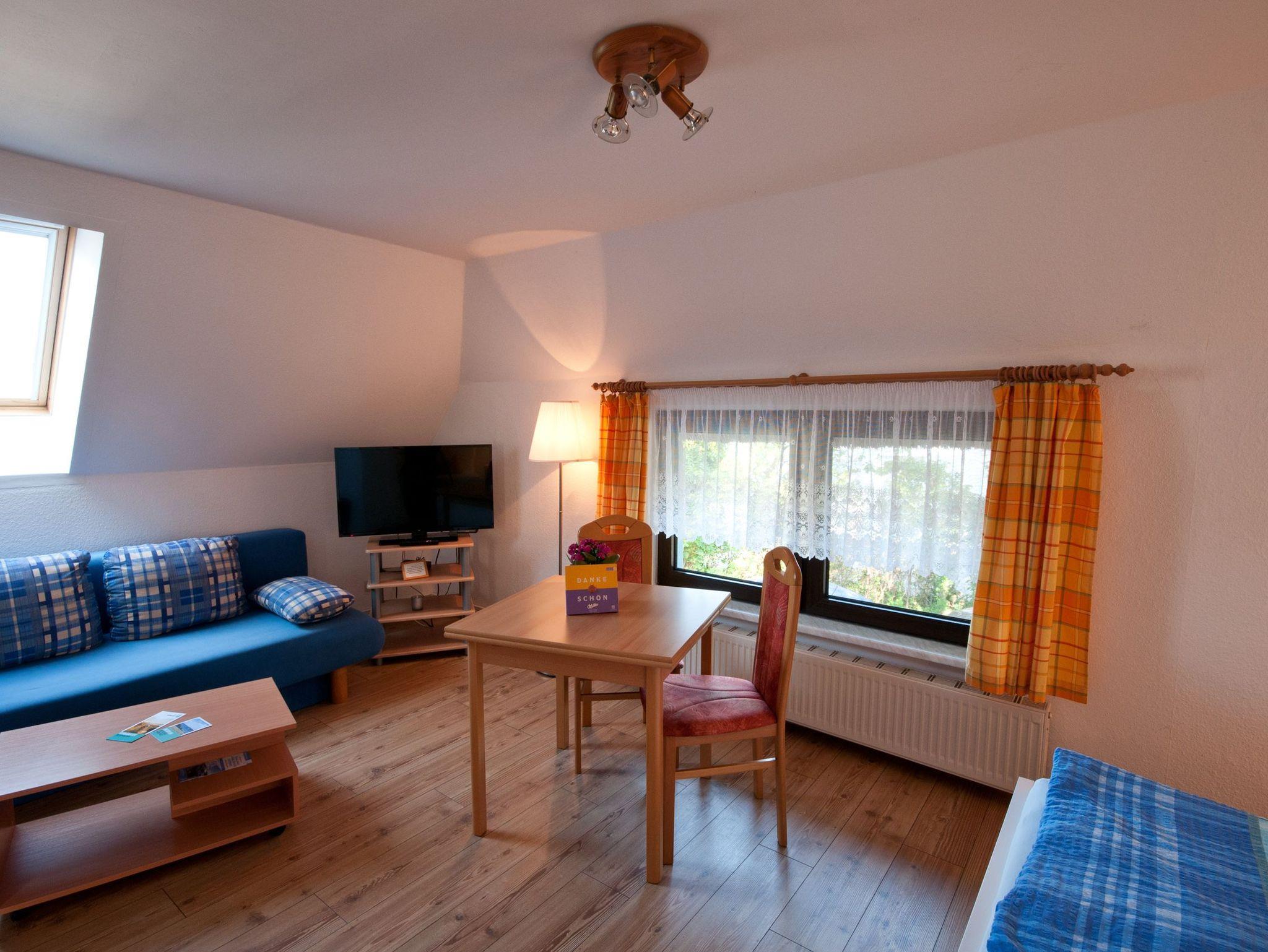 Unser Apartement in der oberen Etage im reetgedeckten Haus besteht aus einem kombinierten Wohnraum/Schlafraum mit Sat-TV, einer Küche sowie Bad mit Dusche und WC und einem separaten Eingang. In der Einbauküche sind ein 2- Platten Herd, Spüle, Kühlschrank sowie Kaffeemaschine, Toaster und Wasserkocher. Zu dem Apartement gehört ein Platz mit Sitzgruppe im Garten. Autostellplätze und Grillmöglichkeiten befinden sich auf dem Grundstück.