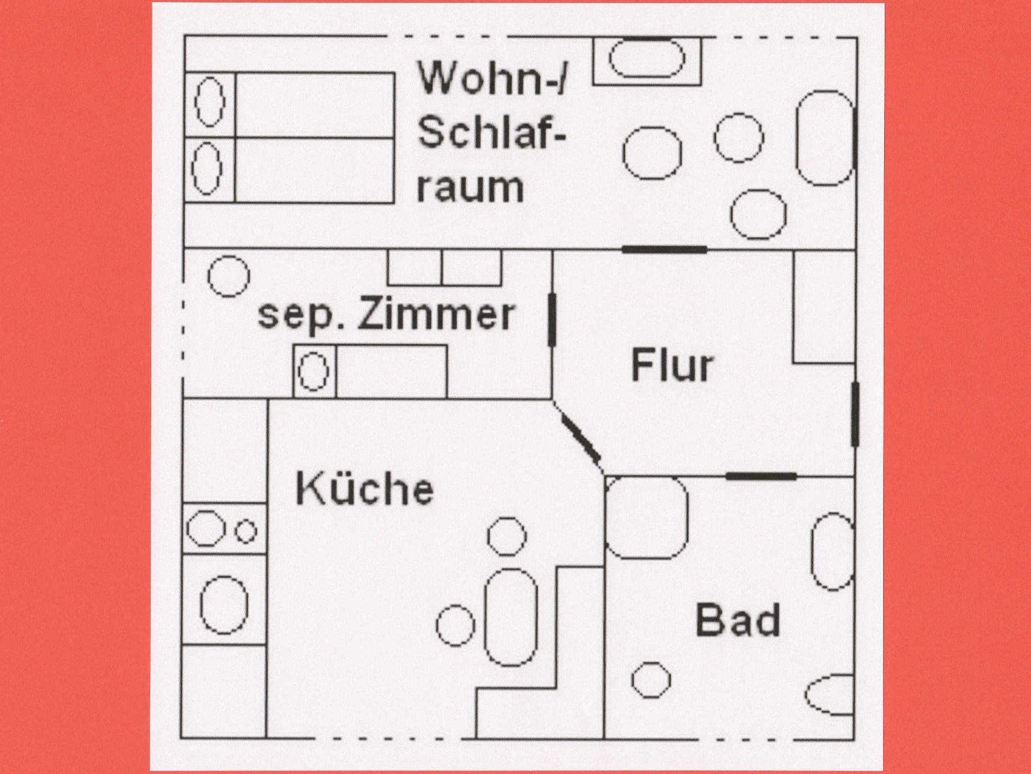 1 kombinierter Wohn-/Schlafraum mit Doppelbett (2x 0,90m x 2,00m), Sitzgelegenheiten, FLAT-TV (SAT) und einer Terrassentür mit direktem Zugang zum Garten.