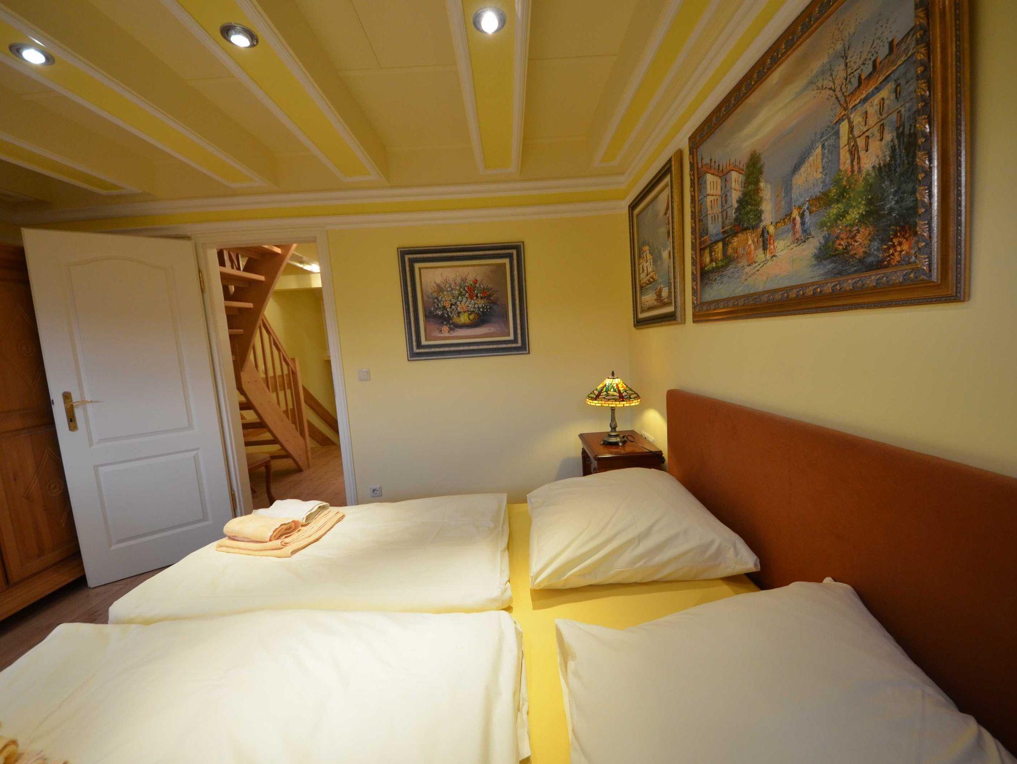 Doppelbetten jeweils 160 x 200 und 180 x 200, mit aufgezogener Bettwäsche. Radiowecker, mit Bildern dekoriert. Große Ganzkörperspiegel.