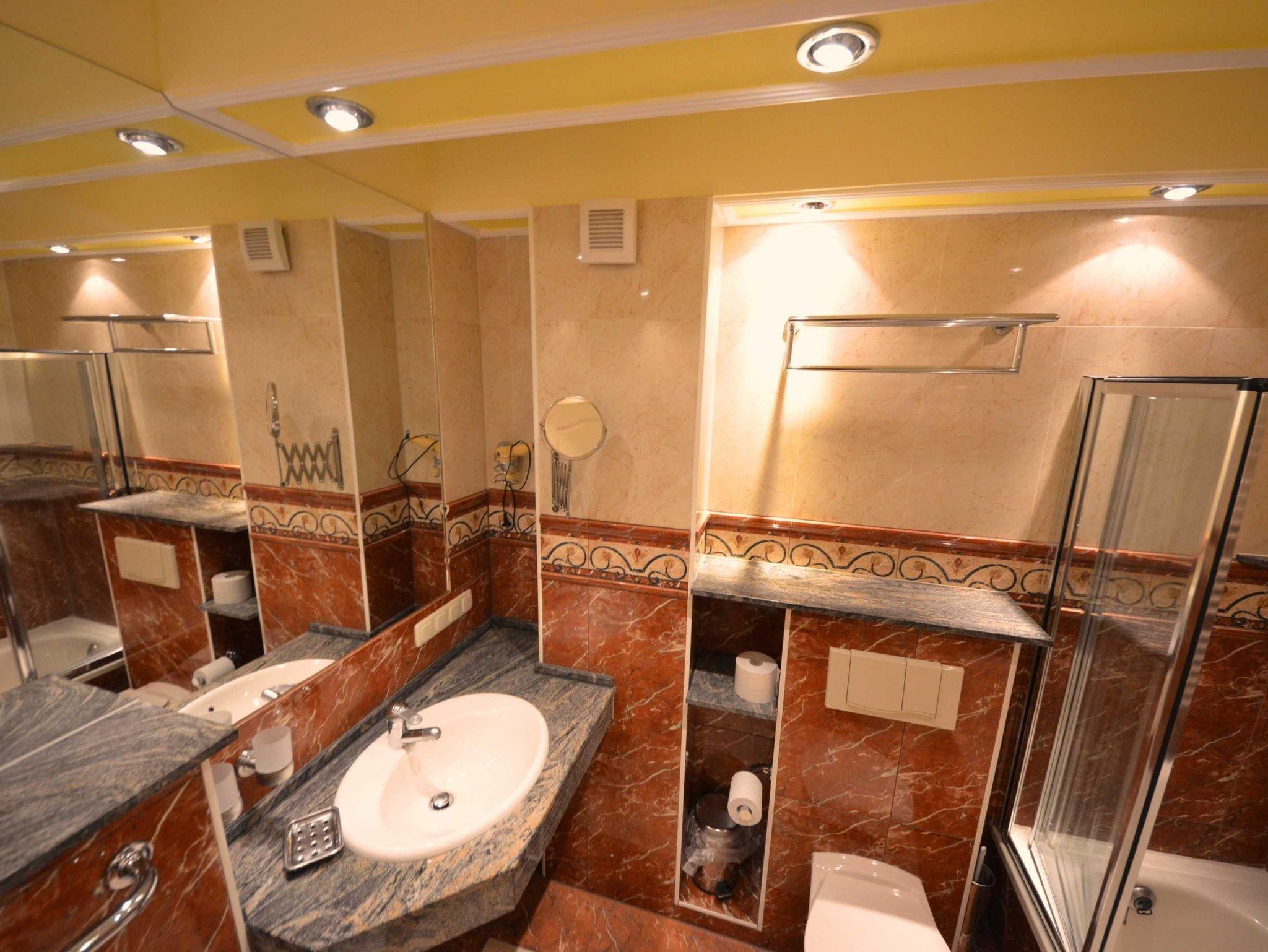 Bad mit Dusche aus Naturstein / Granit, große Spiegel, beheizbarer Handtuchhalter, Fön und Schminkspiegel