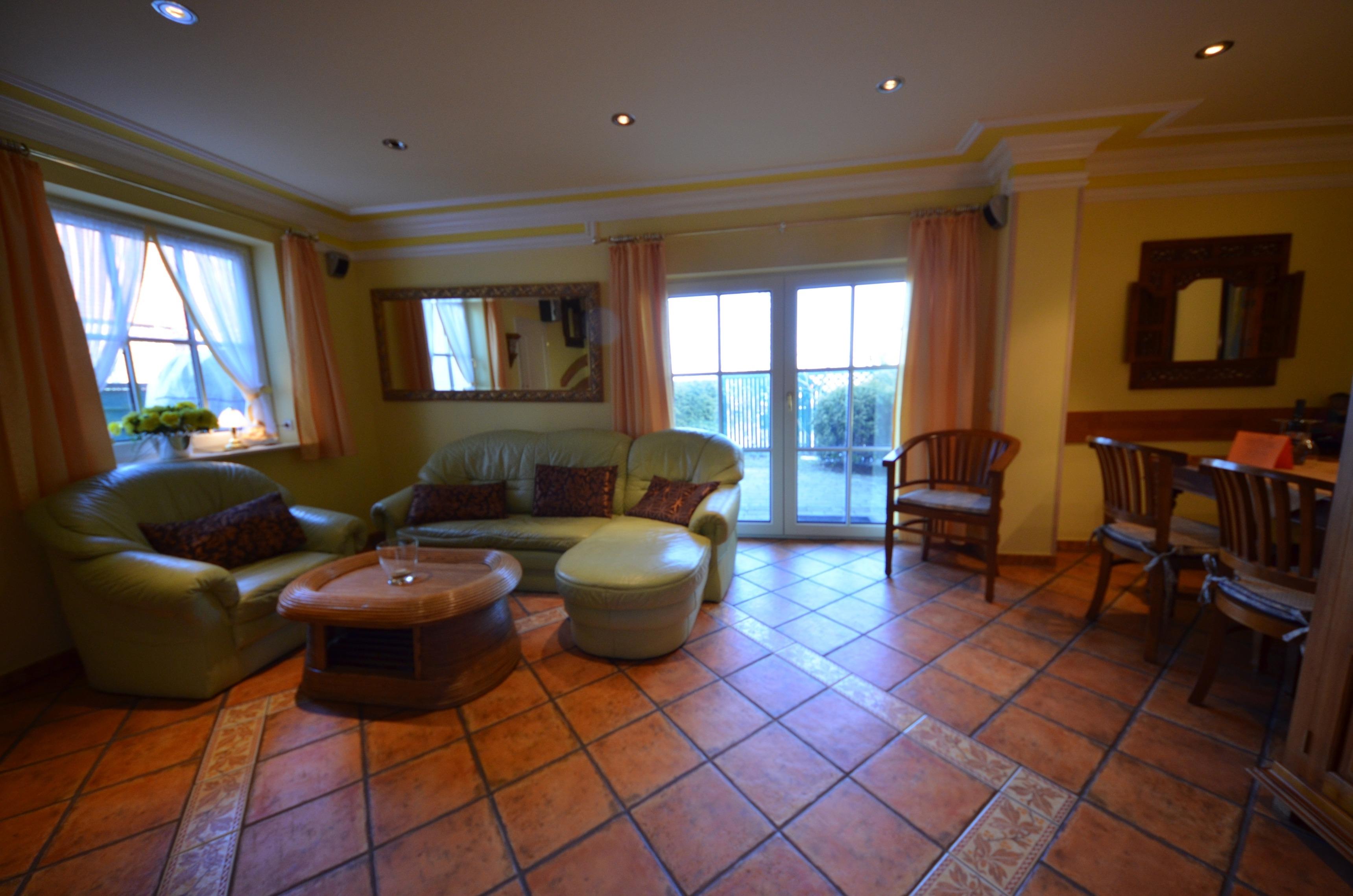 Eingangsflur mit Garderobe und Schuhschrank. Fußbodenheizung, großzügiges Wohn- Esszimmer, schöne Couchgarnitur mit Opiumtisch, Esstisch mit 5 Stühlen, Geschirrschrank, Satt - TV mit 82-106 cm Großbild mit ca.40 Programmen, Stereoanlage, CD - Player, Telefontisch mit Telefon und balinesischem Spiegel pp. Kinderhochstuhl, Wände dekoriert mit Bildern, Ausgang zur Terrasse
