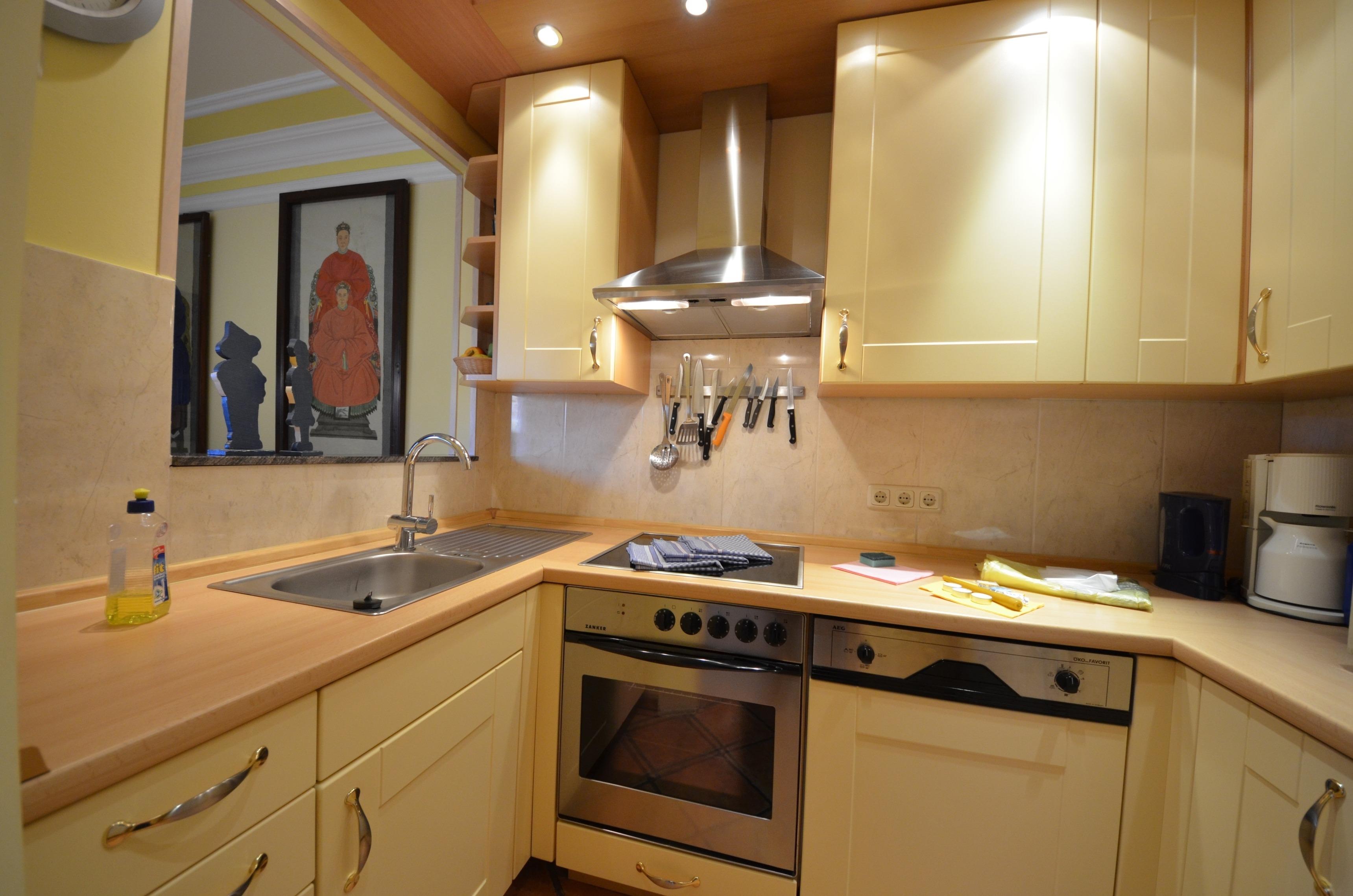 Schöne vanillefarbene Landhaus-Einbauküche, Geschirrspüler, Mikrowelle, Herd mit Ceran - Kochfeld und Backofen, Turmhaube, Kühlschrank mit Gefrierfach, 2 Kaffeemaschinen, Wasserkocher, Eierkocher, Toaster, Waffeleisen, Mixer, Schnellkochtopf, geschmackvolles Geschirr. Teilweise Gewürze und Geschirrtücher.