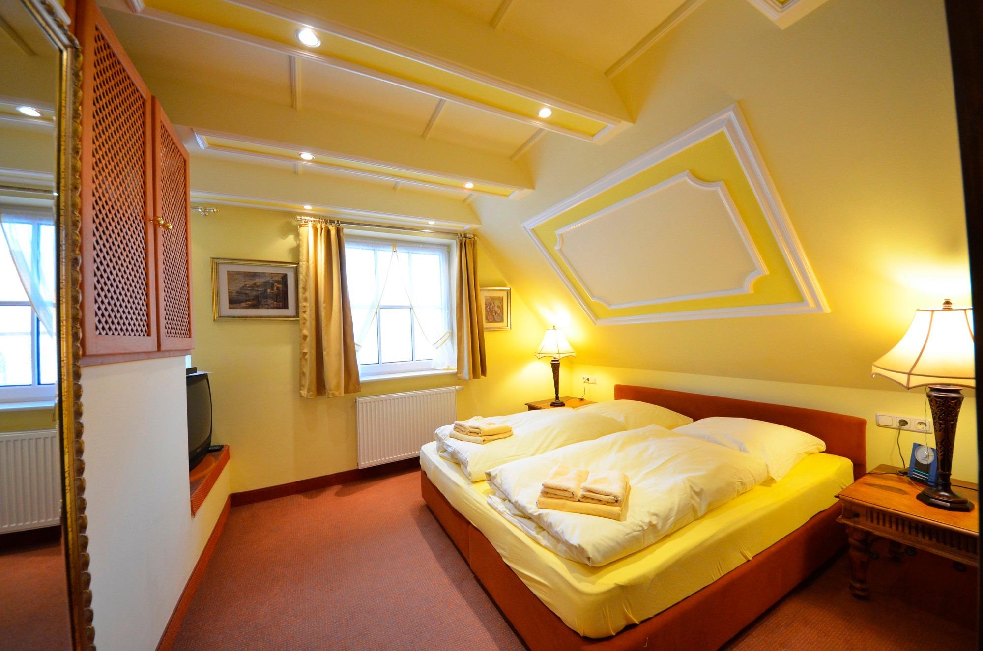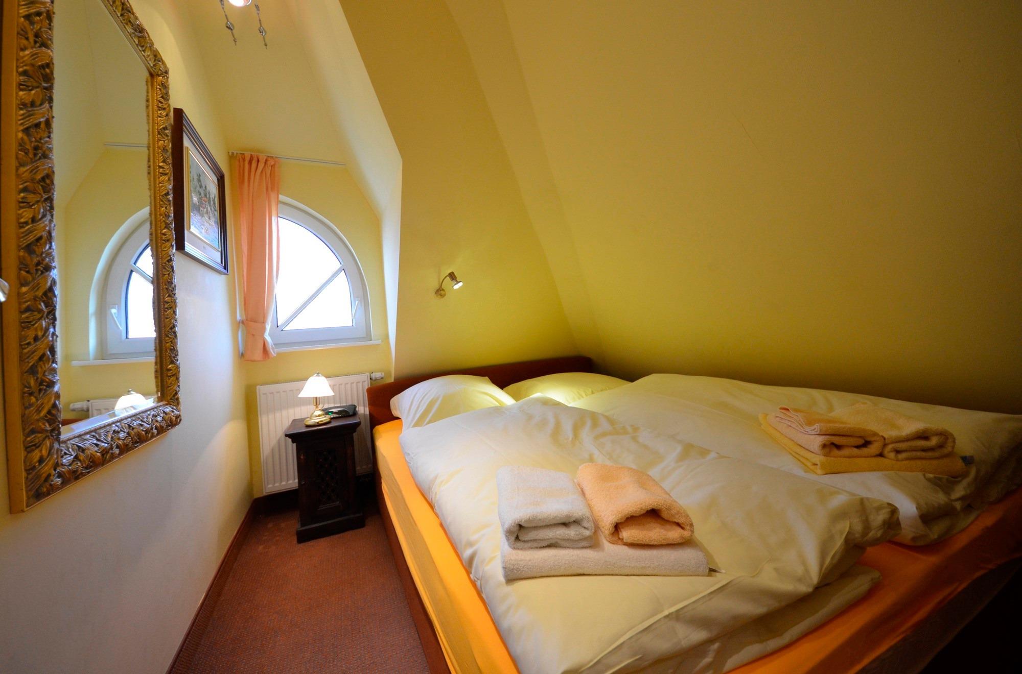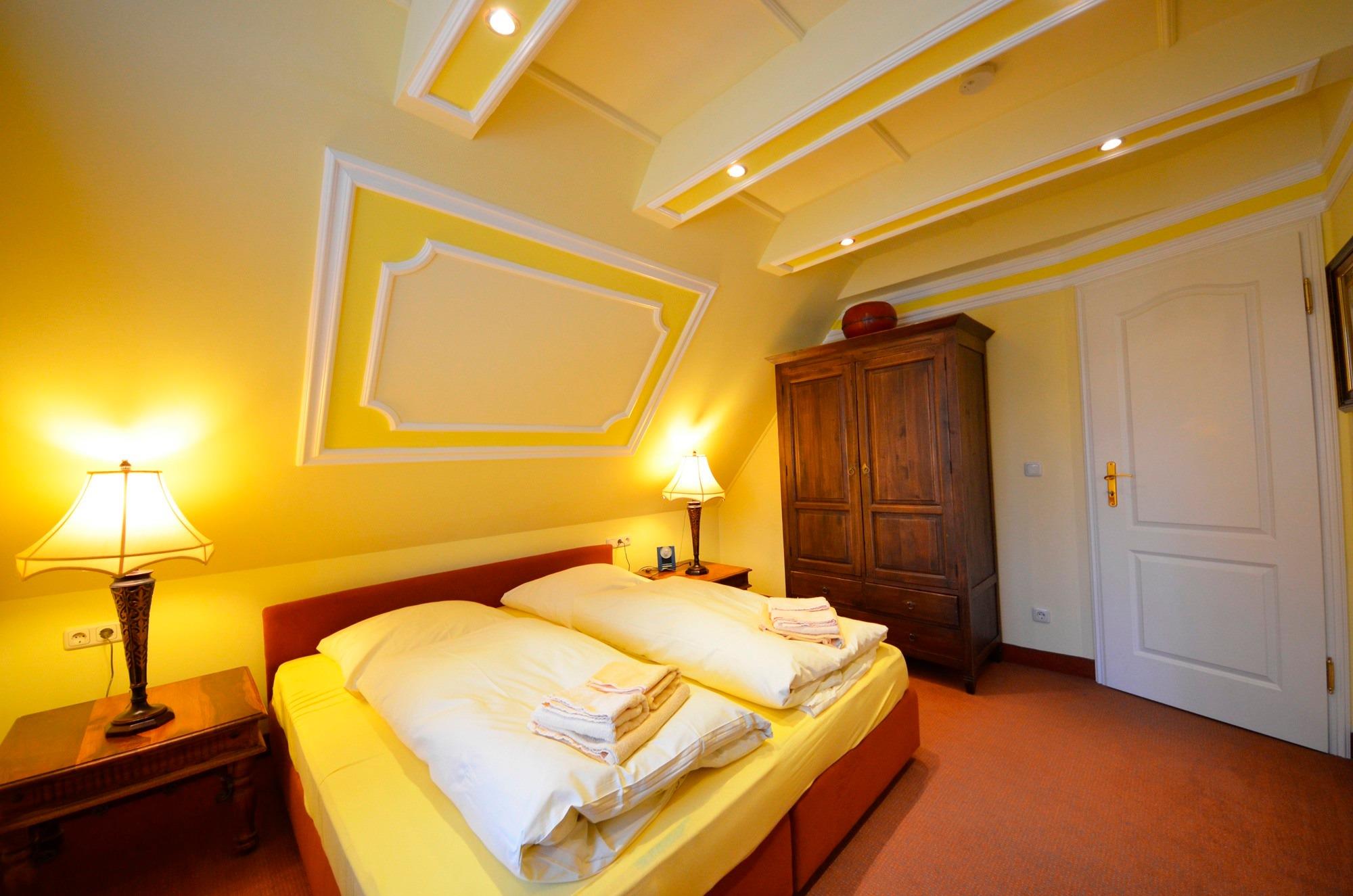 2 kleine, schräge aber gemütliche und helle Zimmer mit Einbauschränken, einmal mit Einzelbett 90 x 200 und einmal mit einem Doppelbett 160 x 200 cm. Bettwäsche aufgezogen.
