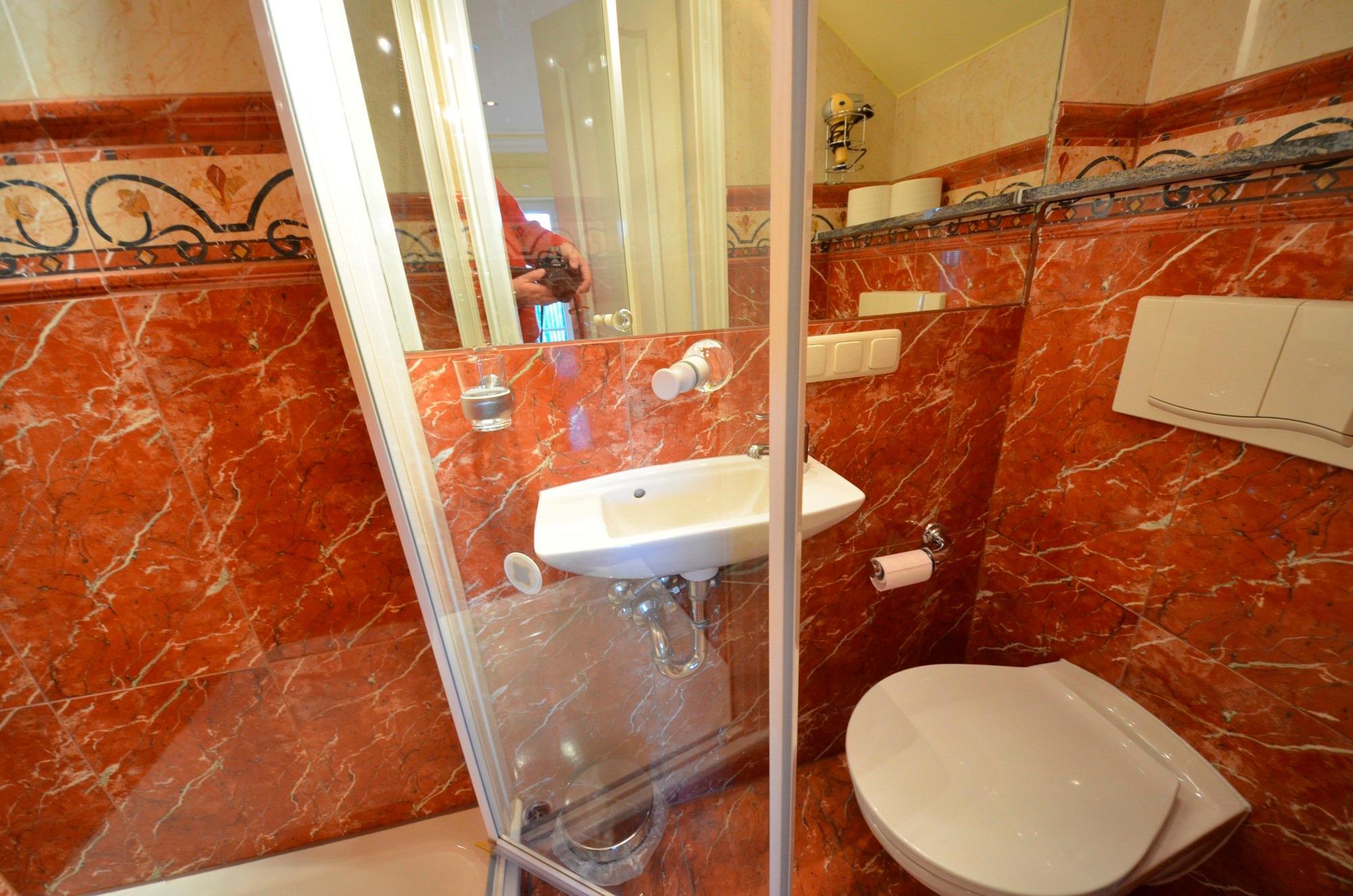 Fußbodenheizung, Naturstein - Abdeckungen, große Spiegel, schöne Sanitärausstattung, Einbau-Waschbecken mit Granitabdeckungen, beheizbarer Handtuchhalter, Glasdusche mit Sitzmöglichkeit, Bidet, Fön, Schminkspiegel