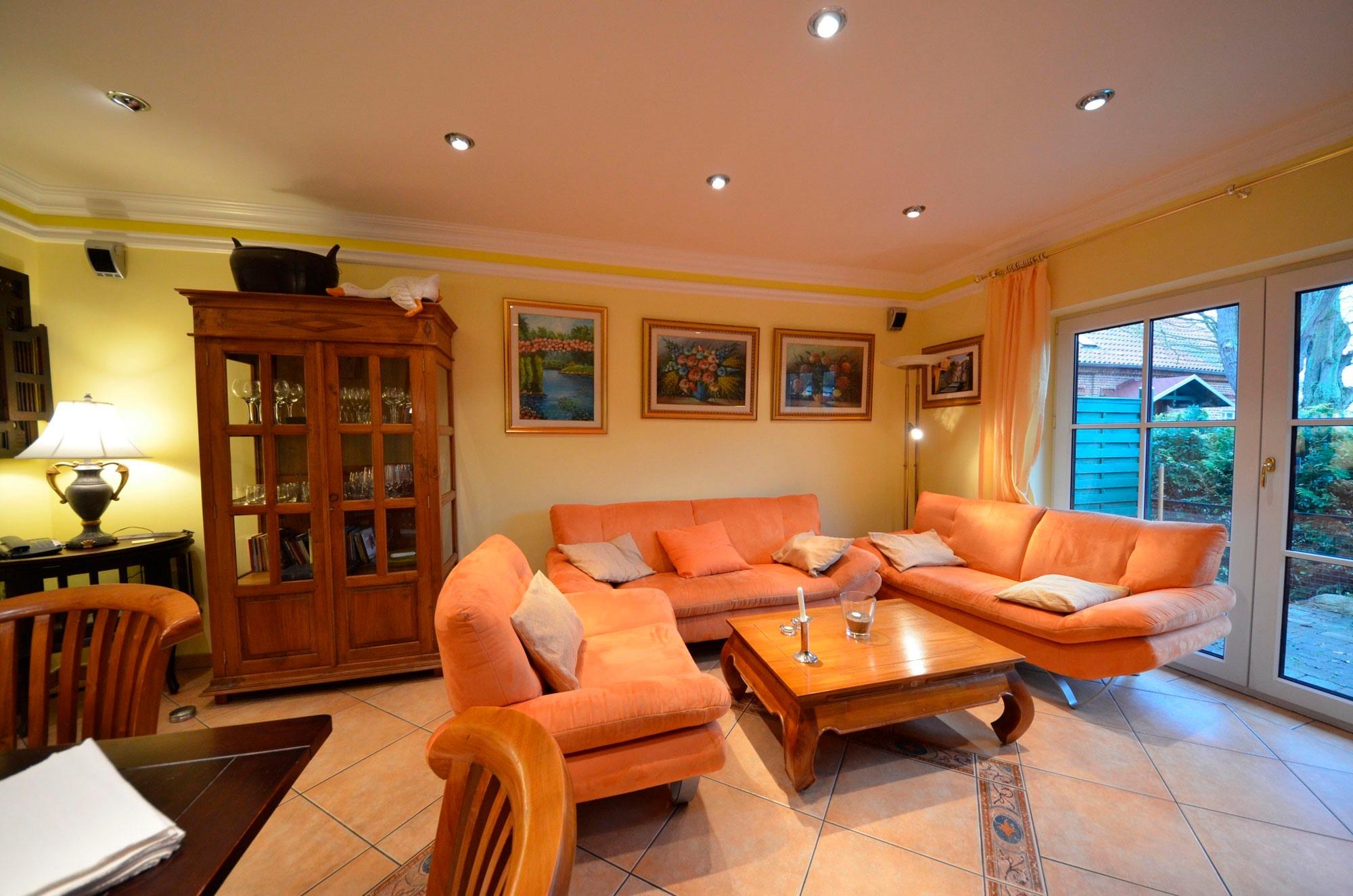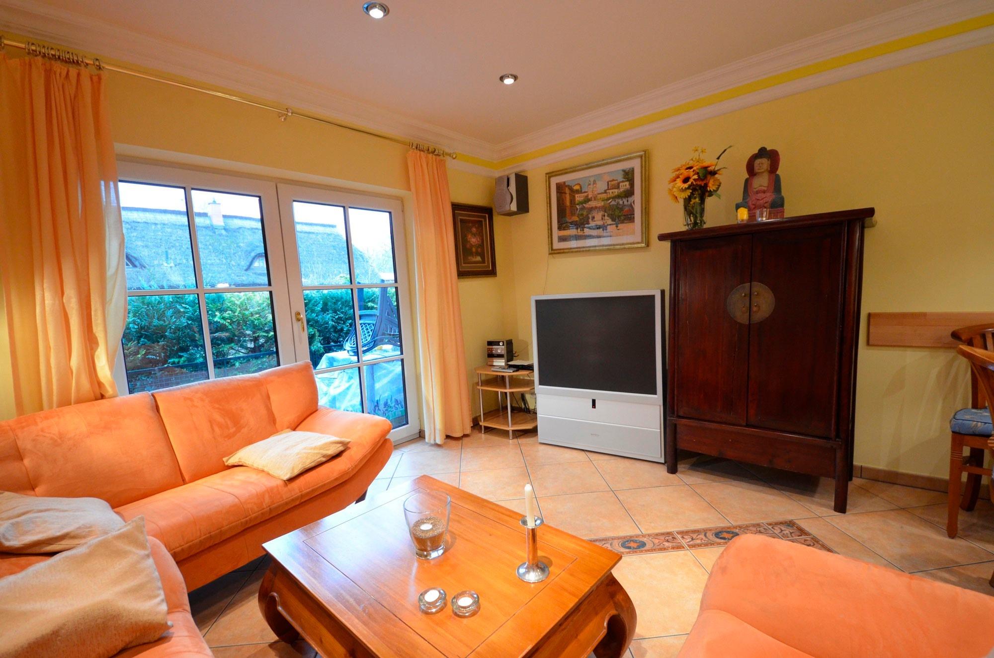 mit Fußbodenheizung schöne Couch-Garnitur mit Opiumtisch, Esstisch m. Stühlen Geschirrschrank, Sat - TV mit ca. 40 Programmen, Video -Recorder, Stereoanlage, CD - Player, Telefontisch mit Telefon und balinesischem Spiegel pp. Kinderhochstuhl, Wände dekoriert mit Bildern, Terrasse mit Gartenmöbeln.