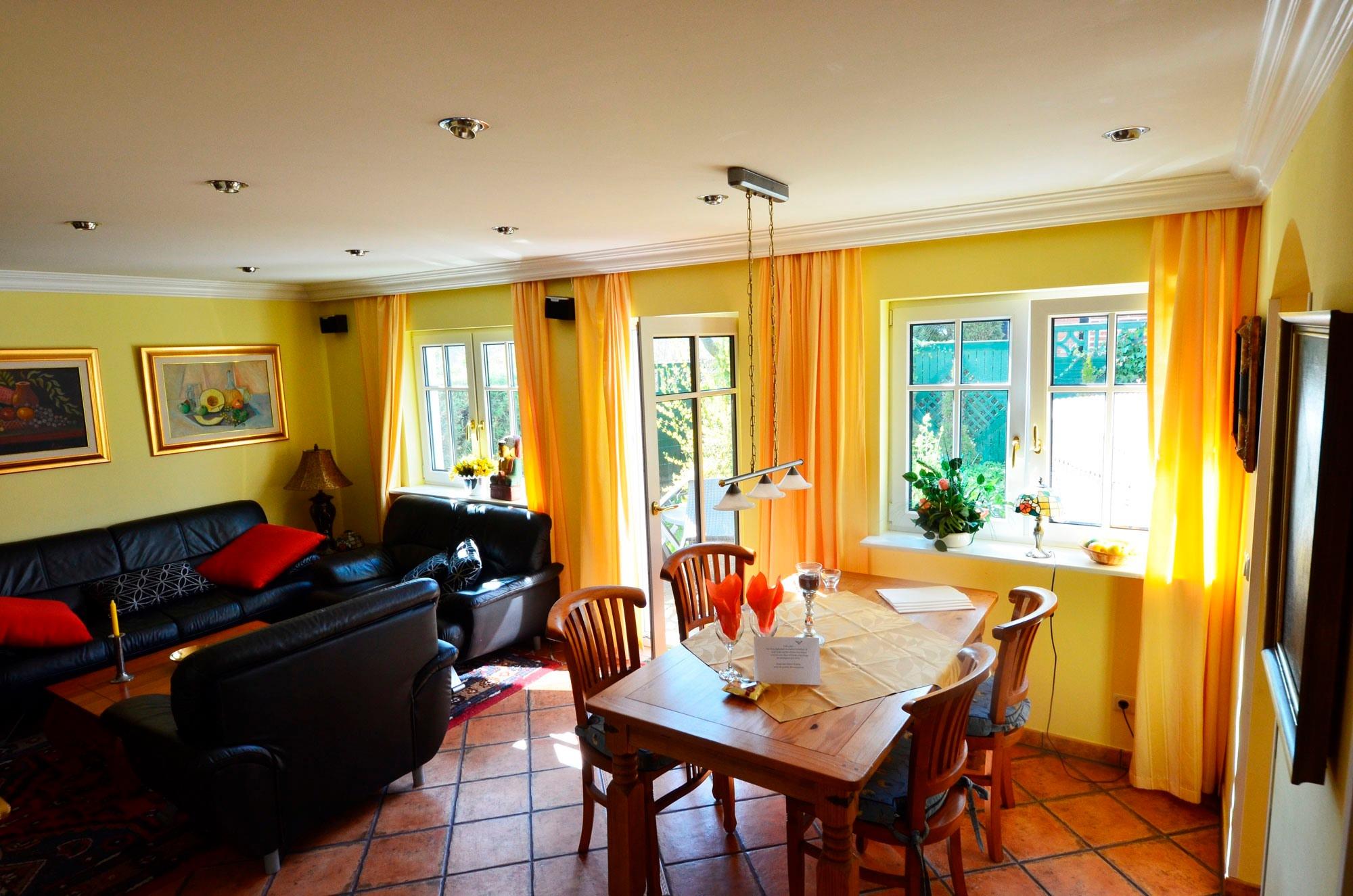 Gemütliches Wohn- Esszimmer mit Ausgang zur mit Pflanzen eingewachsenen Terrasse und Garten, Fußbodenheizung, Esstisch für 4 Personen, schöne Leder-Couch-Garnitur und Opiumtisch, 125cm-Flachbild - TV, Stereo/CD, Geschirrschrank, Telefontisch mit Telefon und balinesischem Spiegel, Kinderhochstuhl, Wände dekoriert mit Bildern.