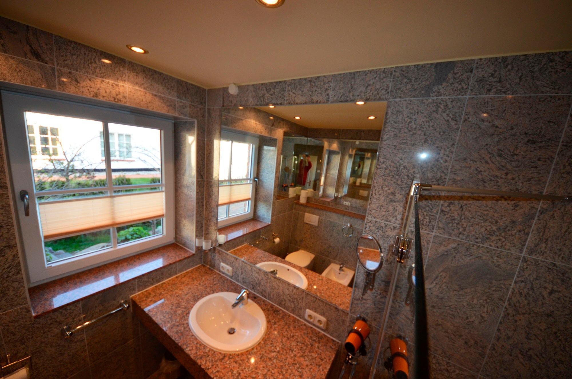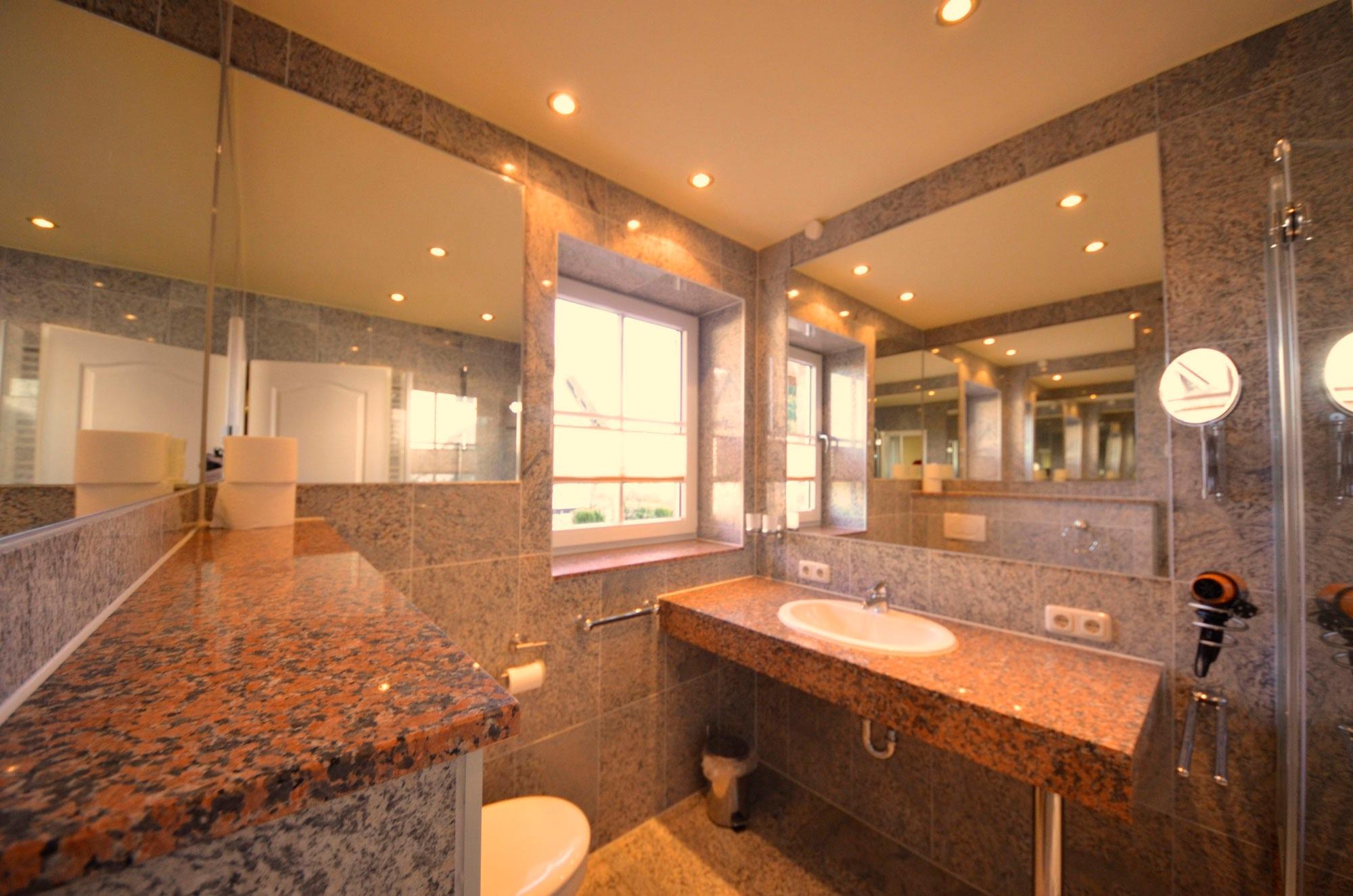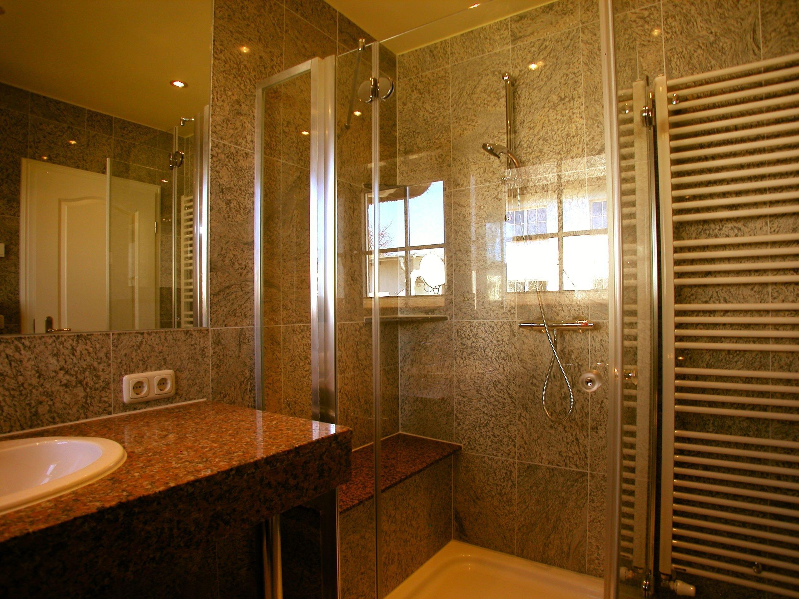 aus Granit, Fußbodenheizung, Granit-Abdeckungen, große Spiegel, schöne Sanitärausstattung, beheizbarer Handtuchhalter, Fön, Schminkspiegel, Glas-Dusche mit Sitzbank.