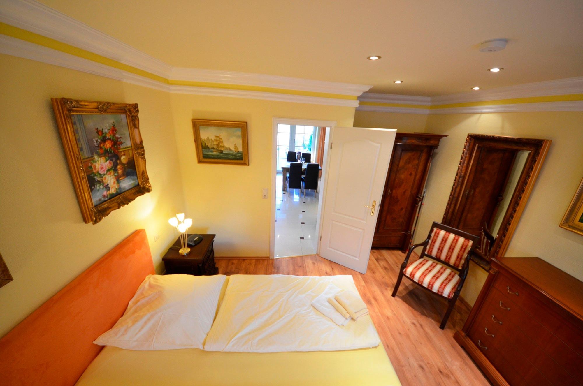 Doppel-Schlafzimmer mit Doppelbett 180x200 mit aufgezogener Bettwäsche.