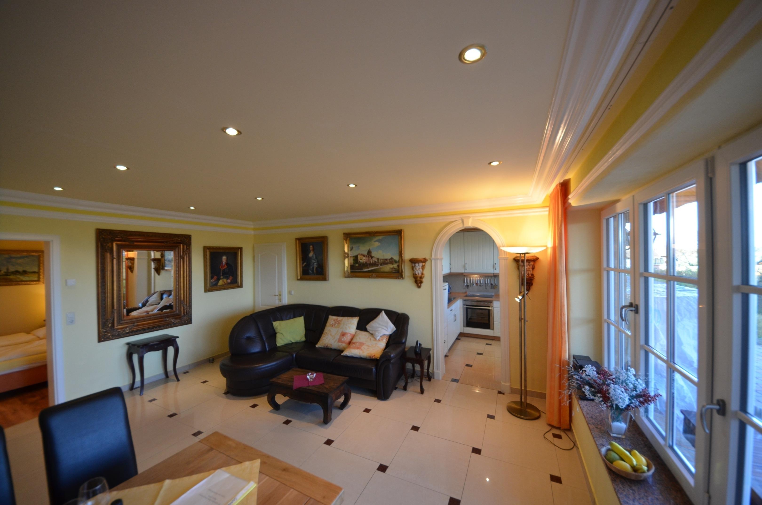 Großzügiges Wohn- Esszimmer, schöne Ledergarnitur mit Opiumtisch und Ausgang zur großen Terrasse. Direkter Blick auf die Ostsee, den kleinen Hafen von Groß Zicker und die gegenüber der Bucht liegenden Orte Thiessow und Klein Zicker.