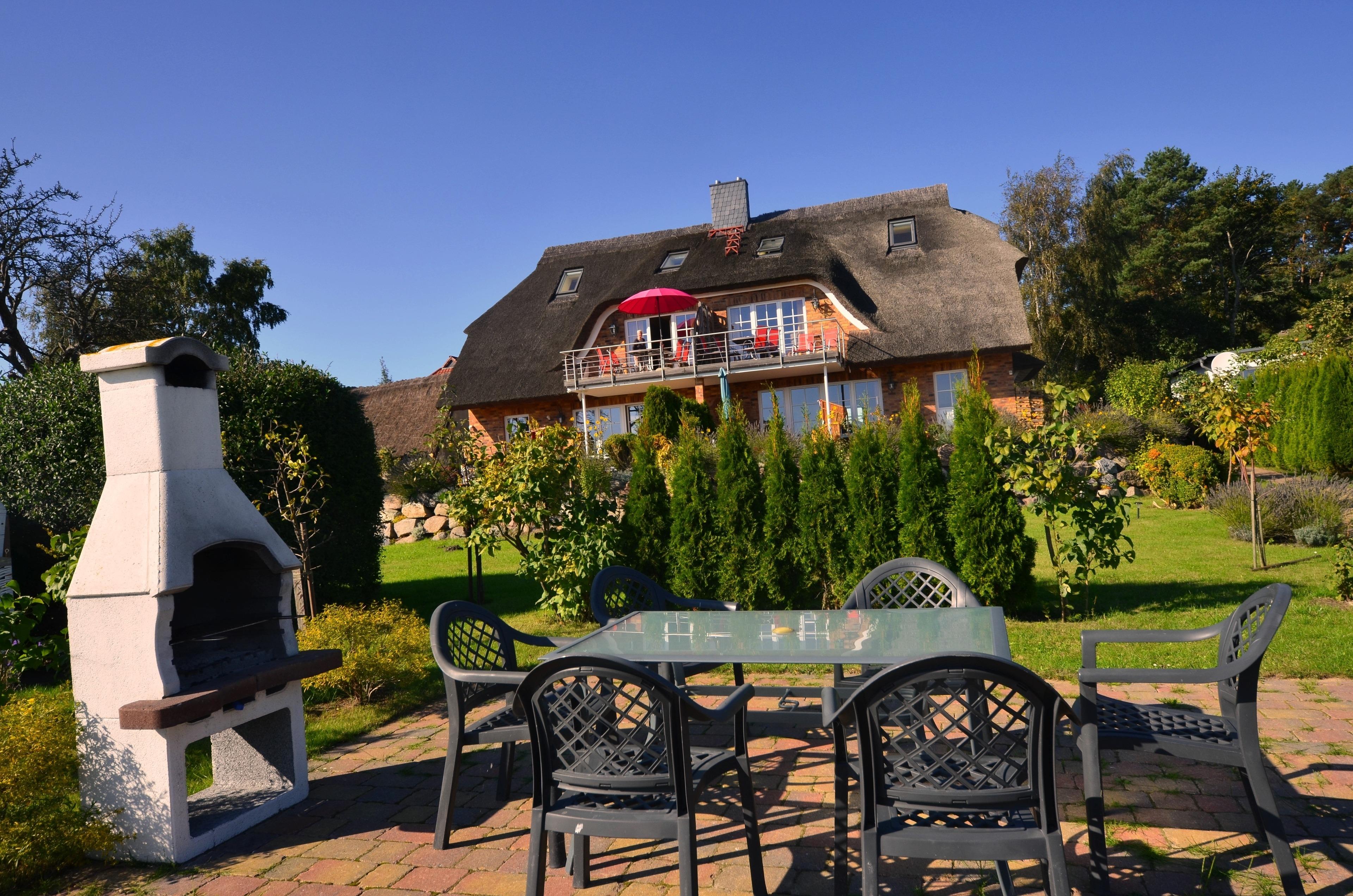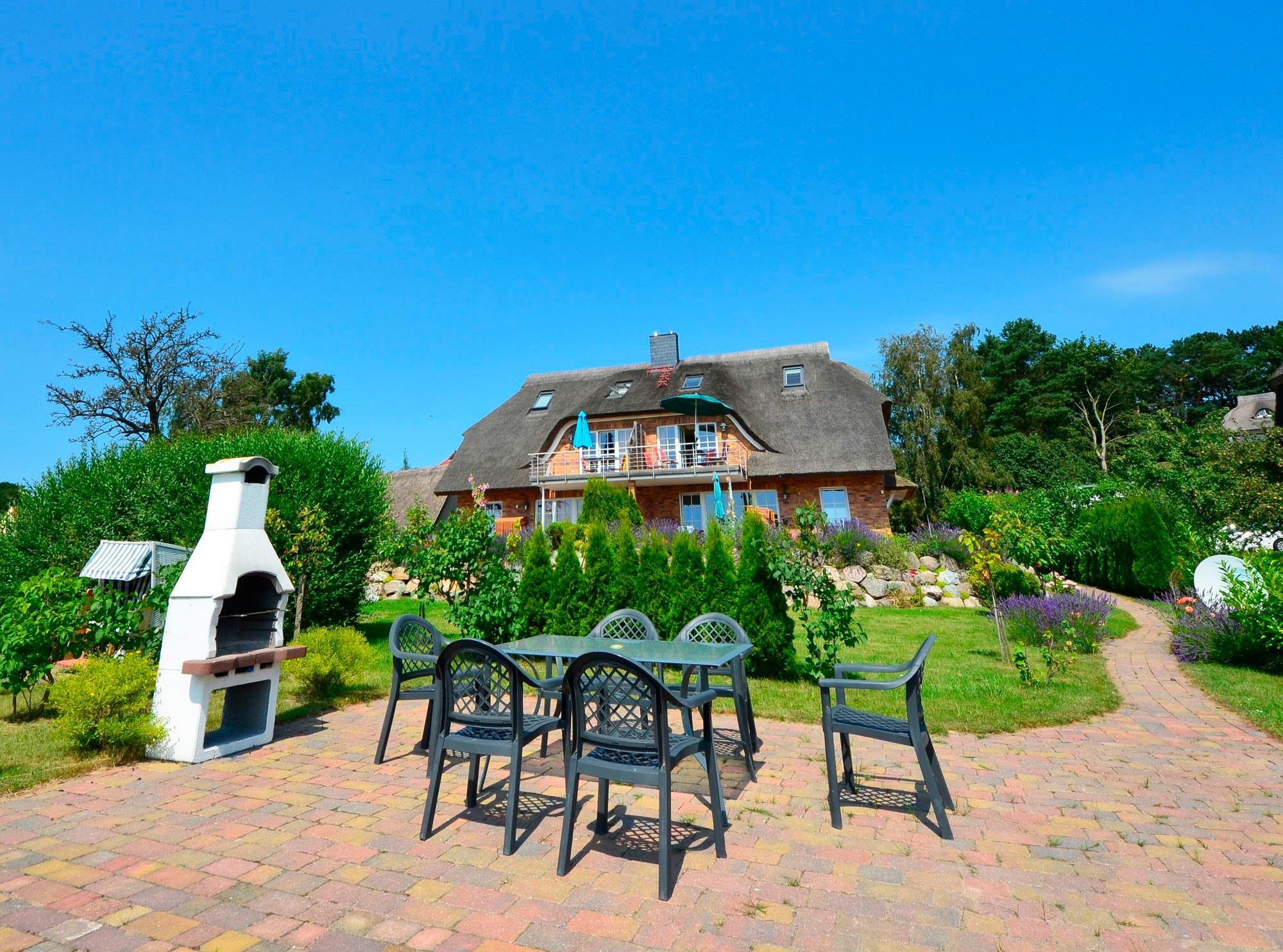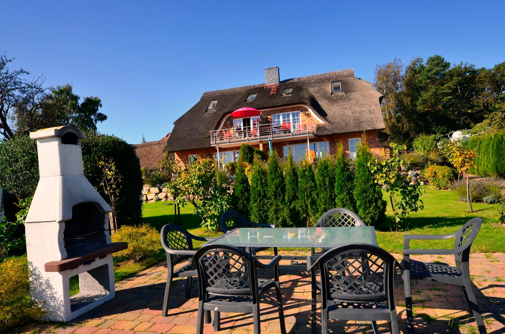 Ferienwohnung "Sonnenkliff" im Obergeschoß der 2008 neu errichteten reetgedeckten und verklinkerten Doppelhaushälfte in Groß Zicker/Halbinsel Mönchgut auf Rügen, Boddenstr. 8a.