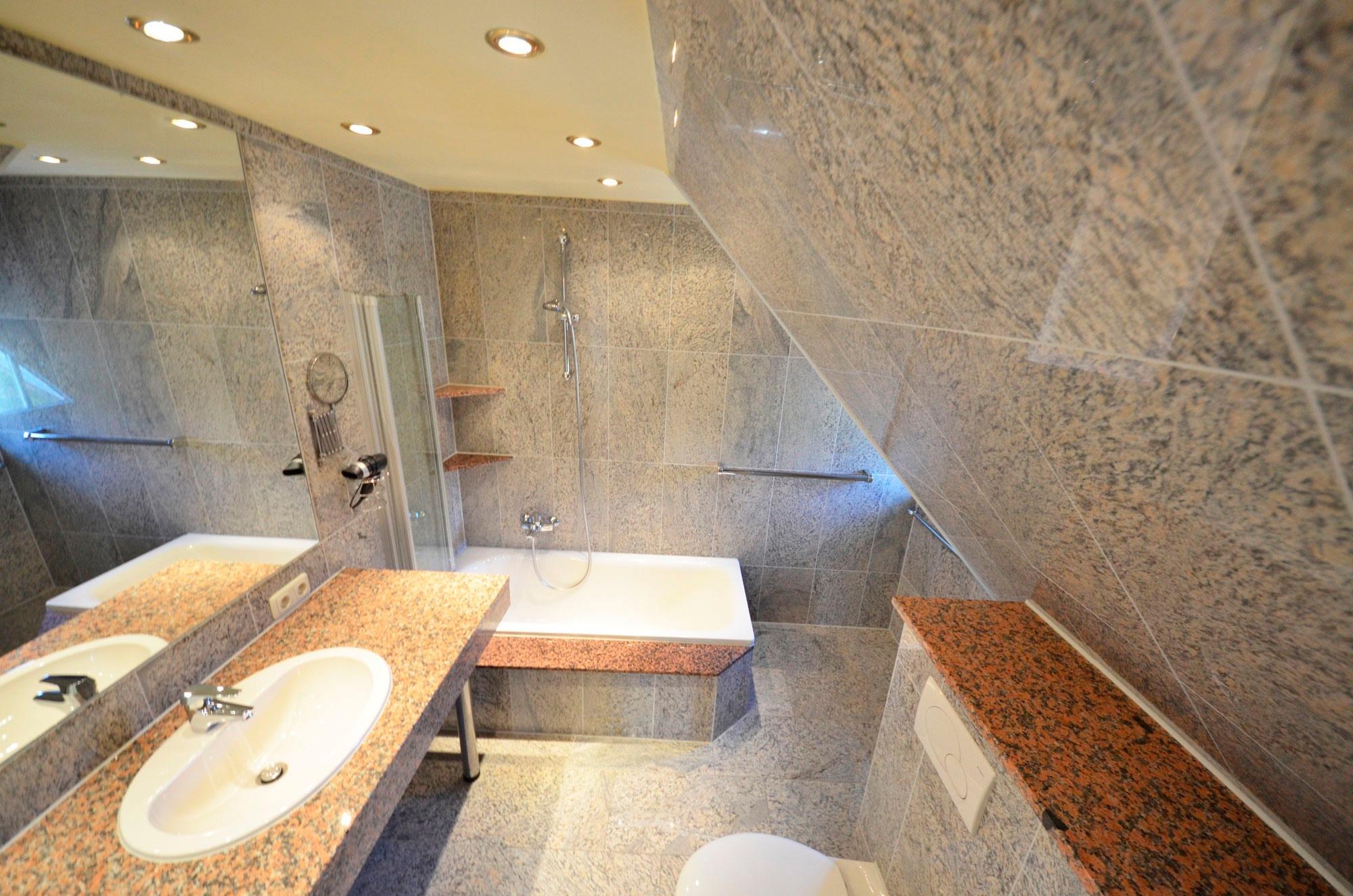 1x Badewanne mit Glas-Duschabtrennung, Toilette und Bidet, 1 x Duschbad, Granitverkleidung, Fußbodenheizung, Granit-Abdeckungen, große Spiegel, schöne