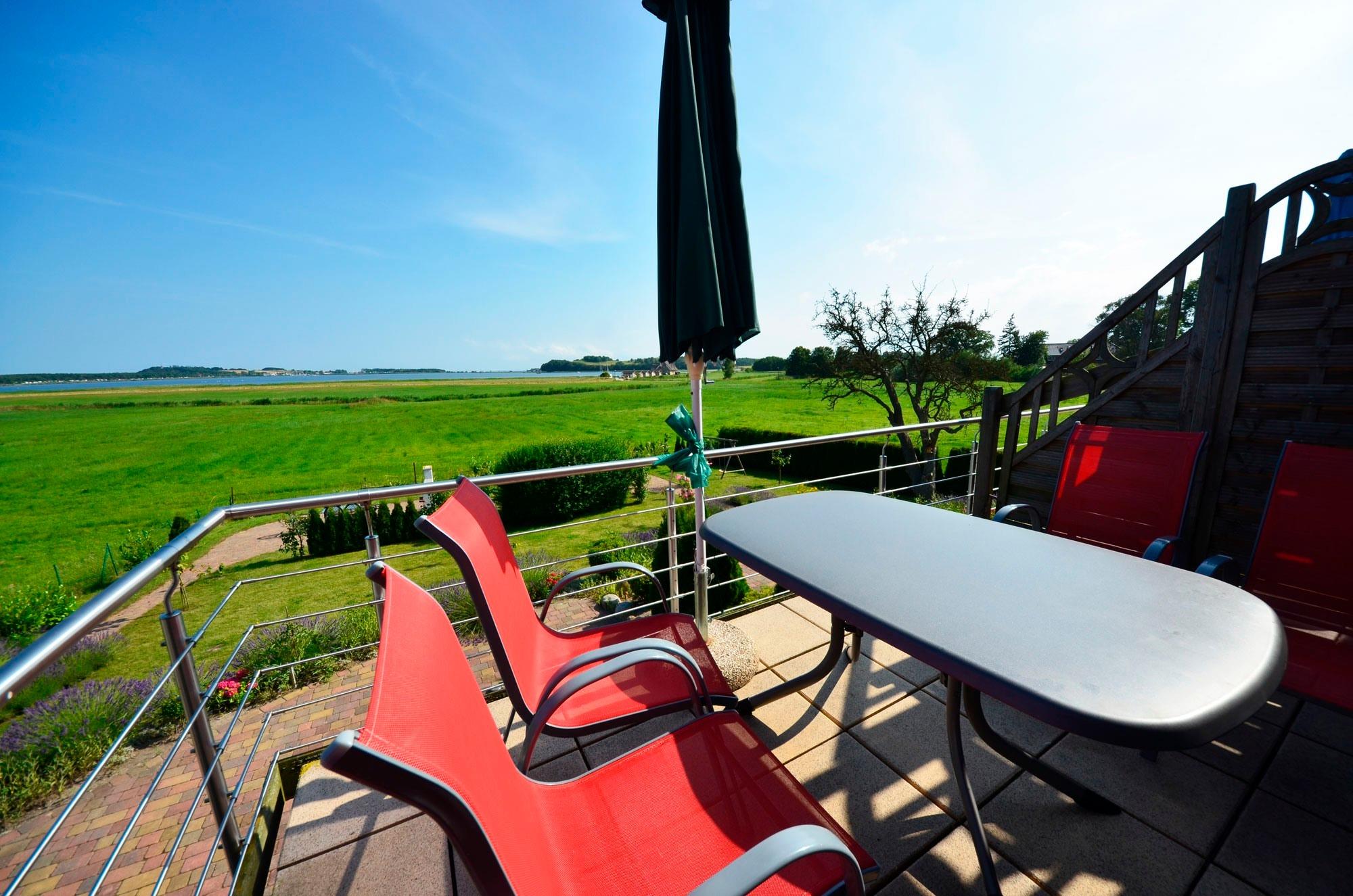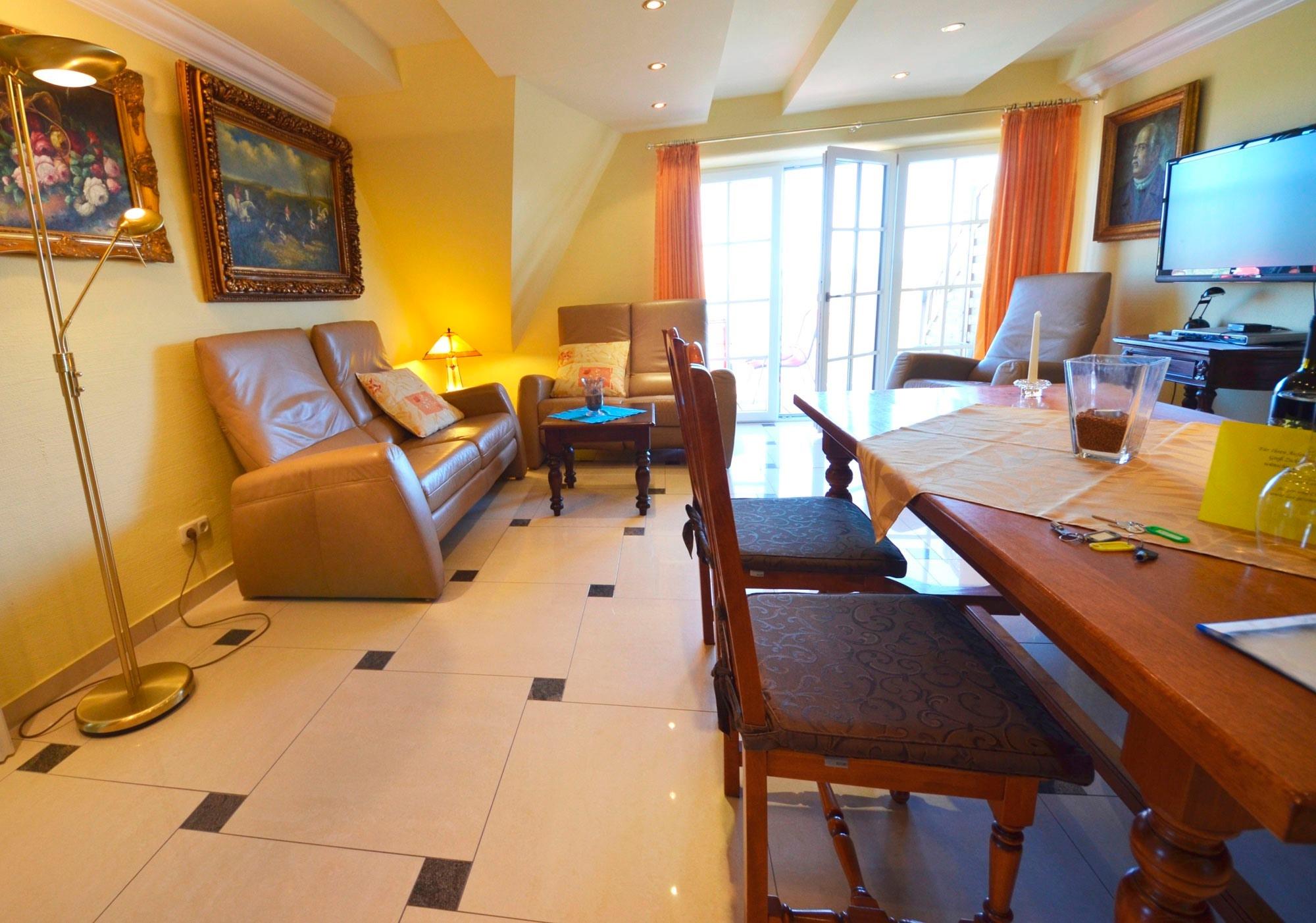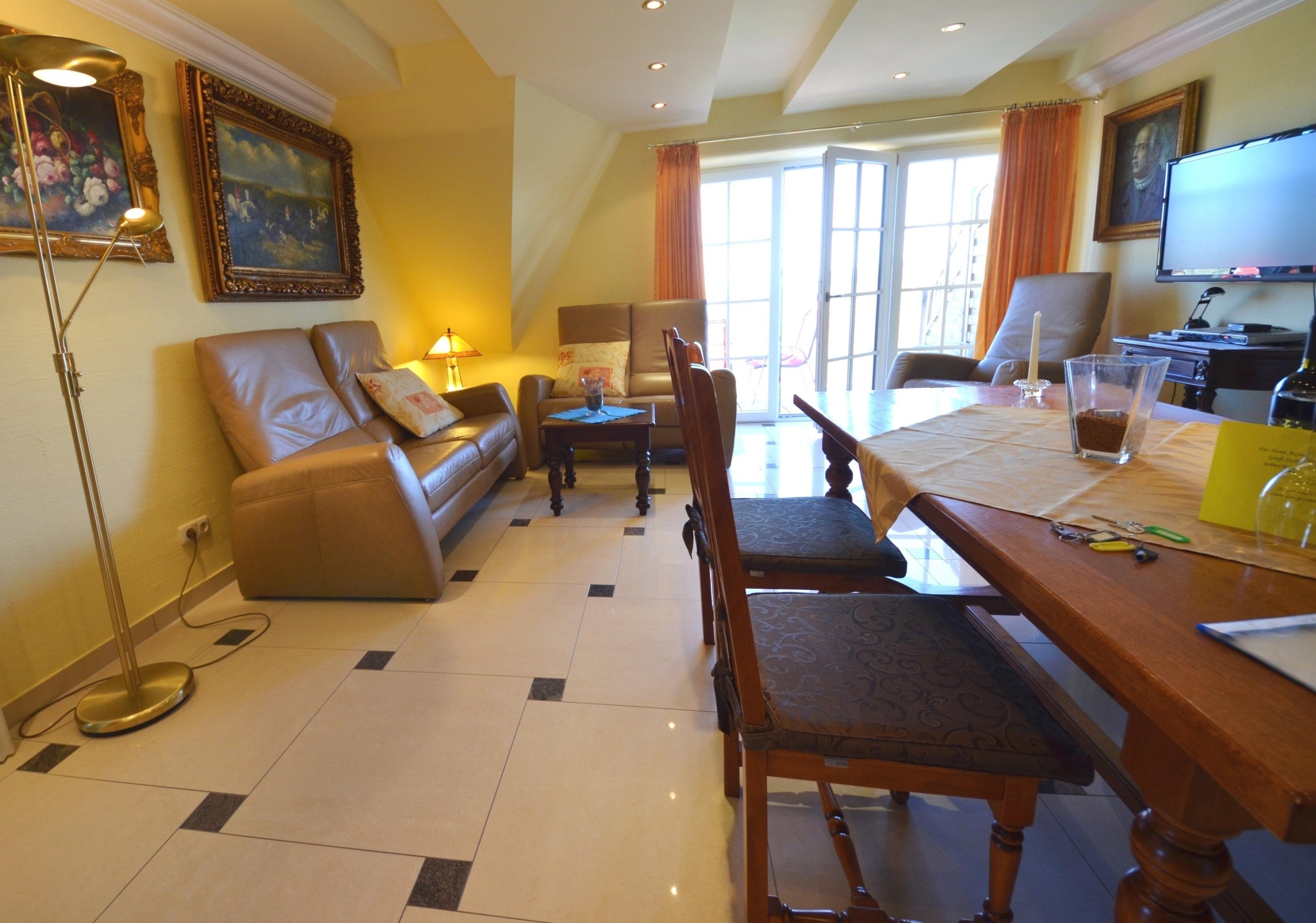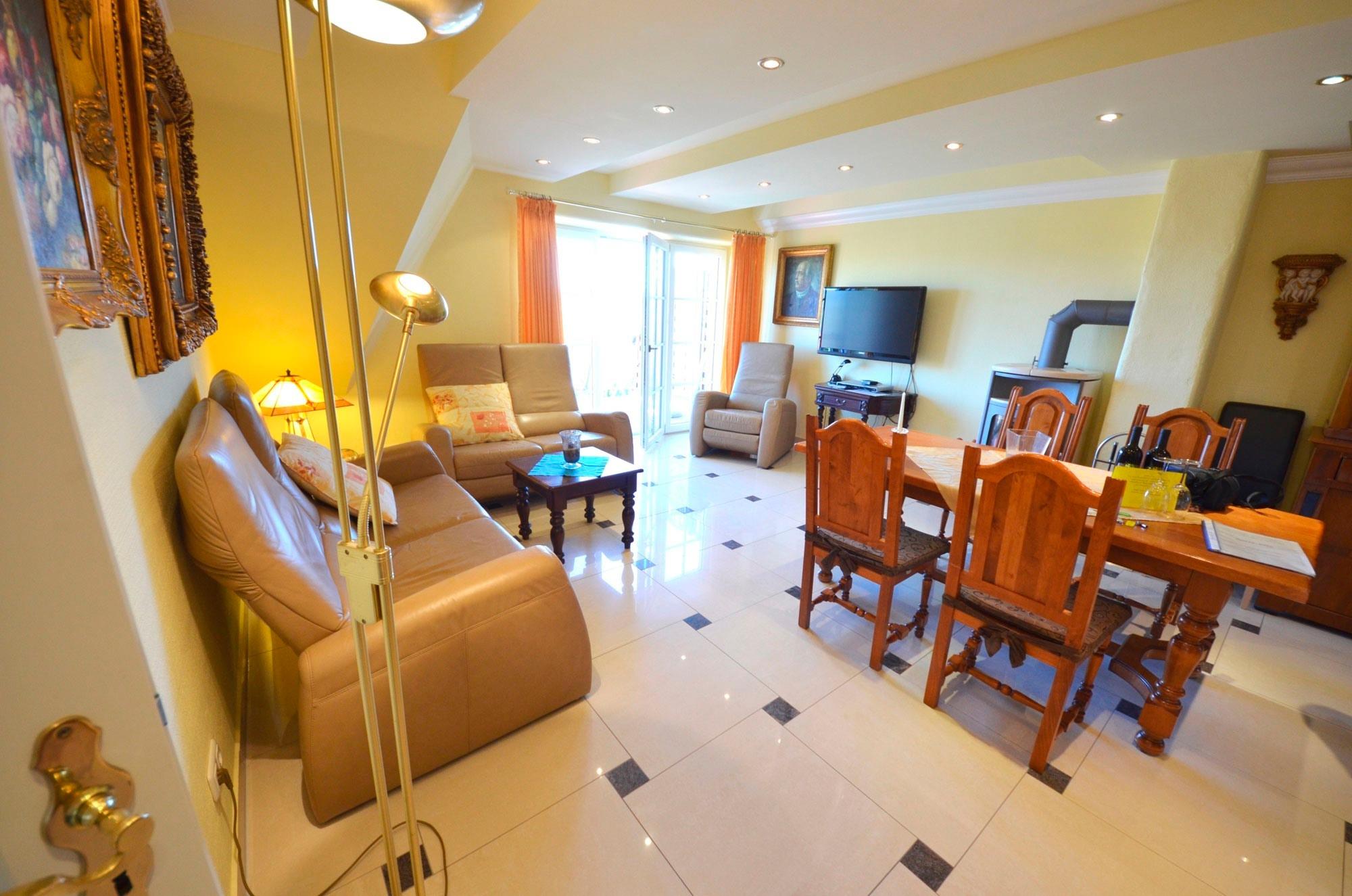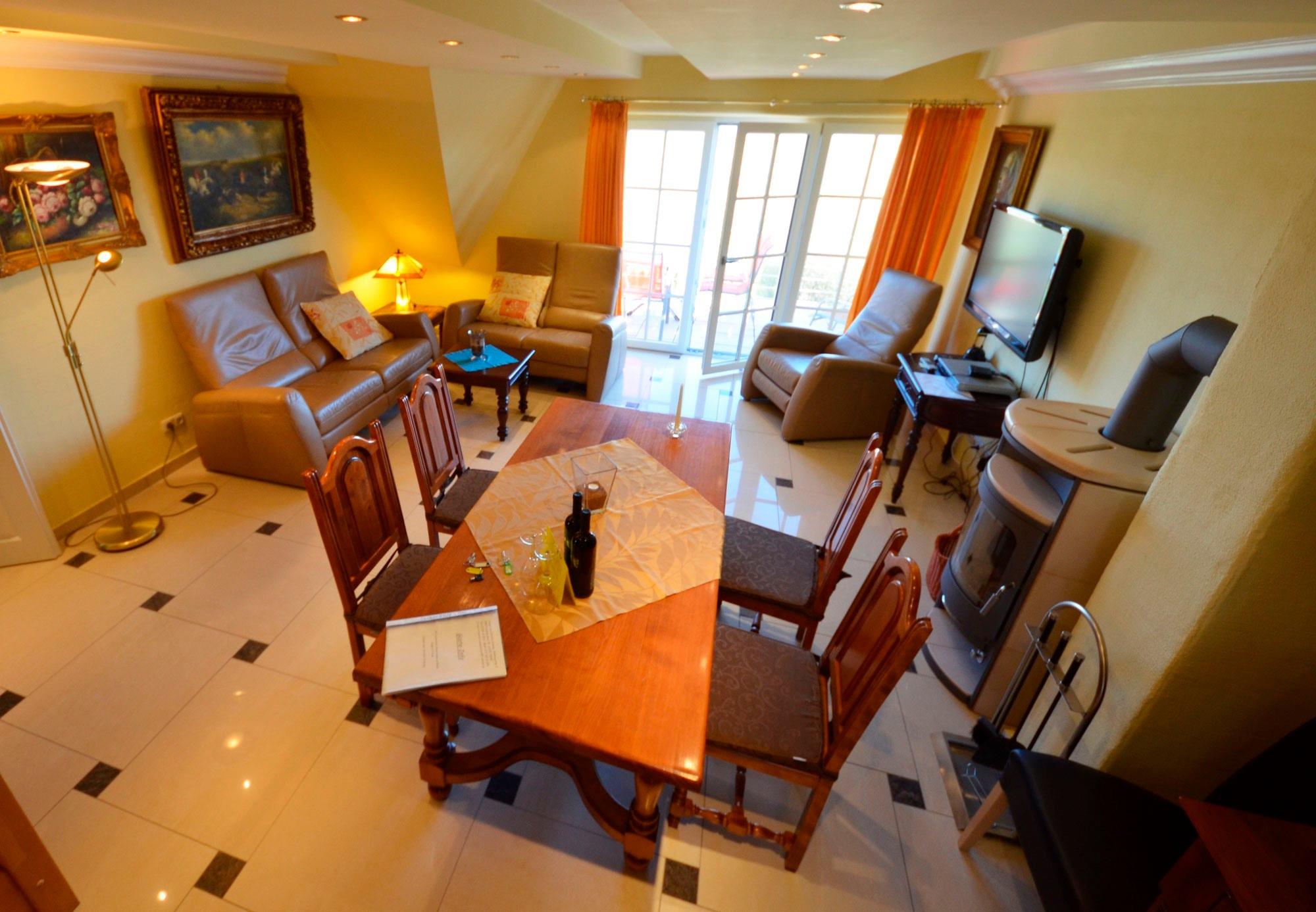 Großzügiges Wohn-Esszimmer mit Ausgang zum großen Balkon mit direktem traumhaften Blick auf die Ostsee, den kleinen Hafen von Groß Zicker und die gegenüber der Bucht liegenden Orte Thiessow und Klein Zicker. Schöne Ledergarnitur mit Opiumtisch. Speisetafel mit 6 Stühlen, großer Hark-Kaminofen, antike Vitrinen, kleine Bücherauswahl, Plasma-TV mit 125 cm Großbild, Fußbodenheizung, DVD-Recorder, Stereoanlage, CD-Player, Kinderhochstuhl, Wände dekoriert mit Spiegeln und Gemälden, sehr ansprechende Beleuchtung