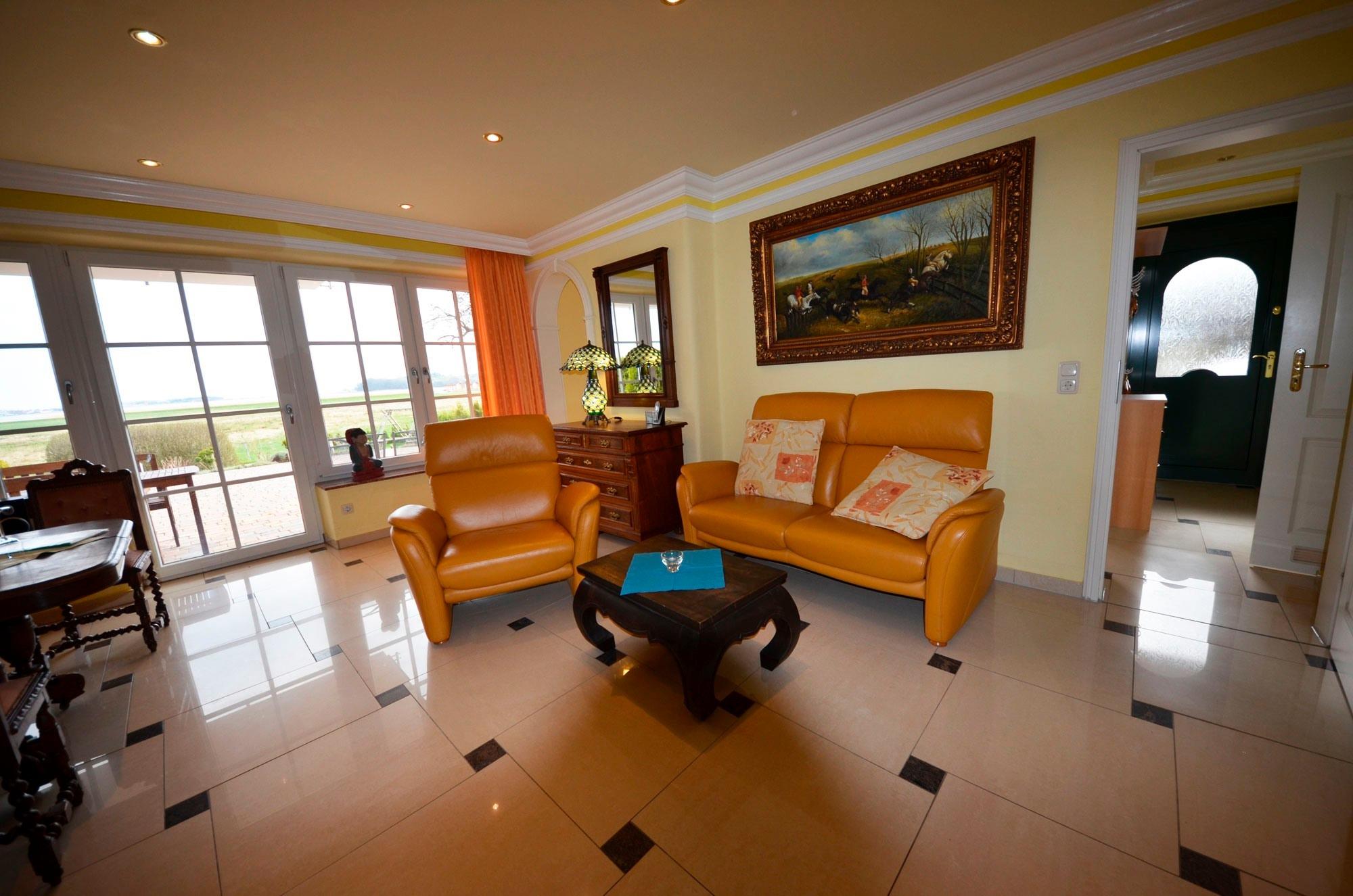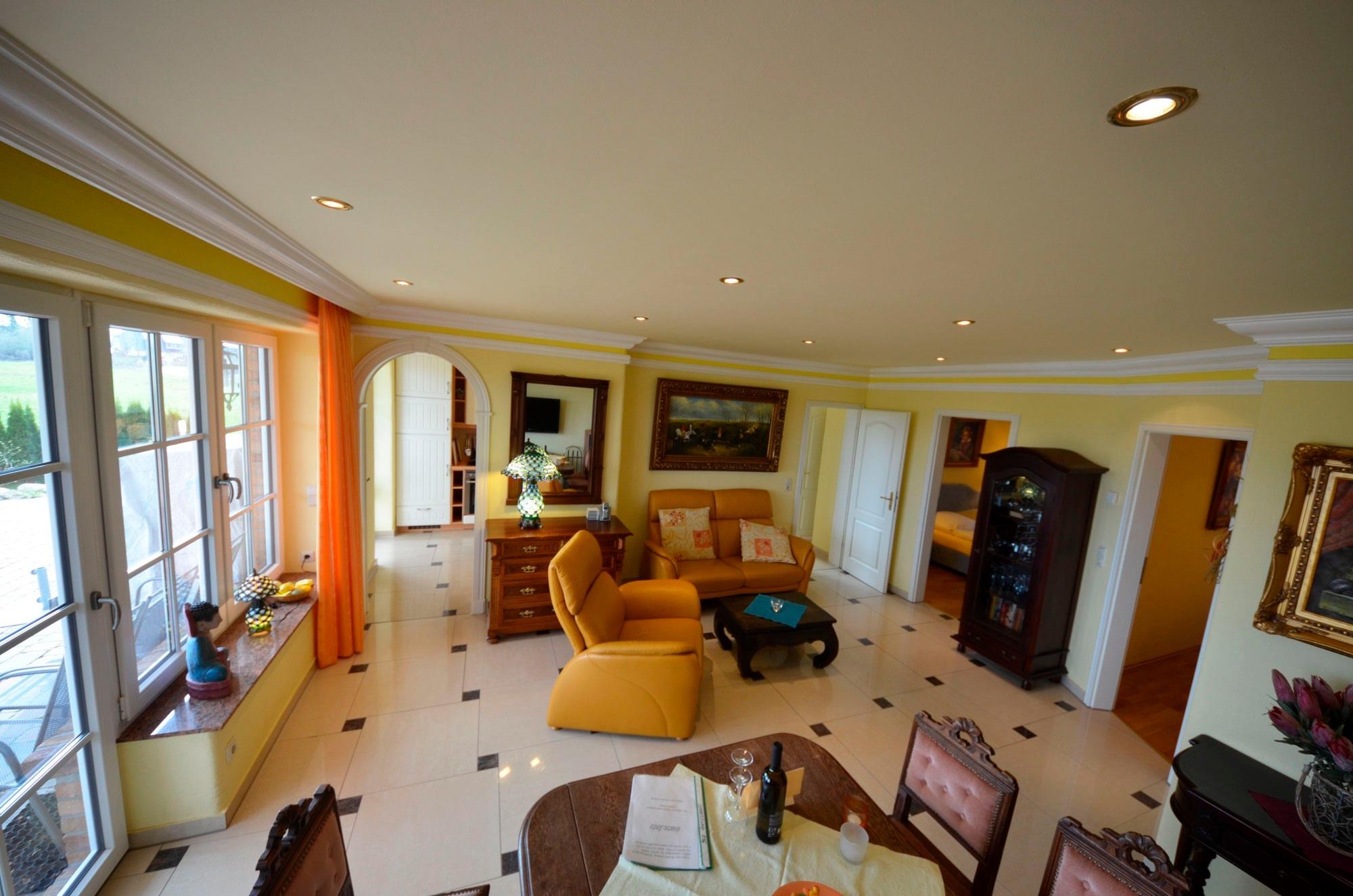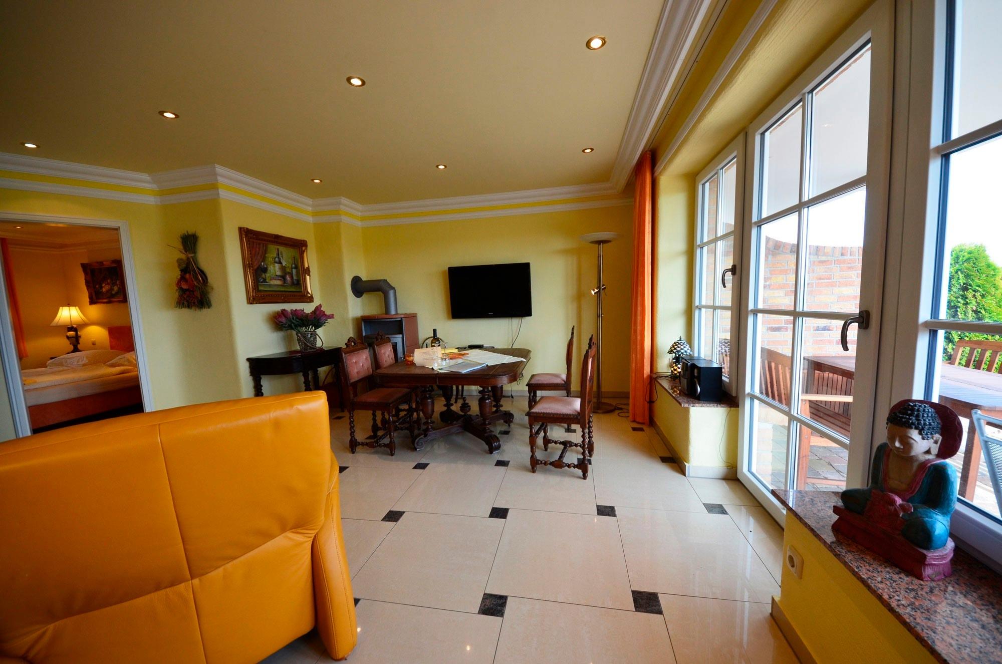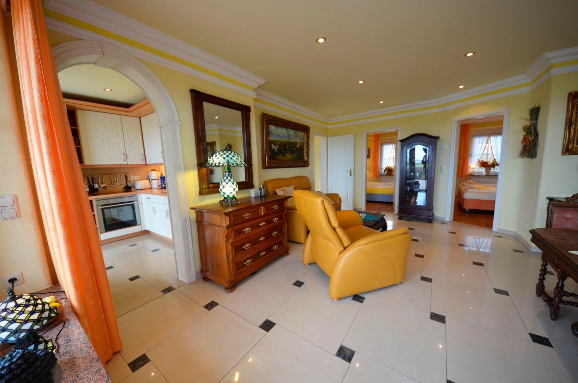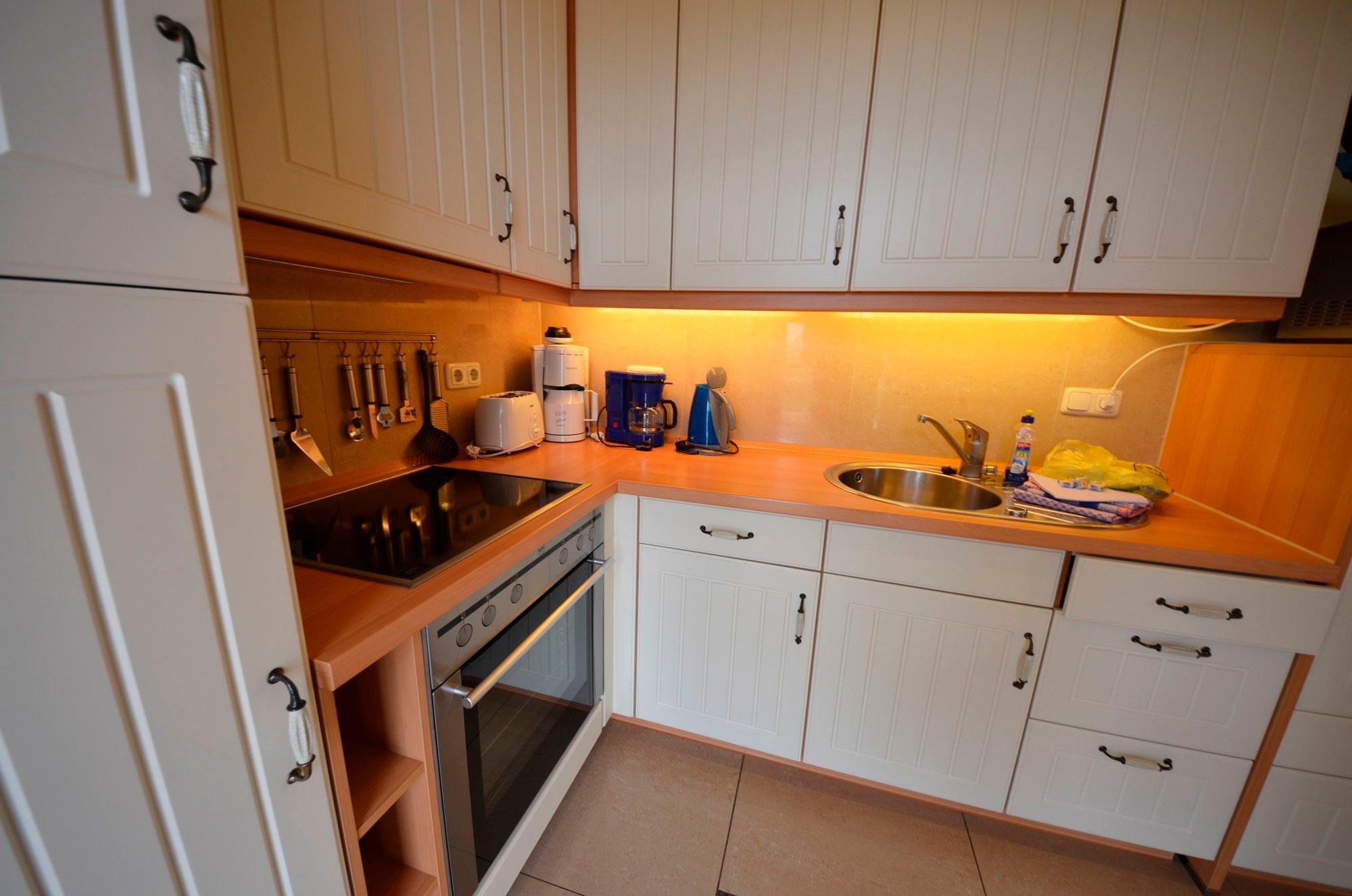 mit Ausgang zur großen Terrasse, schöne moderne Landhaus-Einbauküche in vanillegelb, Geschirrspüler höher gelegt, Mikrowelle, Herd mit Ceran-Kochfeld und Backofen, Turmhaube, Kühlschrank mit 38Ltr. Gefrierteil. 2 Kaffeemaschinen, Wasserkocher, Eierkocher, Toaster, Waffeleisen, Mixer, ausreichend Edelstahl-Töpfe Schnellkochtopf, Gewürze usw. sehr schönes Geschirr, Auswahl an Gläsern (ca. 50Stk.)