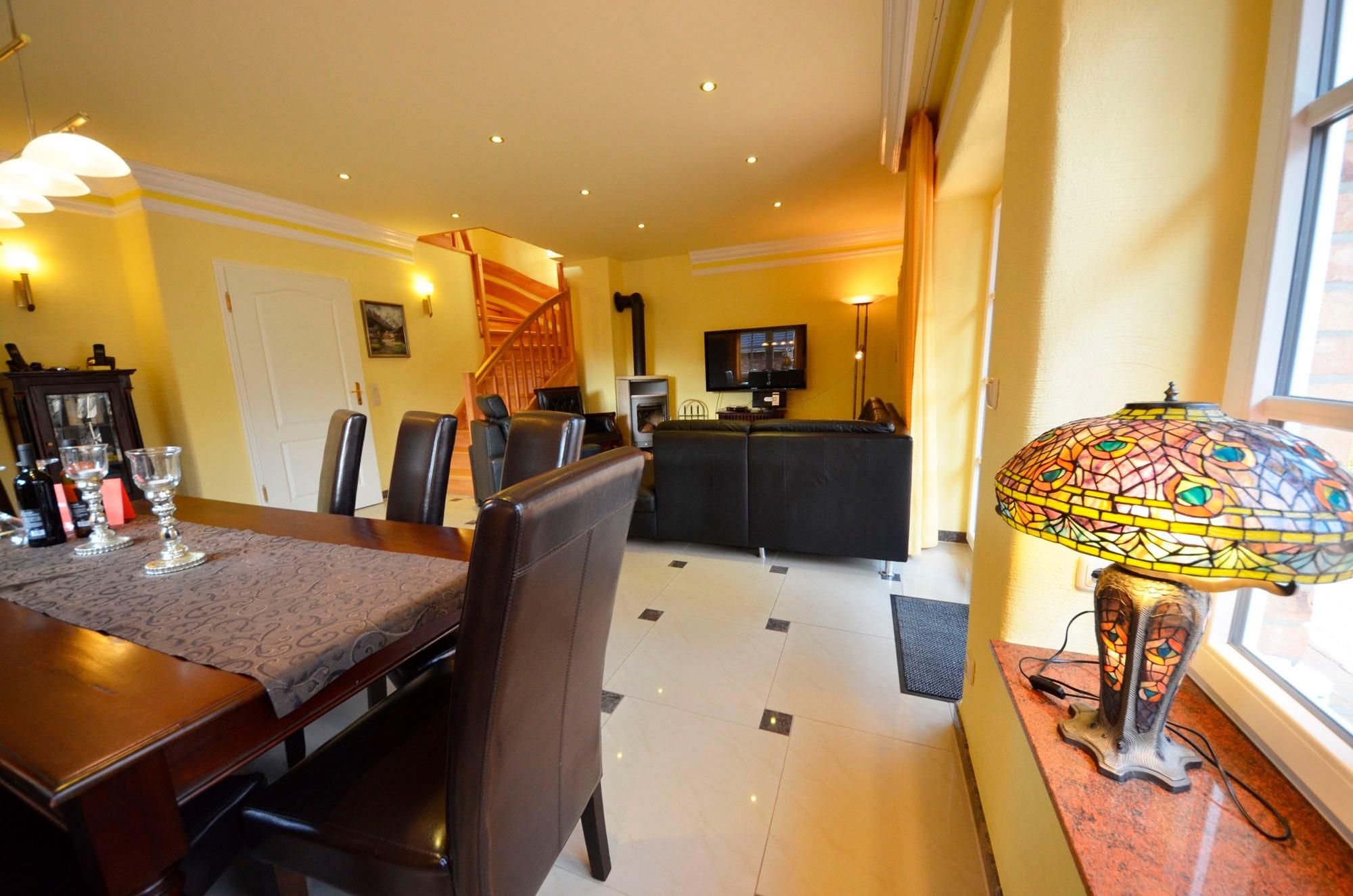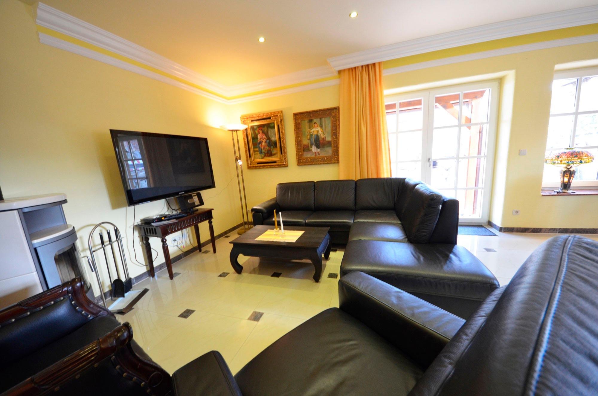 Solar - Fußbodenheizung, großzügiges Wohn- Esszimmer mit Ausgang zur großen Terrasse, schöne Leder-Couchgarnitur mit Opiumtisch, rustikale Speisetafel mit 8 Stühlen, großer Hark-Kaminofen, Holz ist kostenlos und am Haus gestapelt. Antiker Geschirrschrank, SAT-Plasma-Flach-TV mit 50 Zoll = 127cm Großbild, Video-Recorder, Stereoanlage, CD - Player, Kinderhochstuhl, Wände dekoriert mit Bildern, sehr dekorative Beleuchtung.