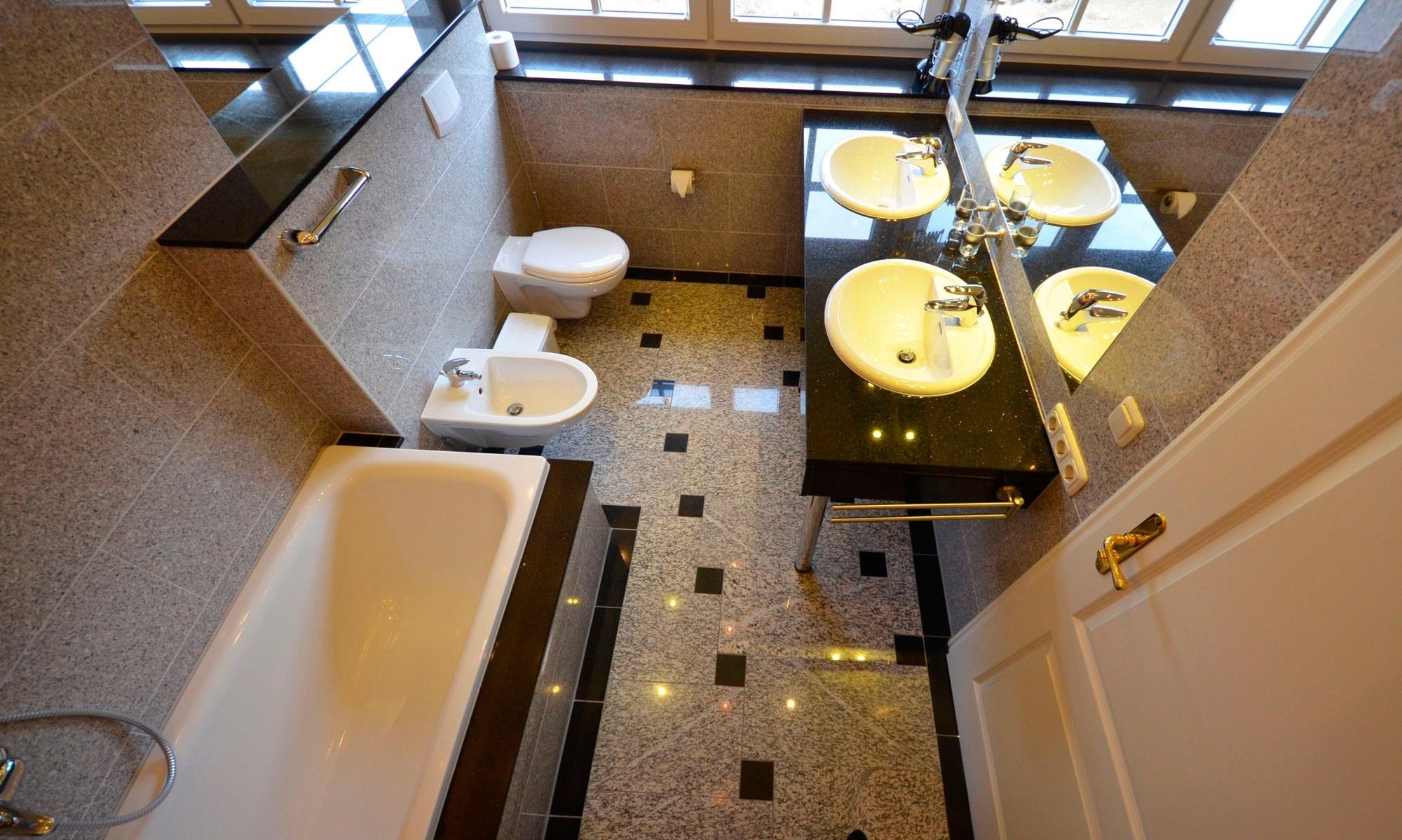 1 Bad im EG, 2 Bäder im OG und 1 Bad im Dachgeschoß. Fußbodenheizung im EG u. OG, Granitabdeckungen und Granitwandverkleidungen. Alle Waschtischabdeckungen aus schwarzem Granit "Star Galaxy". Große Spiegel, 2 Bäder mit walk-in-Duschen 100 x 140 - 160cm und 2 x mit Bidet. Alle Bäder mit Außenfenstern, beheizbaren Handtuchhaltern, Föhn, Schminkspiegel , schöne Sanitärausstattung in Pergamon. Teilweise Massage-Duschbatterie. Teilweise Sitzgelegenheiten in den großen Duschen, 1x Wanne mit Duschabtrennung.