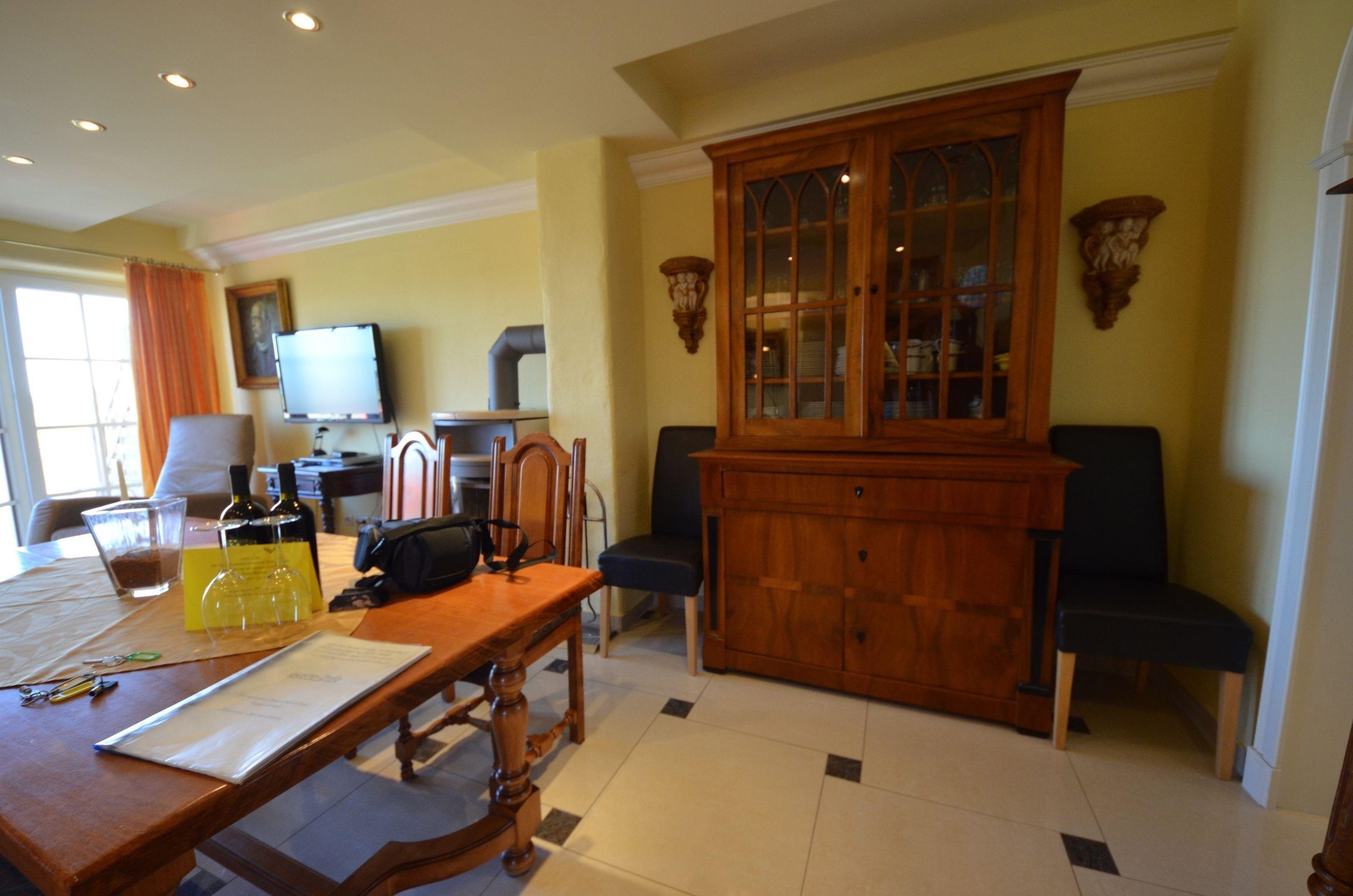 Speisetafel mit 6 Stühlen, großer Hark-Kaminofen, antiker Geschirrschrank und Kommode,
